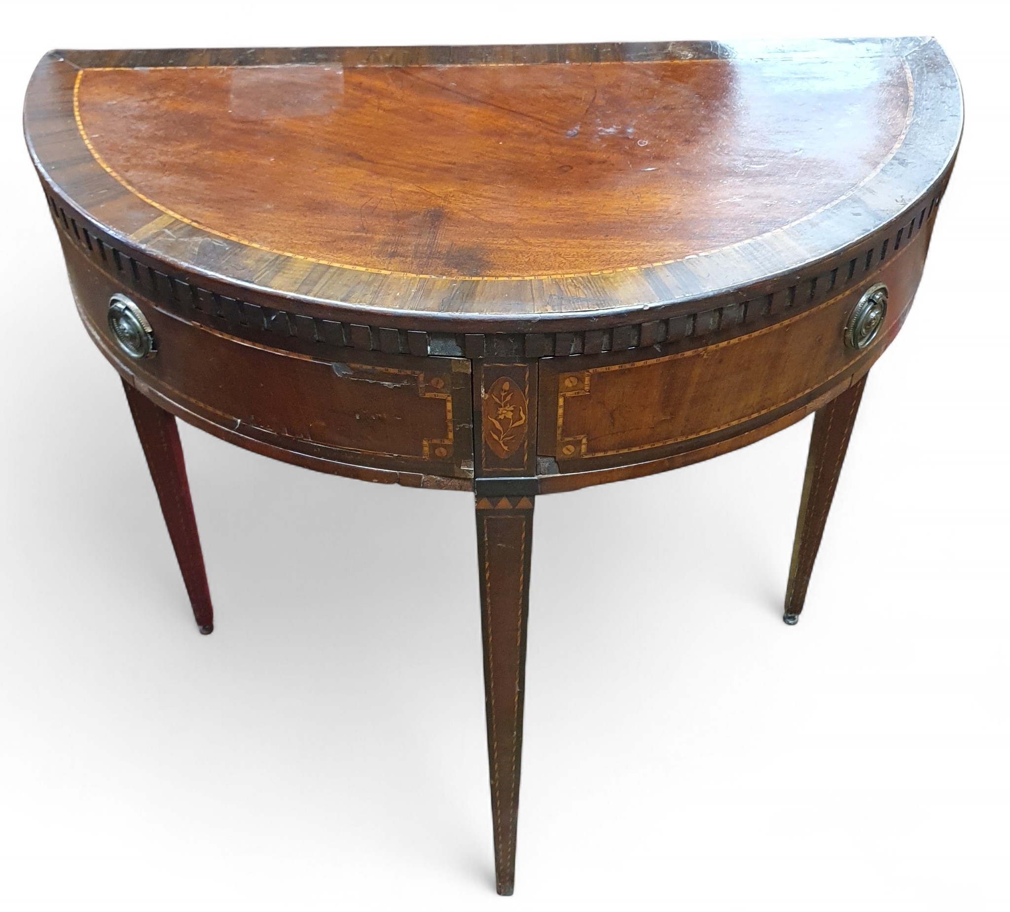 An early 19th Century Mahogany and Inlaid Side Table of unusual form with drawered front on square tapered supports.