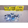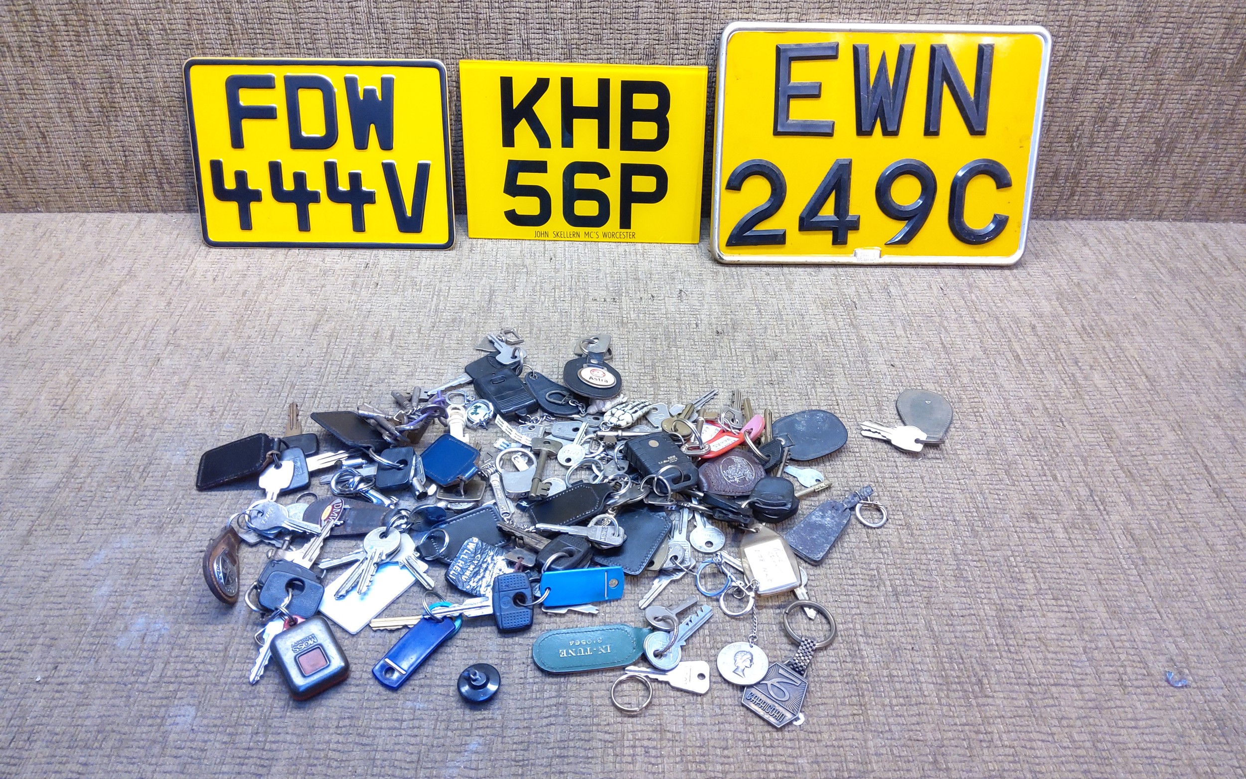 Collection of vintage car badge key rings, two vintage number plates and keys.