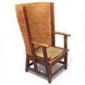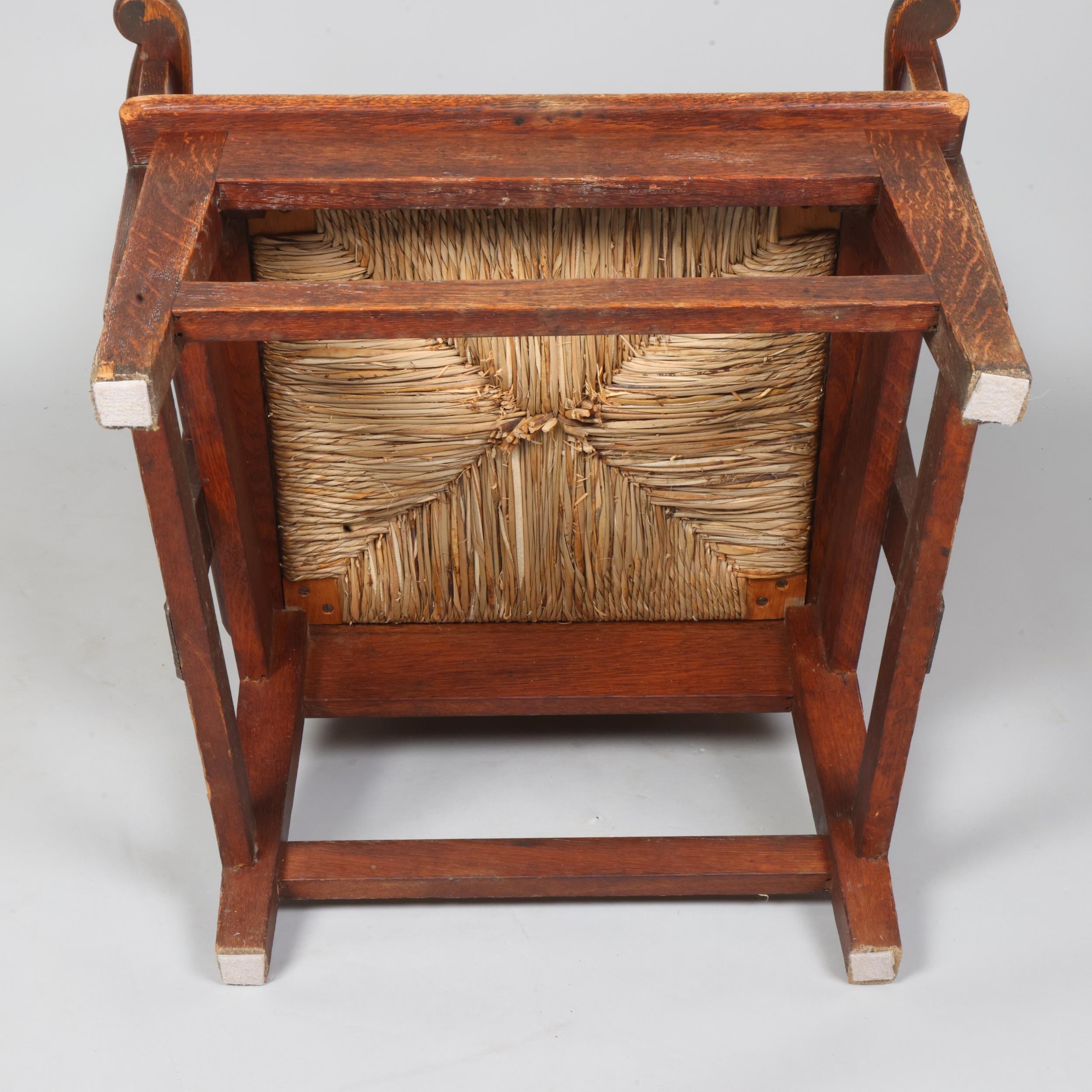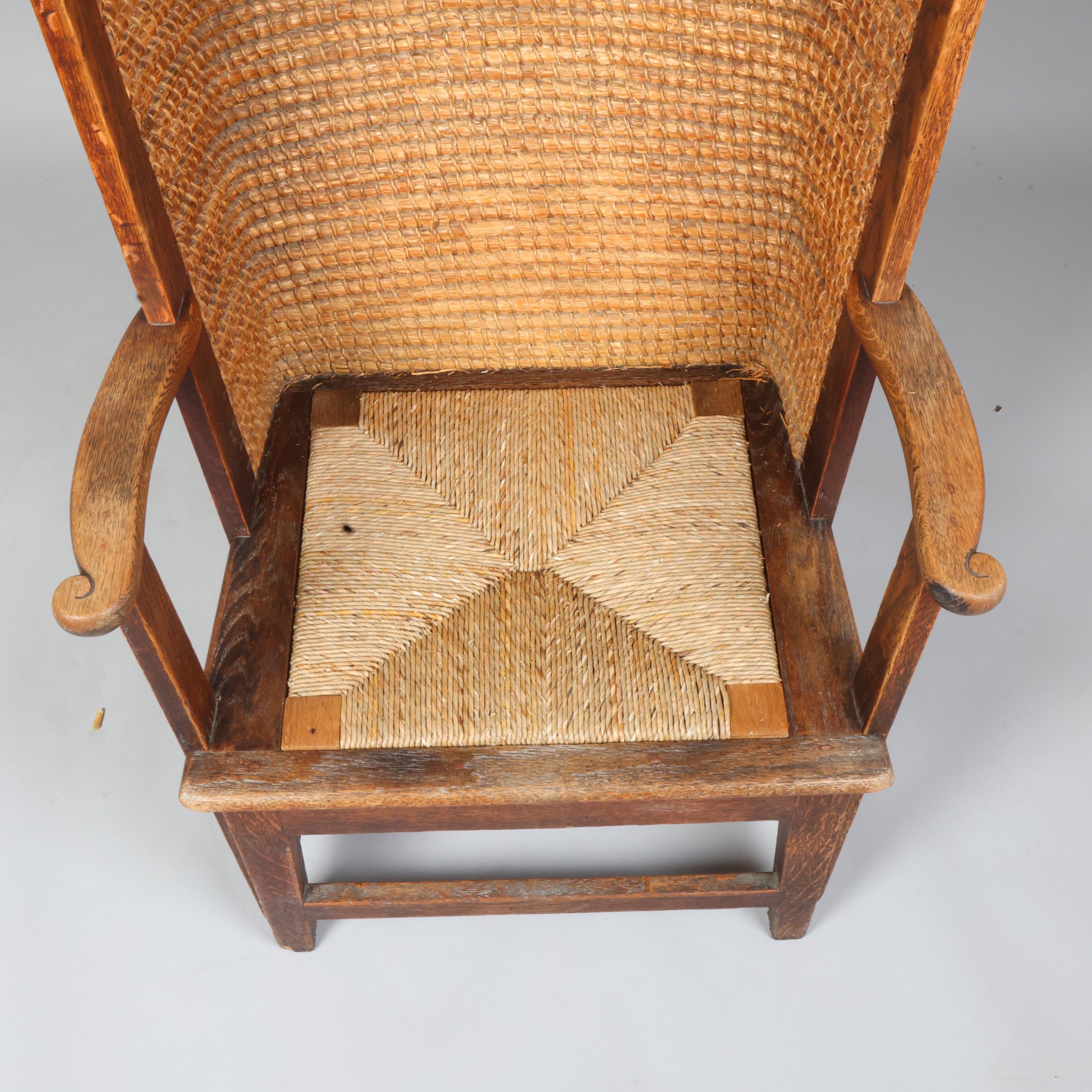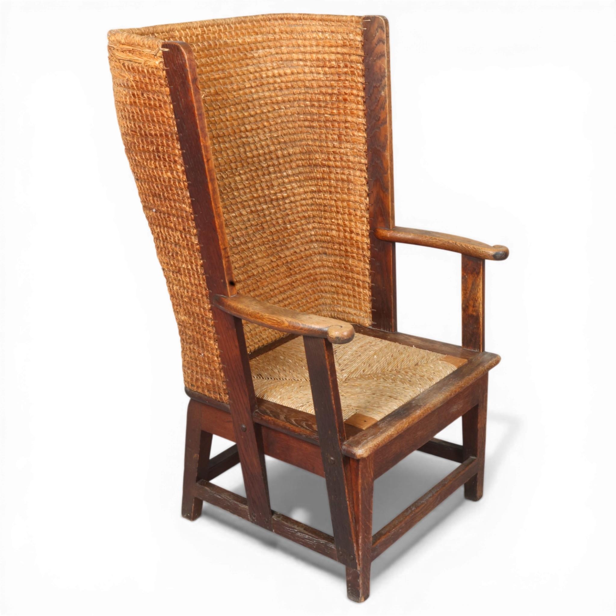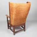 An oak framed Orkney chair, having scrolled arms with wicker back and rush seat, height 99cm, height to seat 33cm