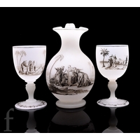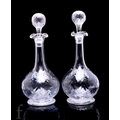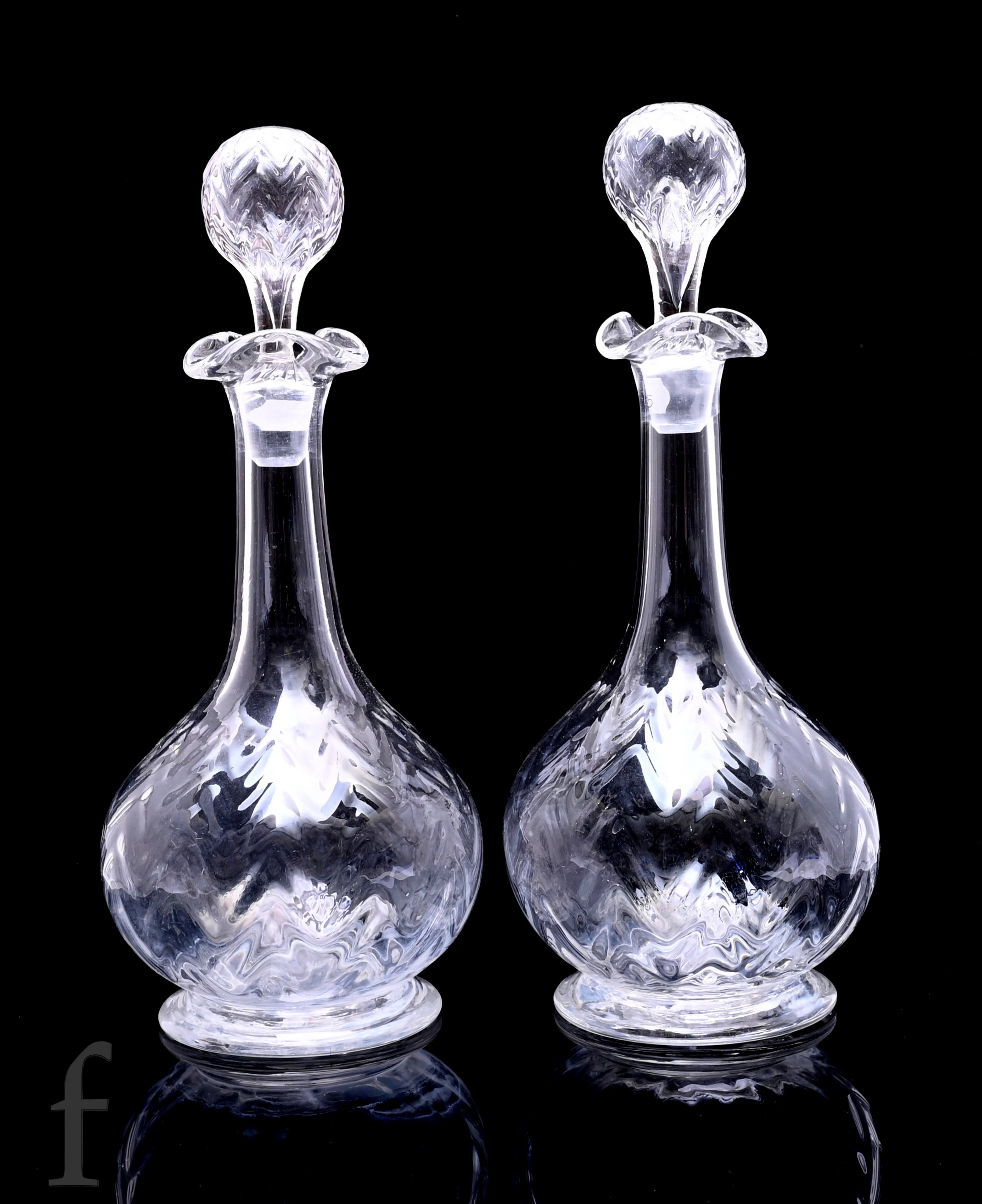 A pair of early 20th Century Thomas Webb & Sons crystal glass decanters in the Ribonnette pattern circa 1920 to 1930, the footed globe and shaft body with tri form neck, molded with horizontal chevron bands with matched decoration to the stopper, height 31cm. (2)