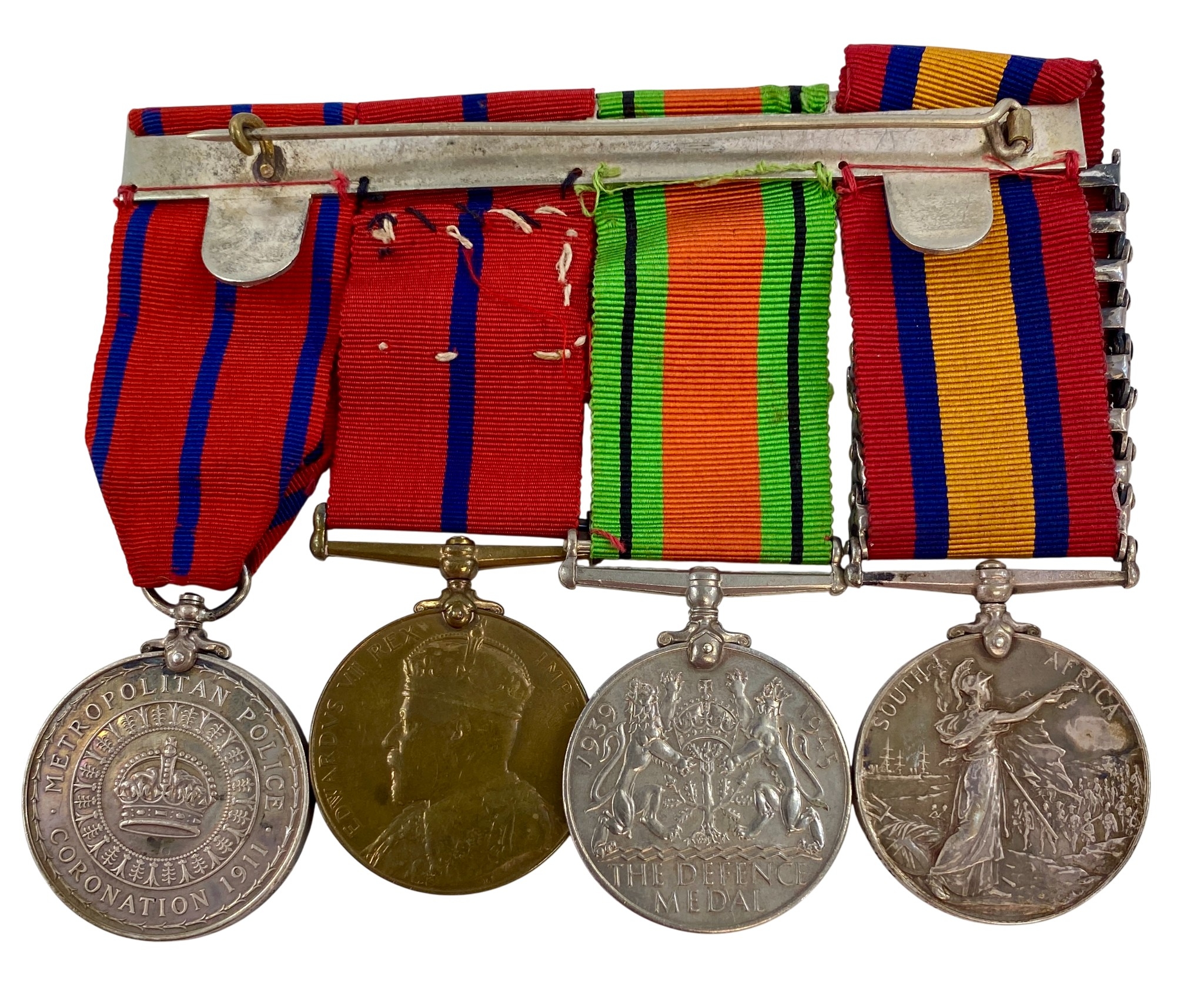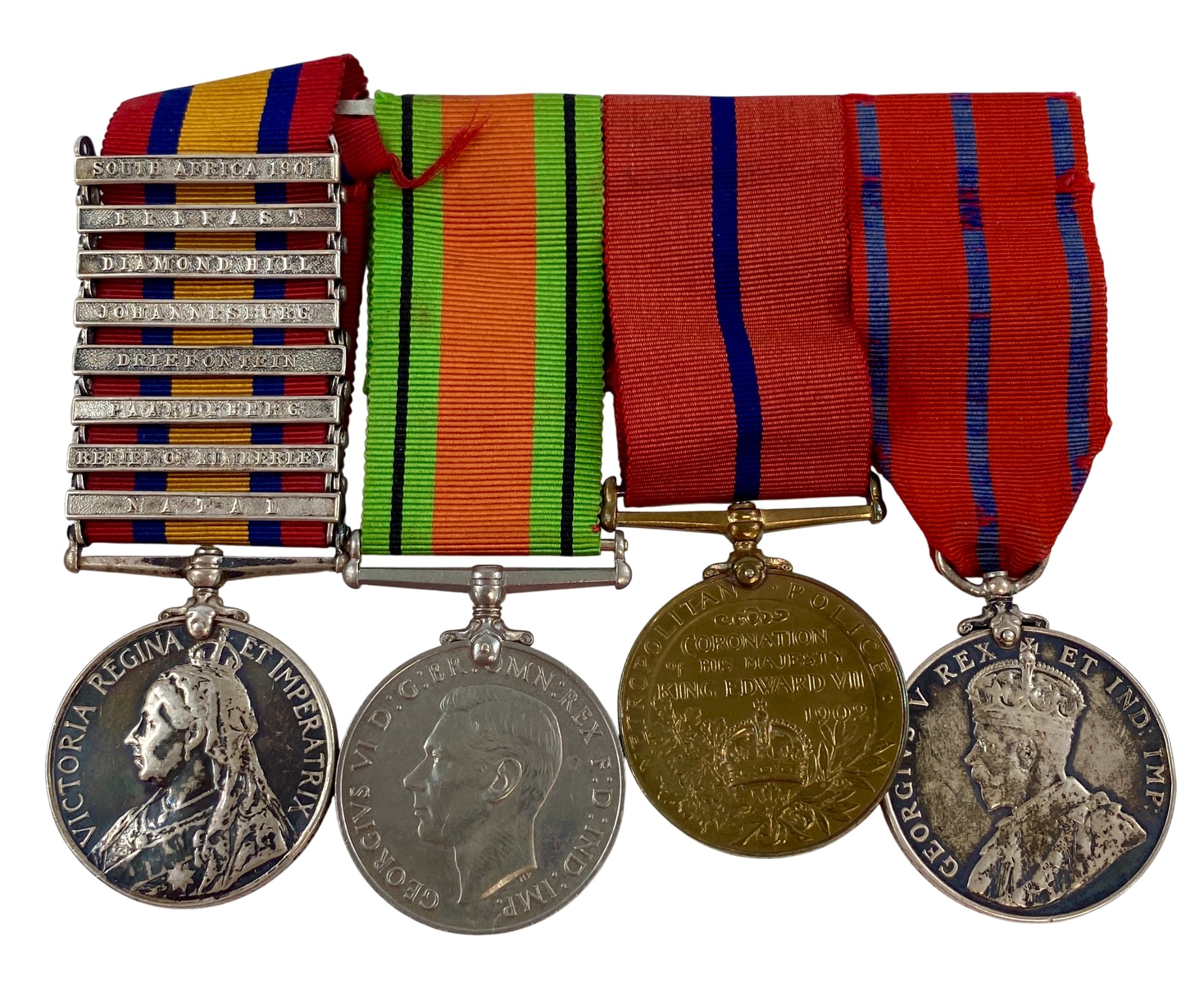 South Africa Victoria Boar war medal with 8 Bars, awarded to 79623 col H.W. Medwell RHA; Coronation of King Edward VII Medal awarded to P.C.H Medwell A DIV; George V 1911 Coronation medal to P.C.H. Medwell; George VI defence medal all with Ribbons and mounted for wearing.