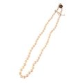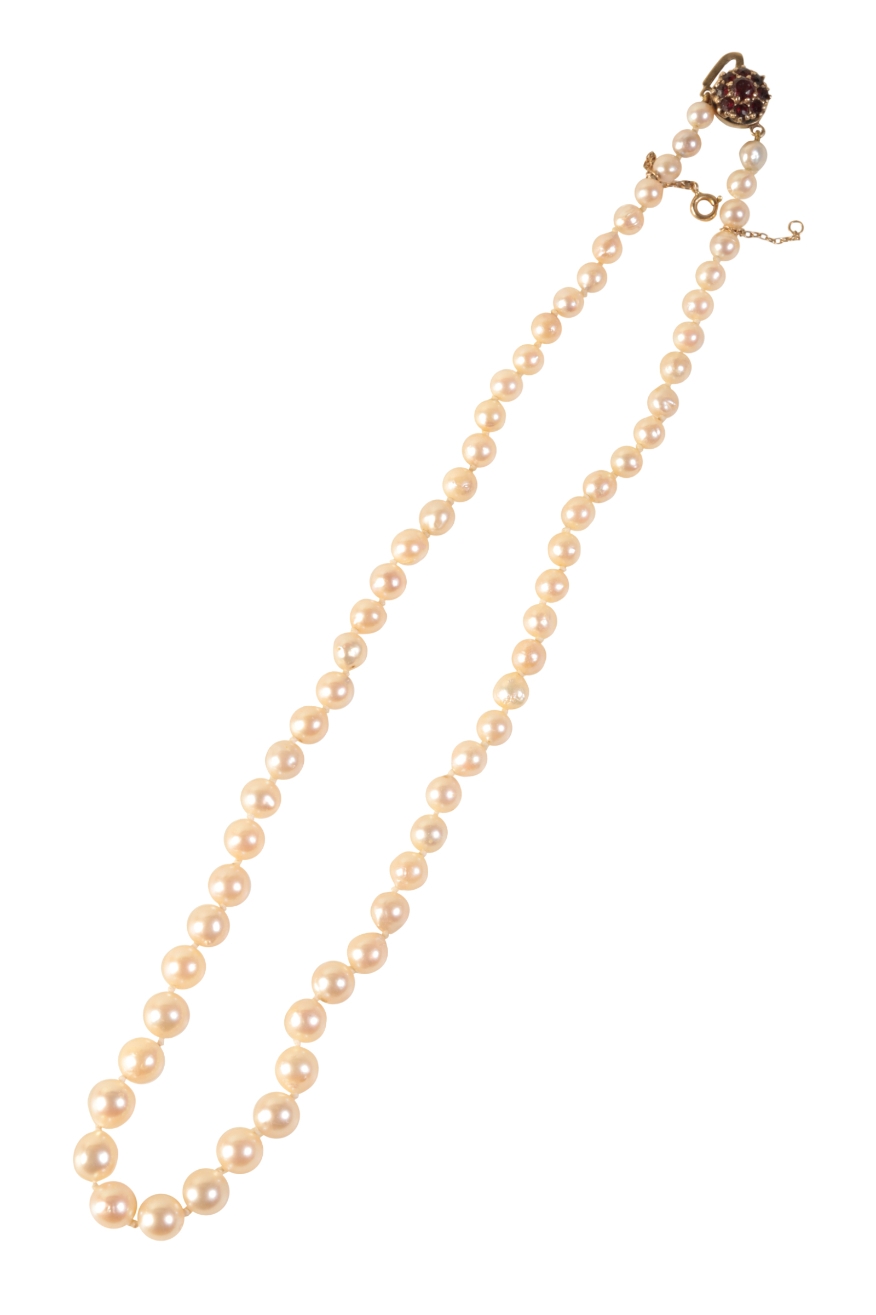 A SINGLE STRAND CULTURED PEARL NECKLACE, each graduated pearl knotted, terminating onto a 9ct gold clasp set with garnets, and attached safety chain, 43cm long,