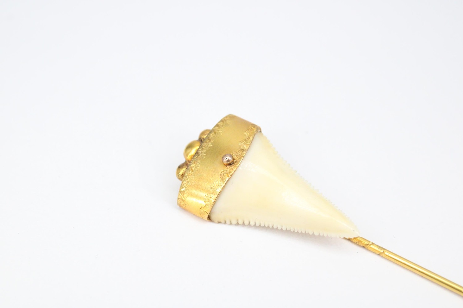 A stick pin. Tests 14ct. Mounted with a shark’s tooth. Weight 4.30 grams