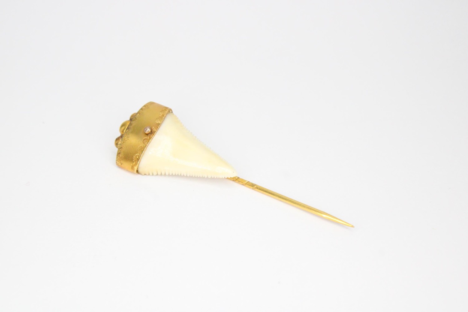 A stick pin. Tests 14ct. Mounted with a shark’s tooth....
