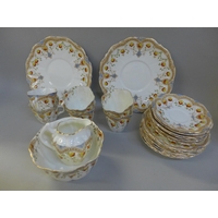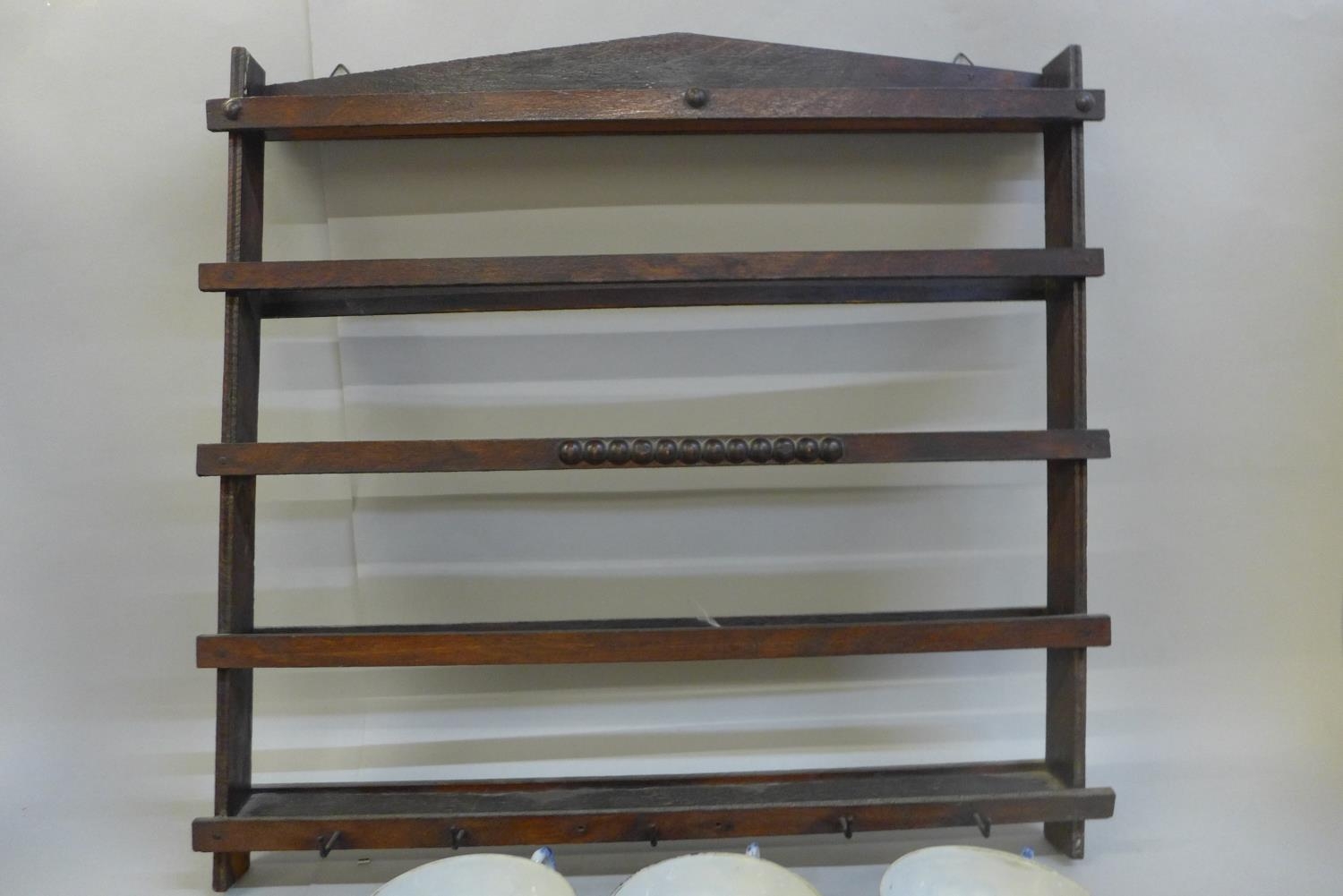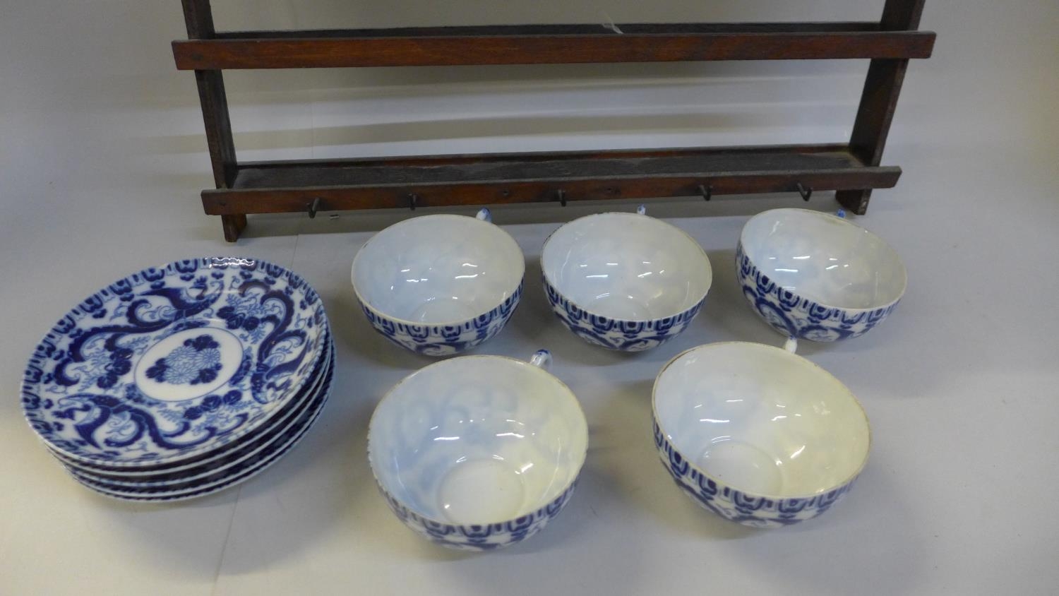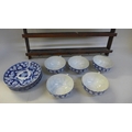 A Japanese blue and white five setting tea set with wooden hanging rack