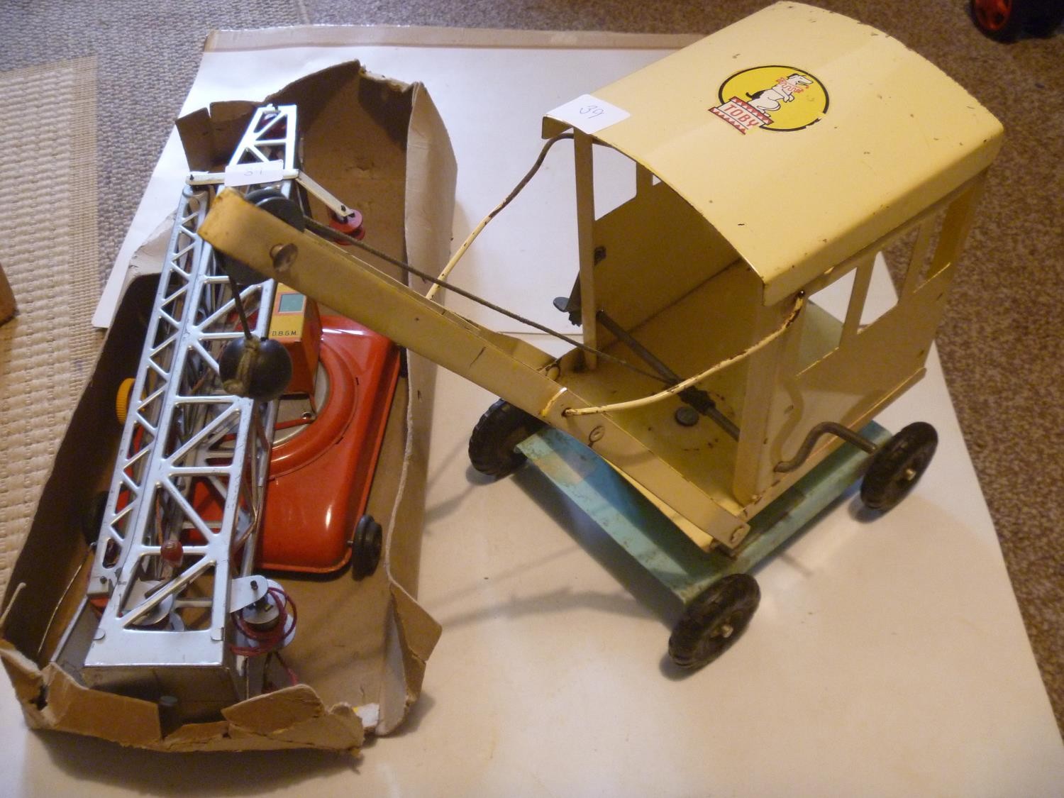 TOBY / TRIANG VINTAGE CRANE WORKING ORDER AND ANOTHER GERMAN MADE CRANE WITH BUCKET. TINPLATE