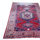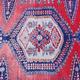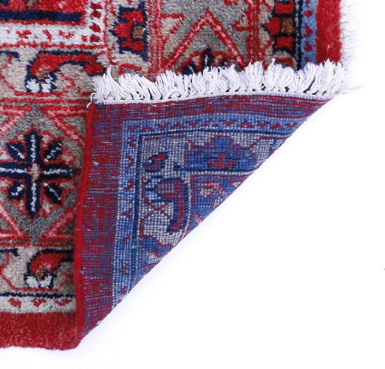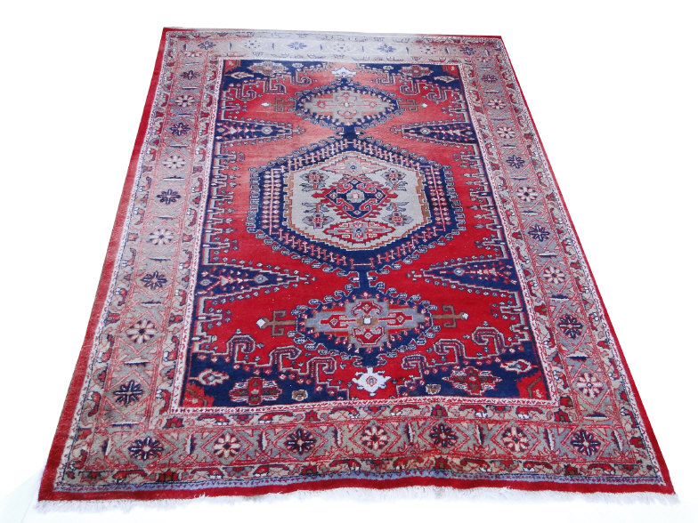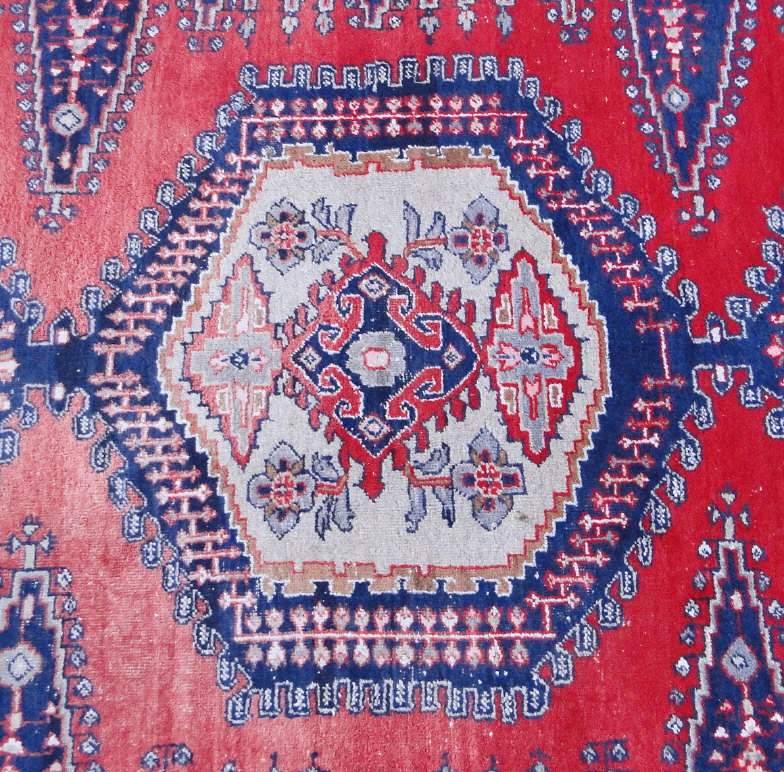 Middle Eastern carpet decorated with a geometric pattern onto a red ground, 158cm x 112cm