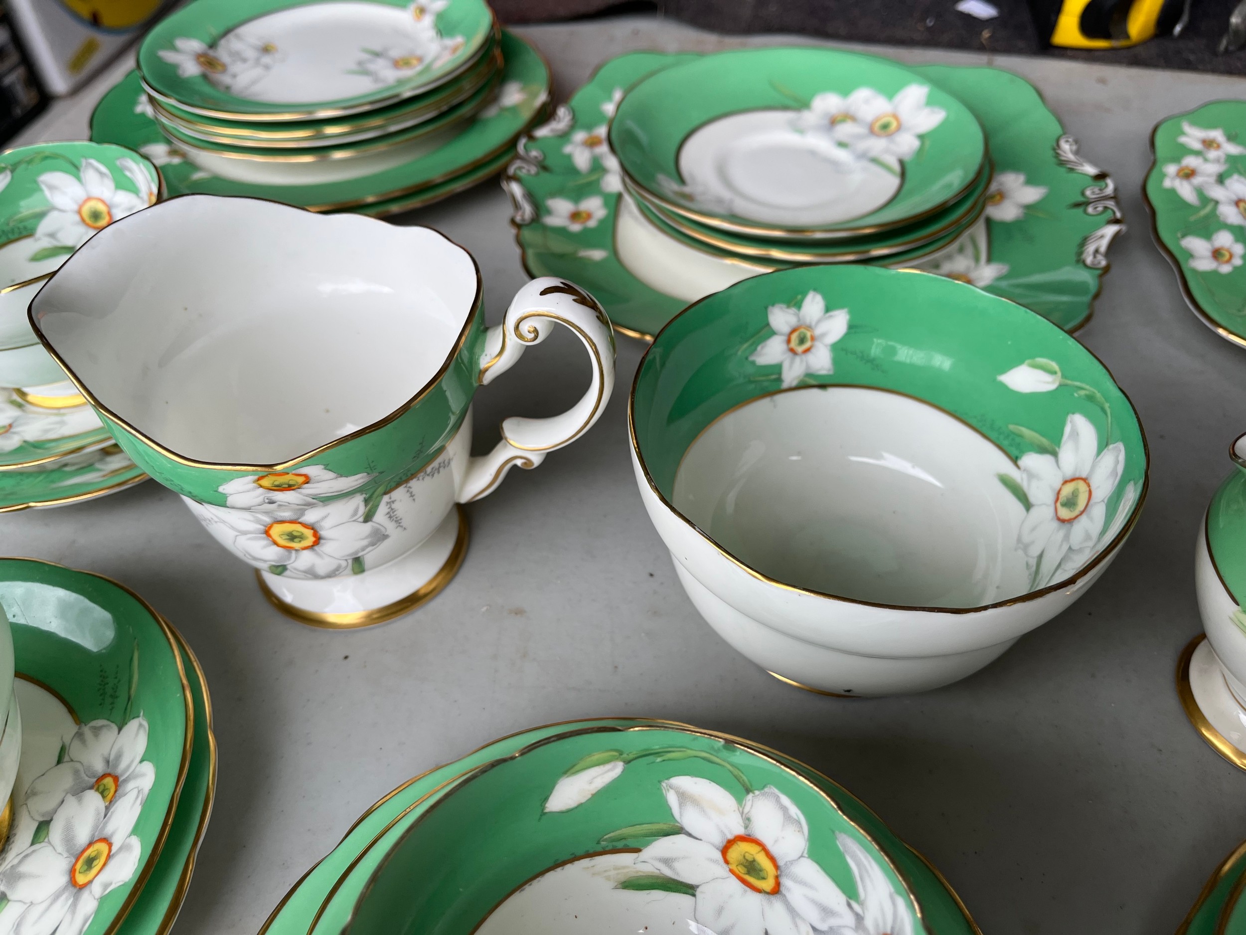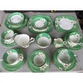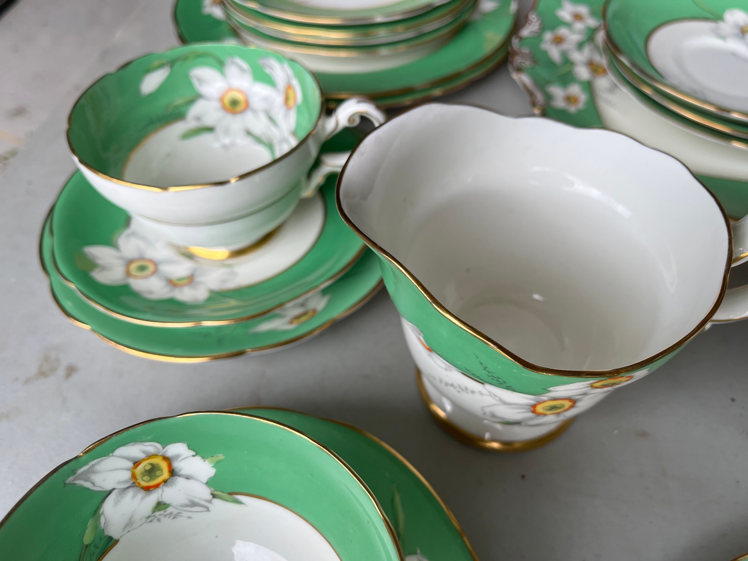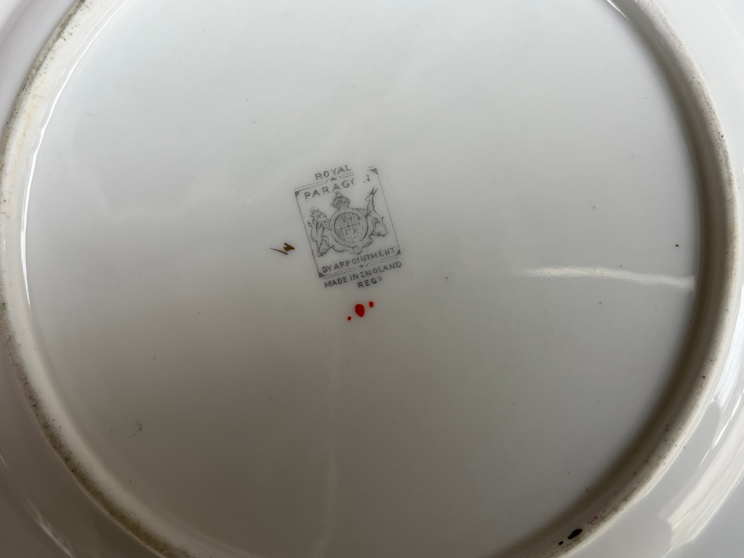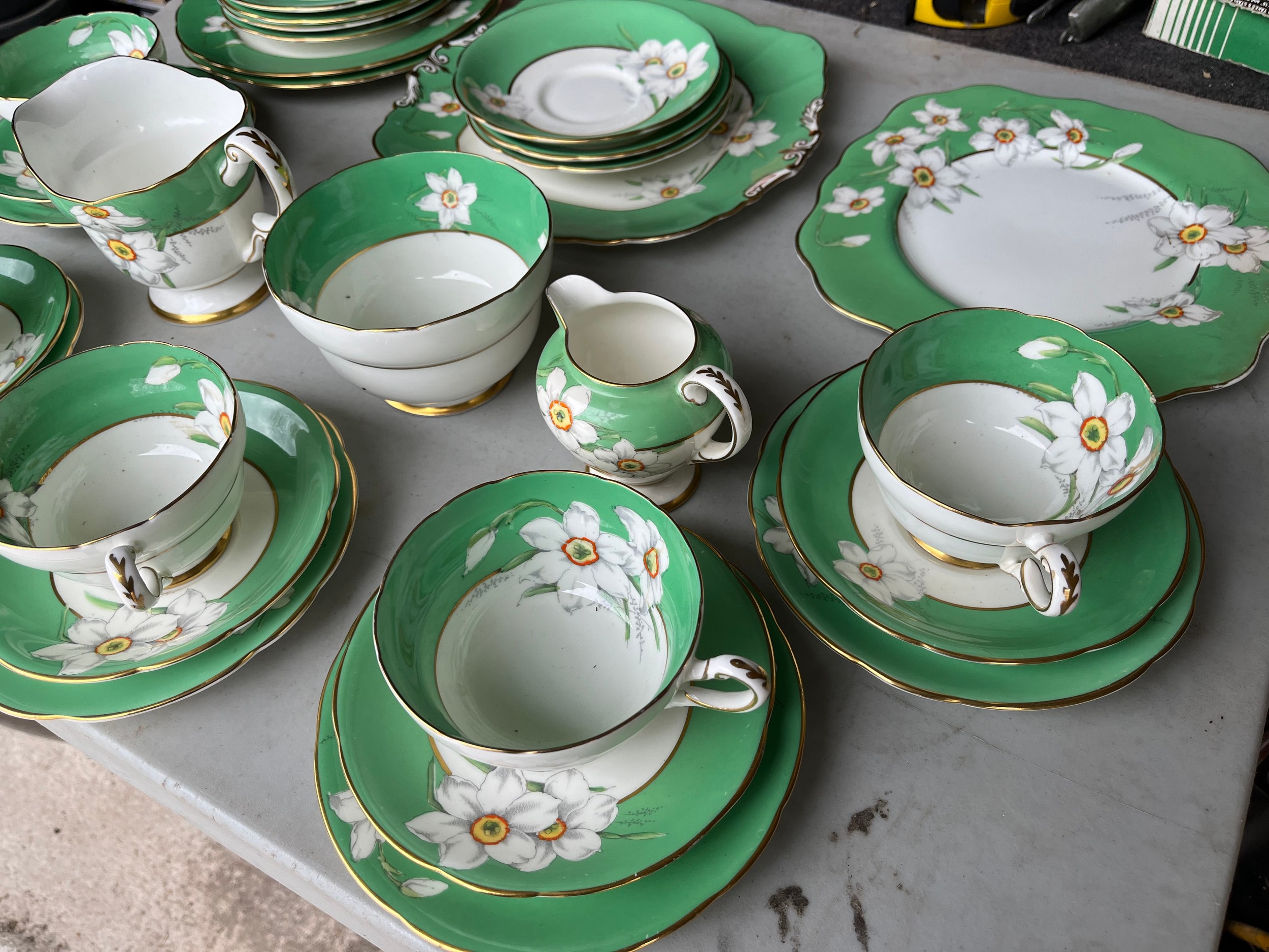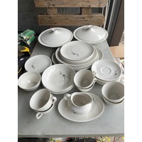 Box of Royal Paragon teaset. A reproduction of the set made for the Duchess of Kent. 1x large serving plate, 1x medium serving plate, 2x medium plate, 9x tea plates, 5x cups, 7x saucers, 1x sugar bowl, 1x milk jug, 1x cream jug. total 28 items