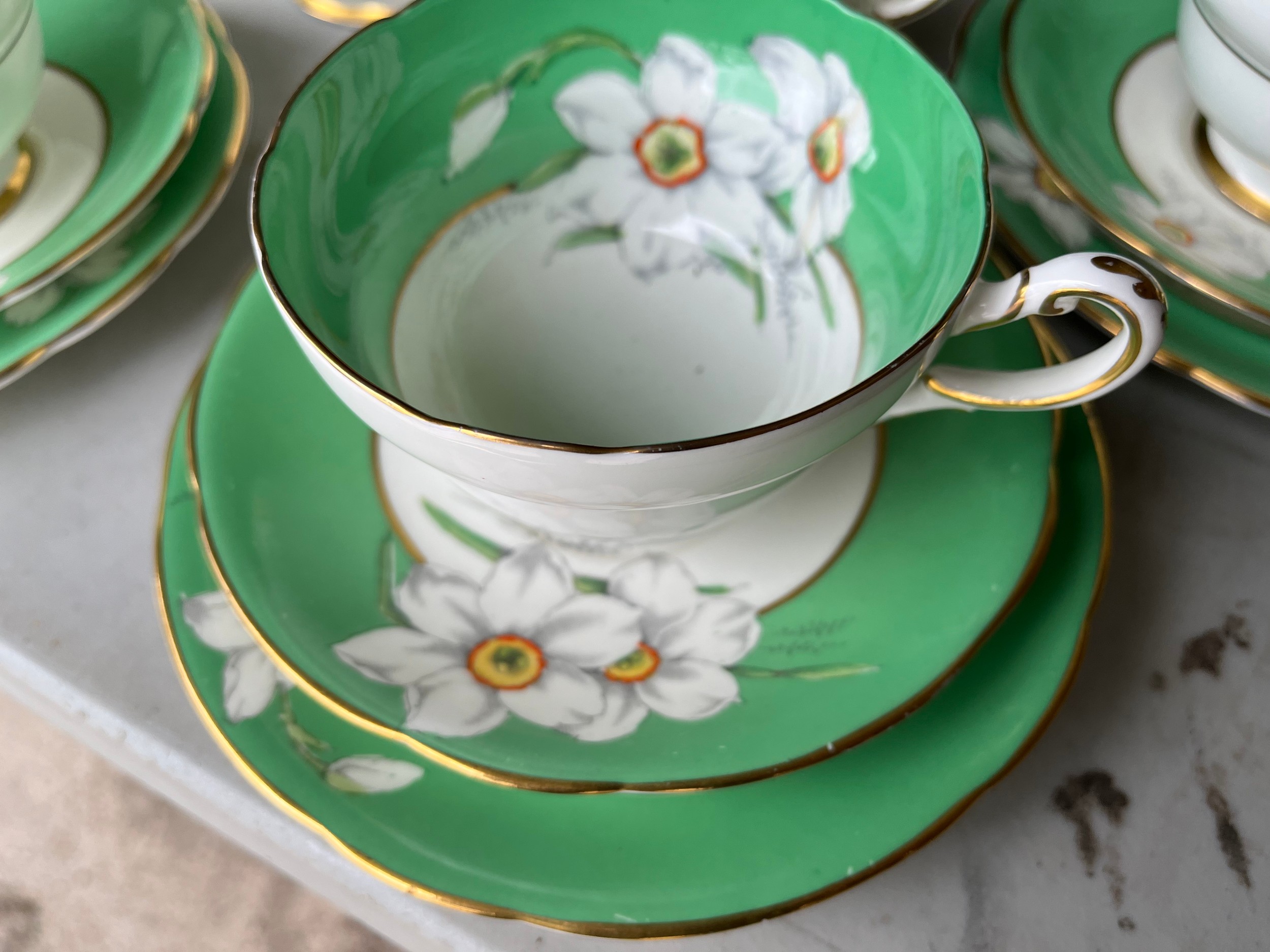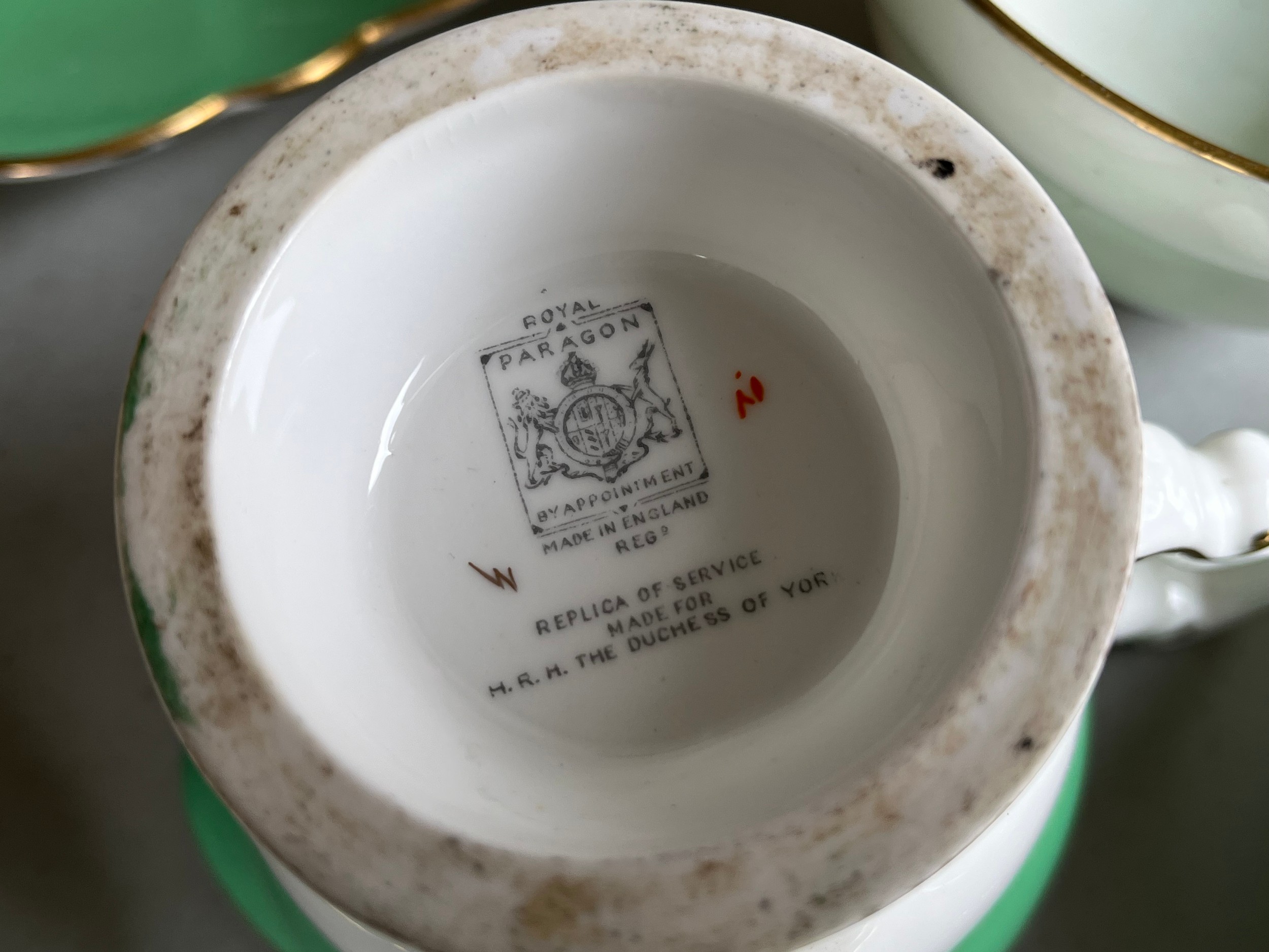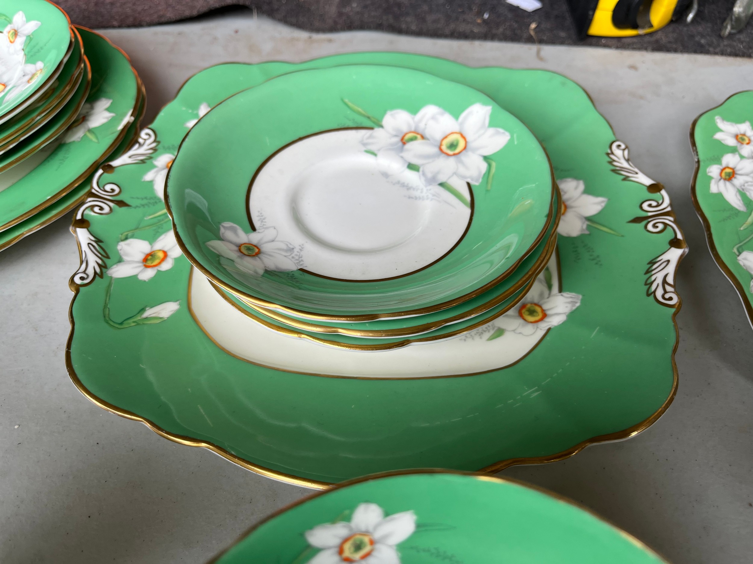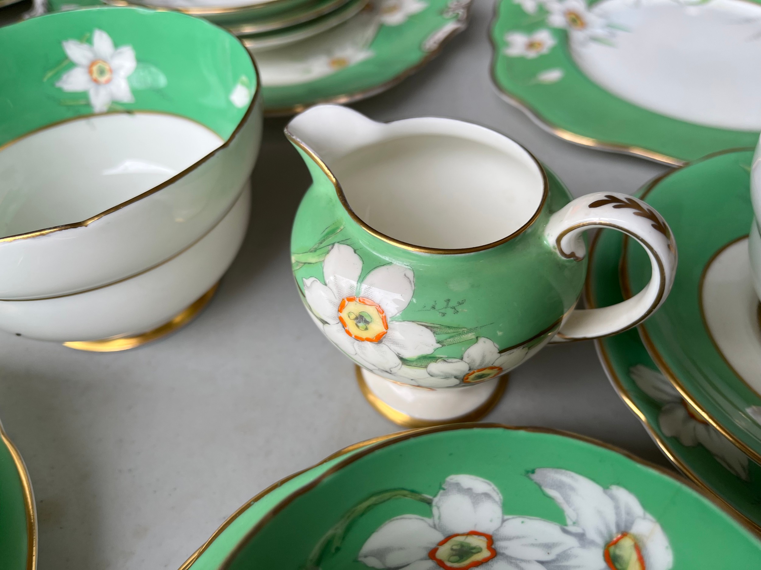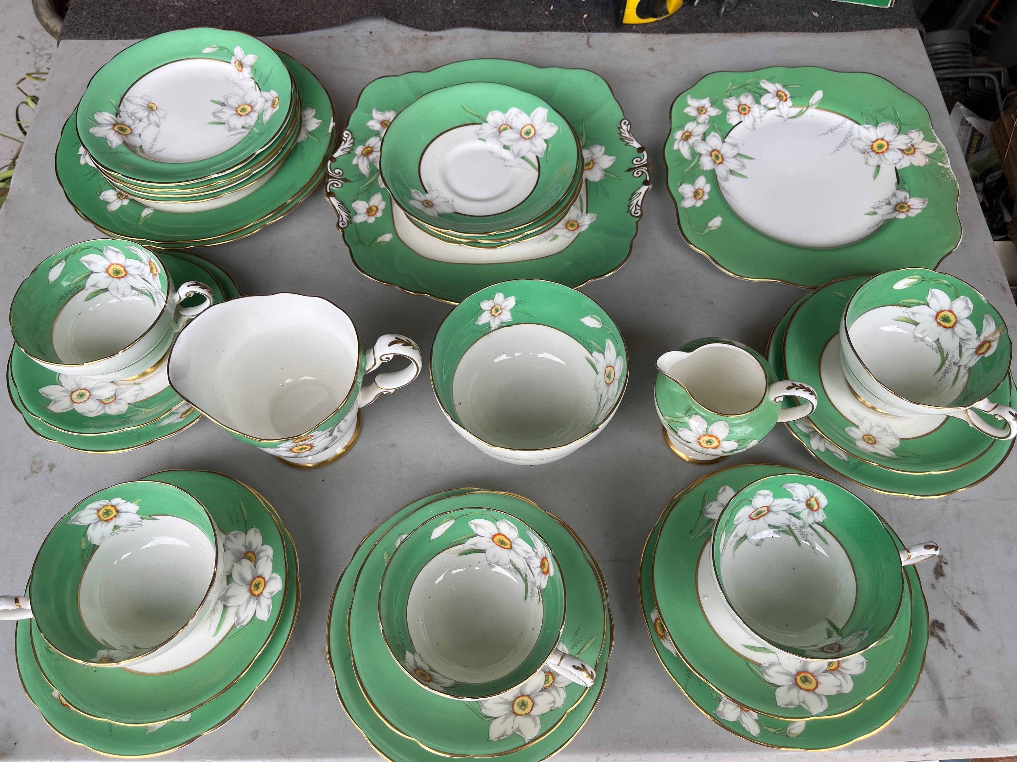 Box of Royal Paragon teaset. A reproduction of the set made for the Duchess of Kent. 1x large serving plate, 1x medium serving plate, 2x medium plate, 9x tea plates, 5x cups, 7x saucers, 1x sugar bowl, 1x milk jug, 1x cream jug. total 28 items