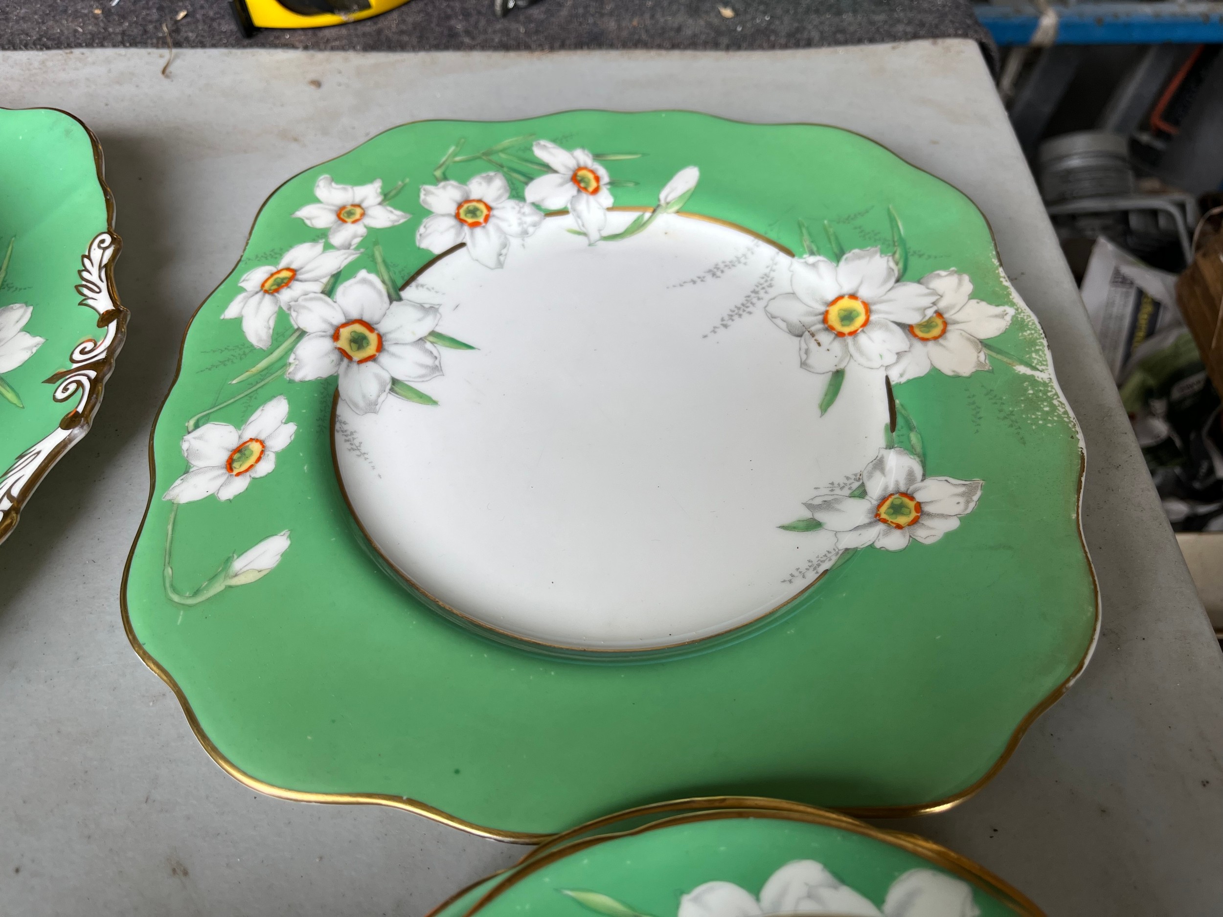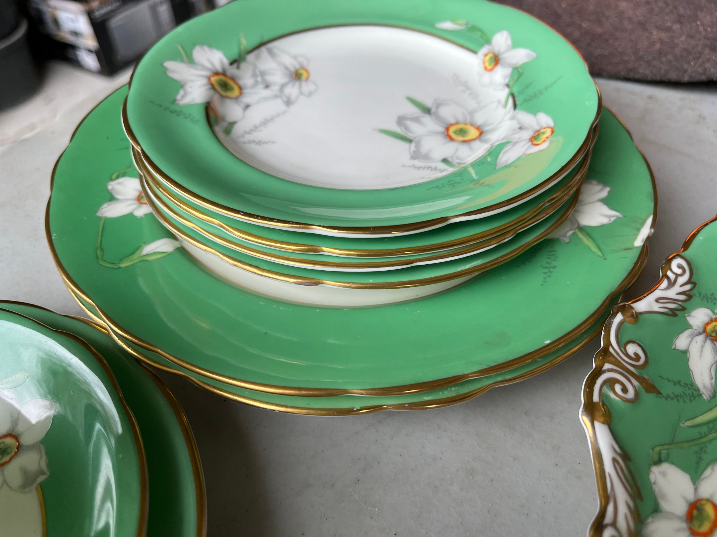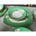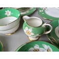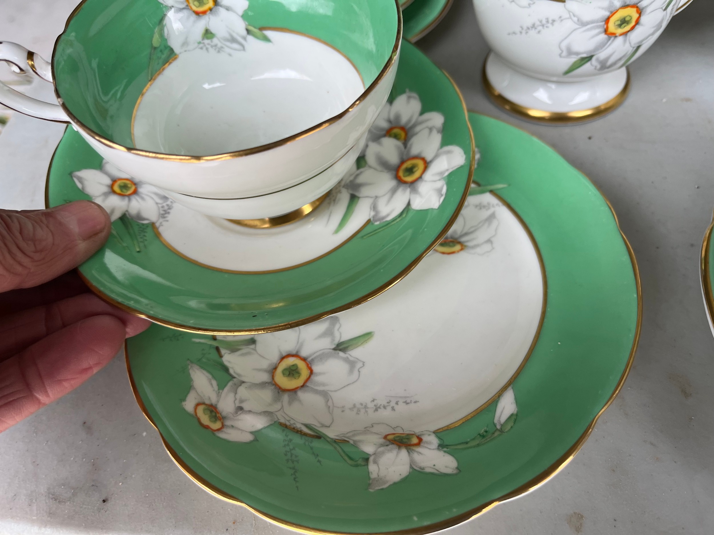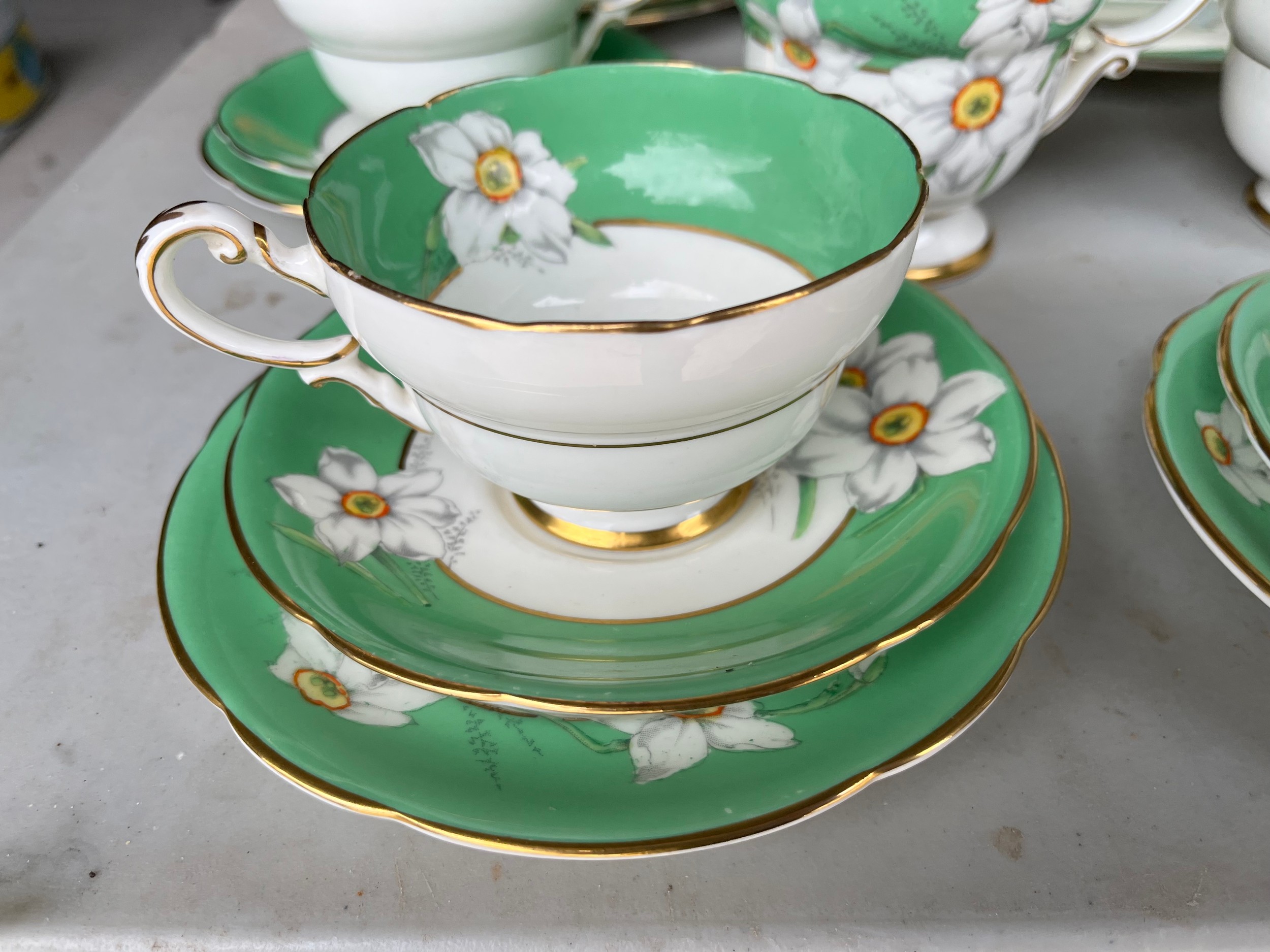 Box of Royal Paragon teaset. A reproduction of the set made for the Duchess of Kent. 1x large serving plate, 1x medium serving plate, 2x medium plate, 9x tea plates, 5x cups, 7x saucers, 1x sugar bowl, 1x milk jug, 1x cream jug. total 28 items
