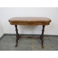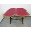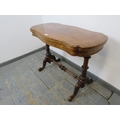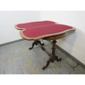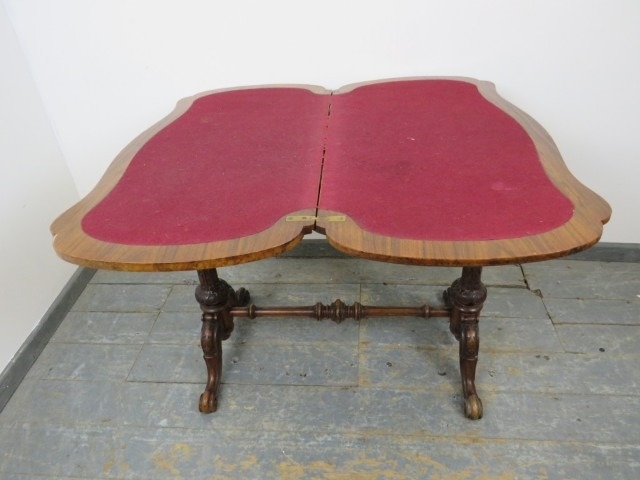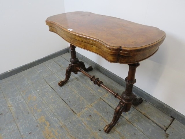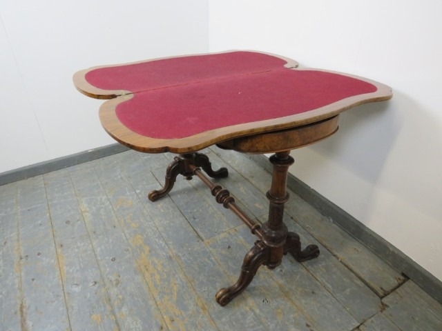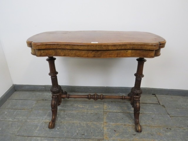 A Victorian burr walnut serpentine fold out card table raised upon turned and carved supports united by stretcher. 73 x 95 x 46cms (approx).