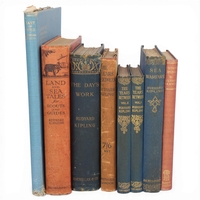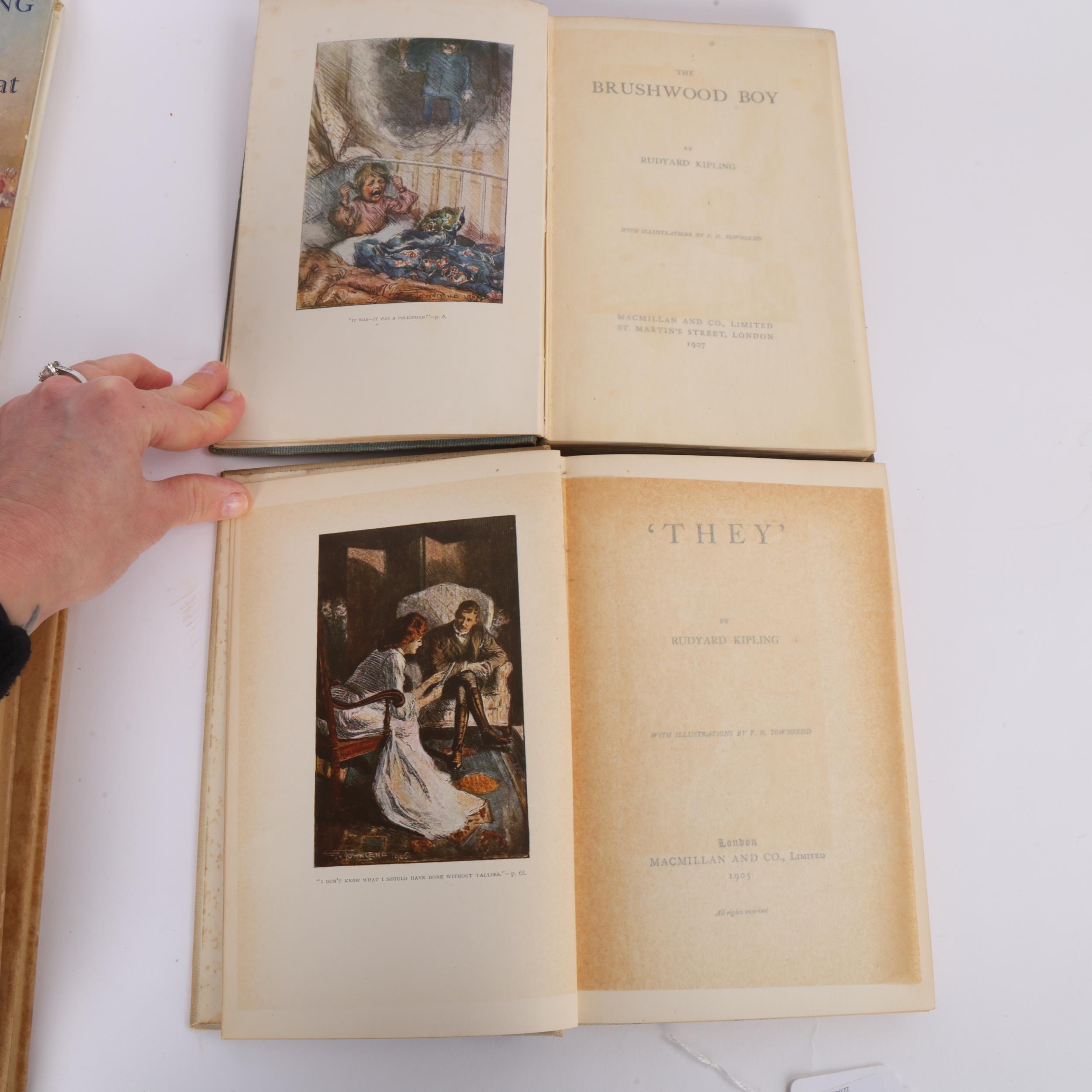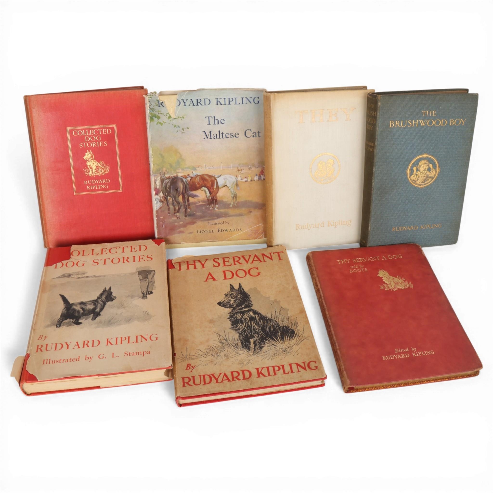 Rudyard Kipling - 7 books including Thy Servant A Dog, 2 copies both MacMillan, London, 1930, one with leather cover and gilt detail and page edging, 2 copies Collected Dog Stories, MacMillan, 1934, The Maltese Cat, Macmillan 1955, They, Macmillan, 1905, illustration by FH Townsend, and The Brushwood Boy, MacMillan 1907, illustration by FH Townsend