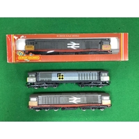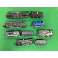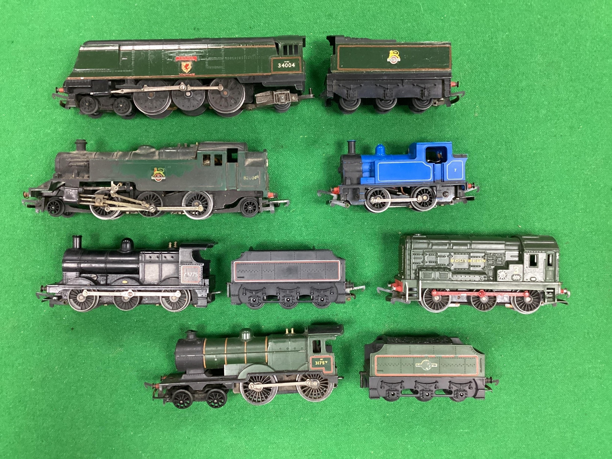 Six Triang 00 gauge locomotives: a West Country 4-6-2 "Yeovil"; a 2-6-2 tank engine; a 3F 0-6-0; an L1 4-4-0; an 0-4-0 shunter; and an 0-6-0 diesel; all playworn and untested.