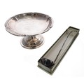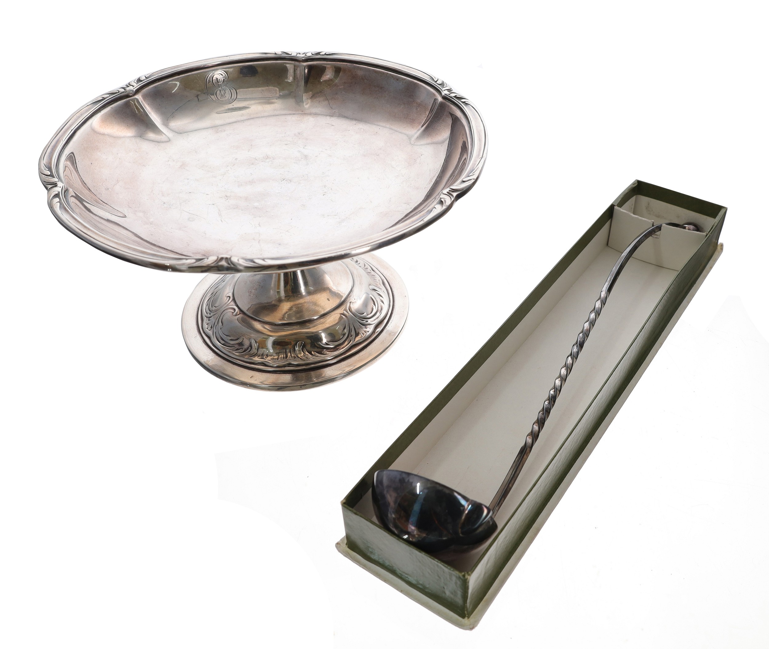 Christofle silver plated comport, of shaped circular outline with foliate decorated circular foot, 8.5" diameter; together with a Christofle ladle, in retail cardboard box (2)