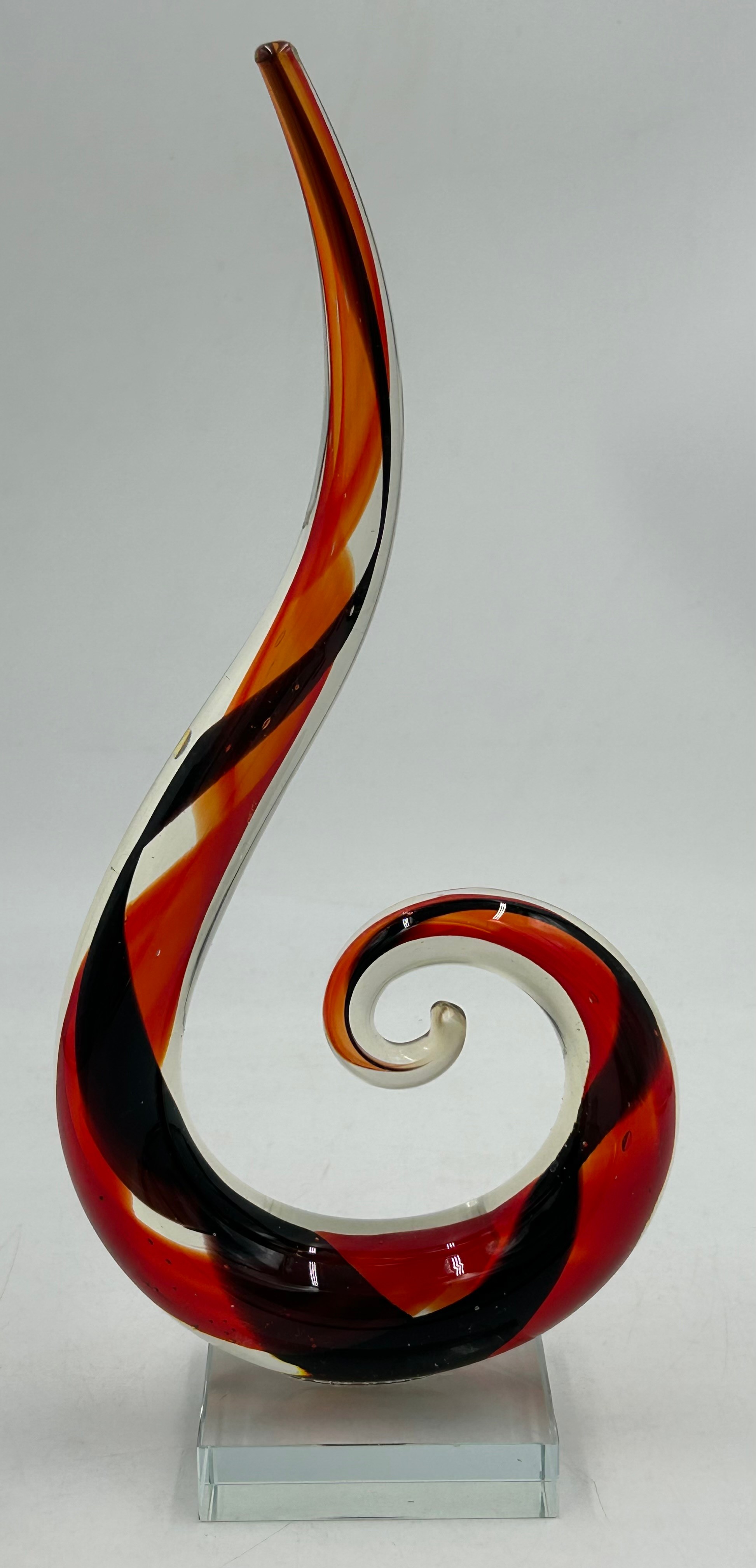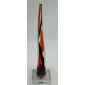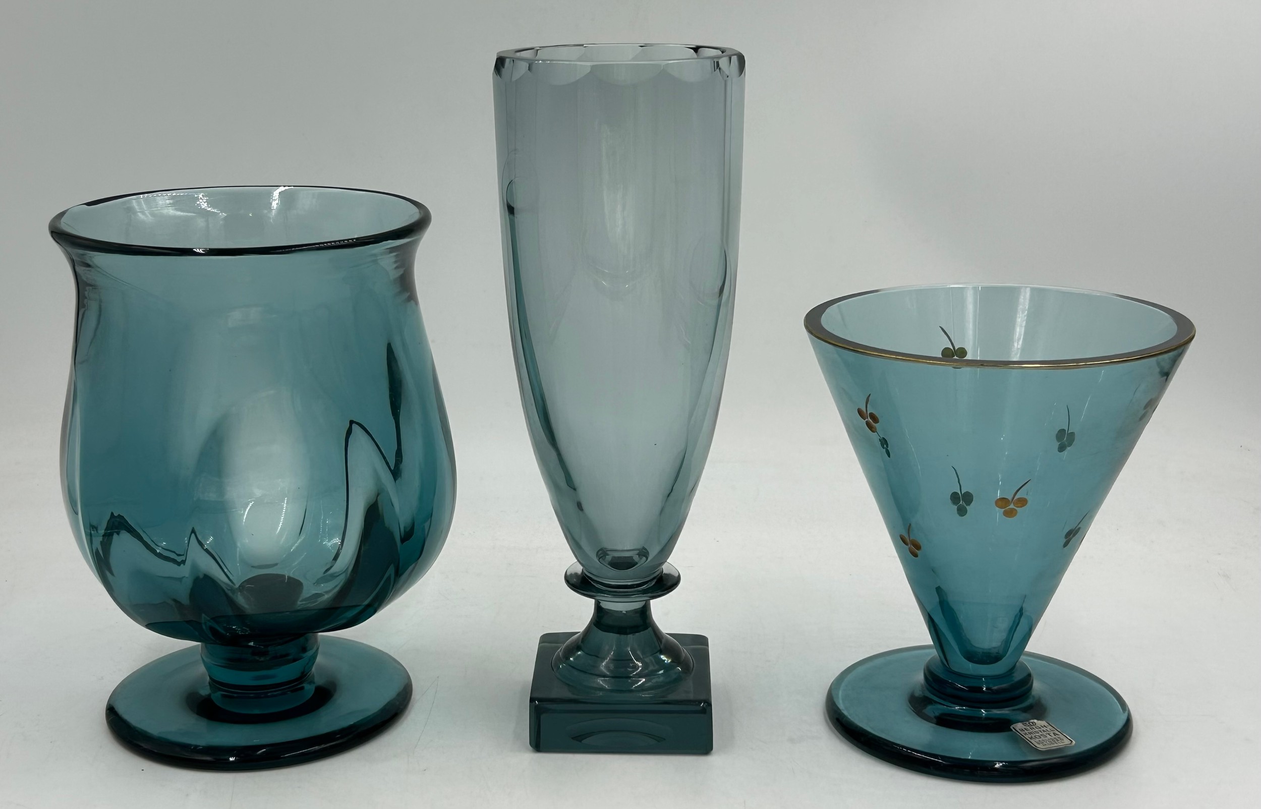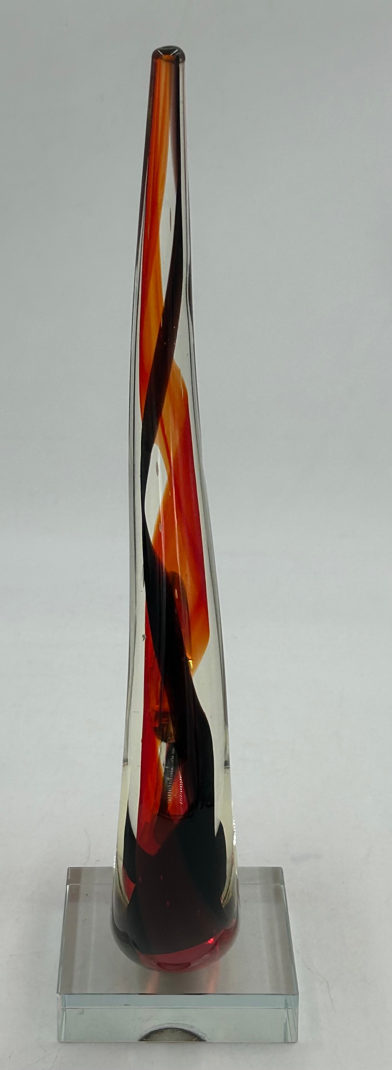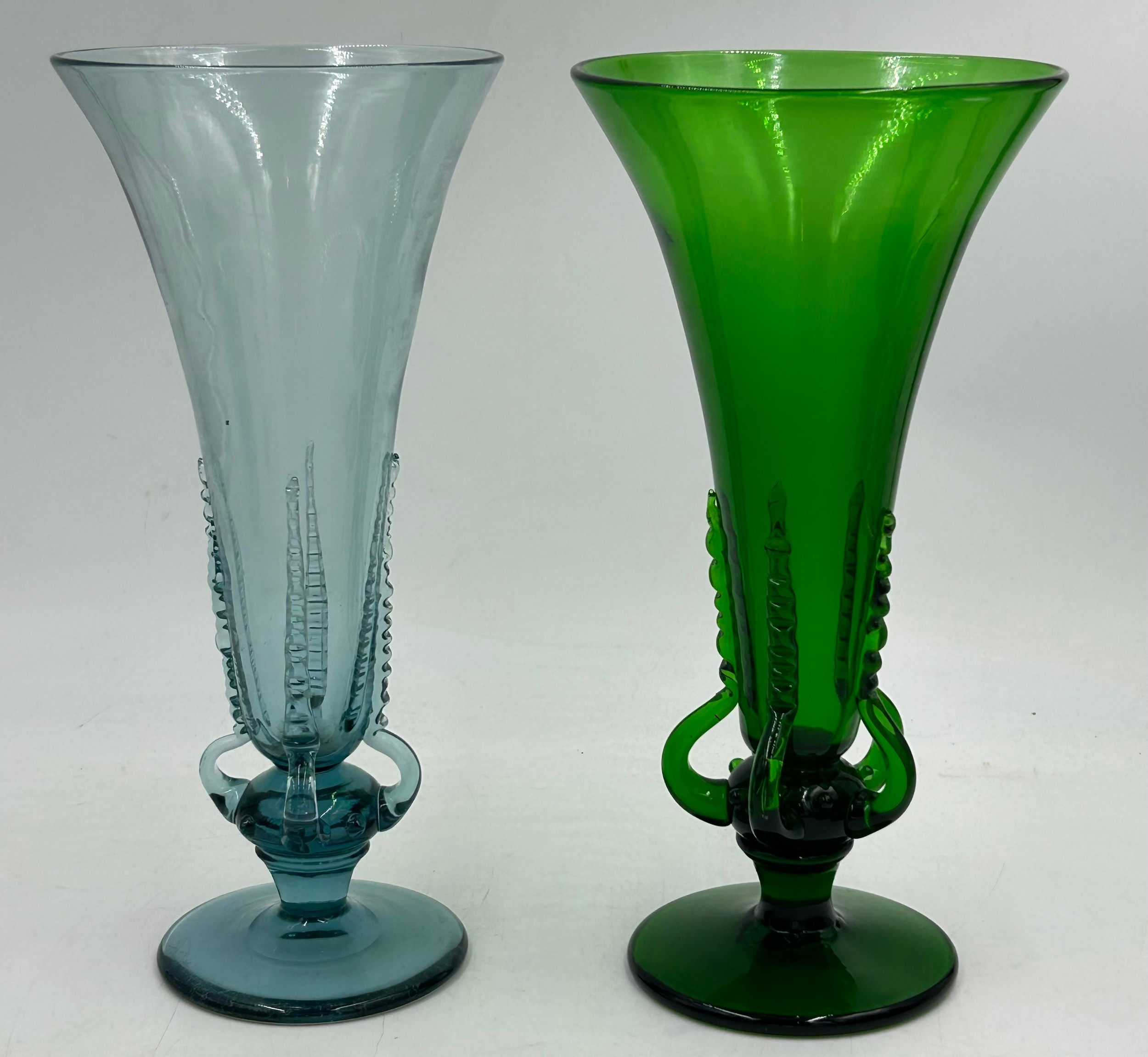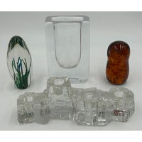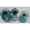 A collection of mid 20thC glass to include 2 x vases with lugs in blue & green by Edvin Ollers for Kosta 26.5cm together with 3 x blue/grey vases by Elis Berg for Kosta tallest 26cm and a Murano style red glass flame, 32cm. (6).