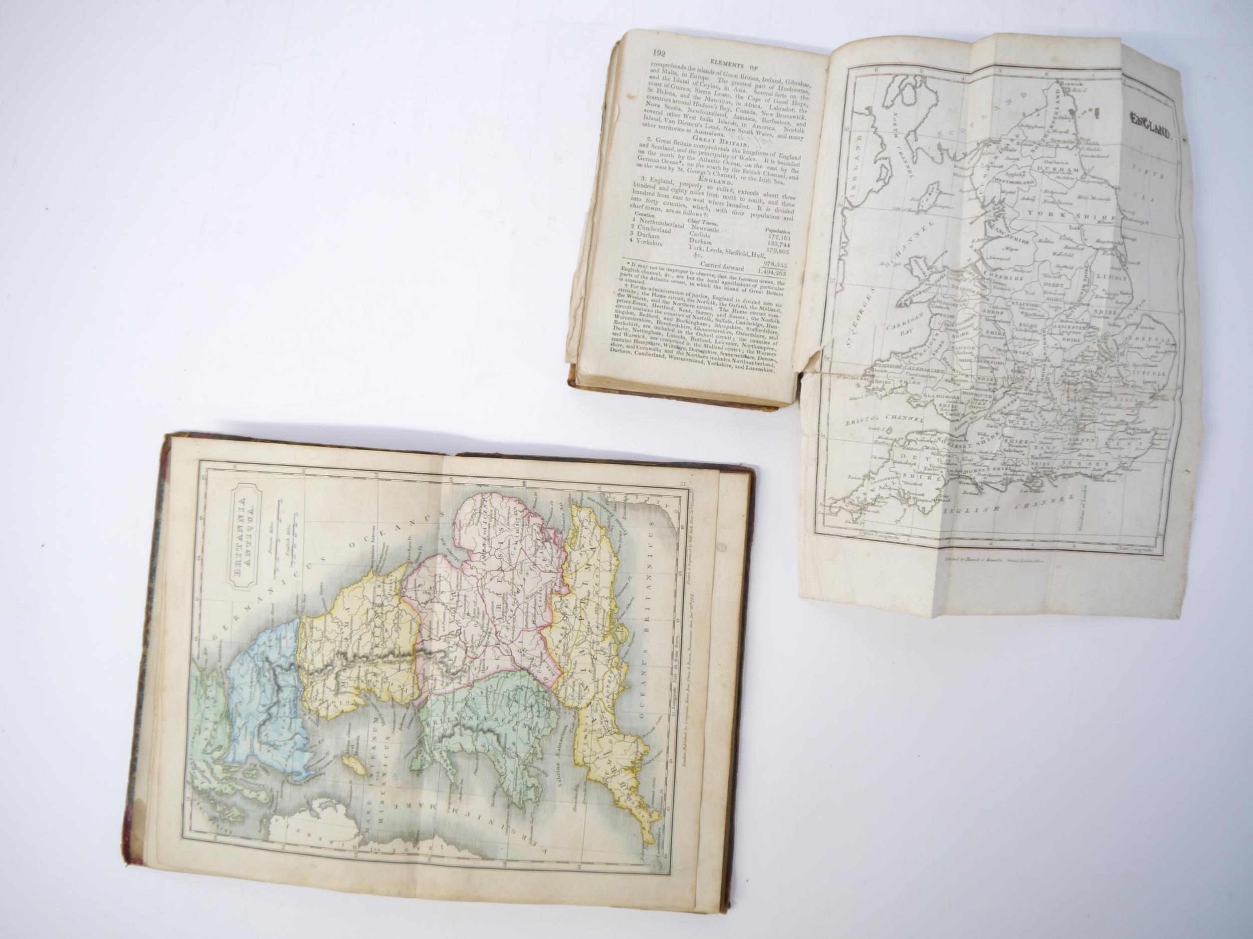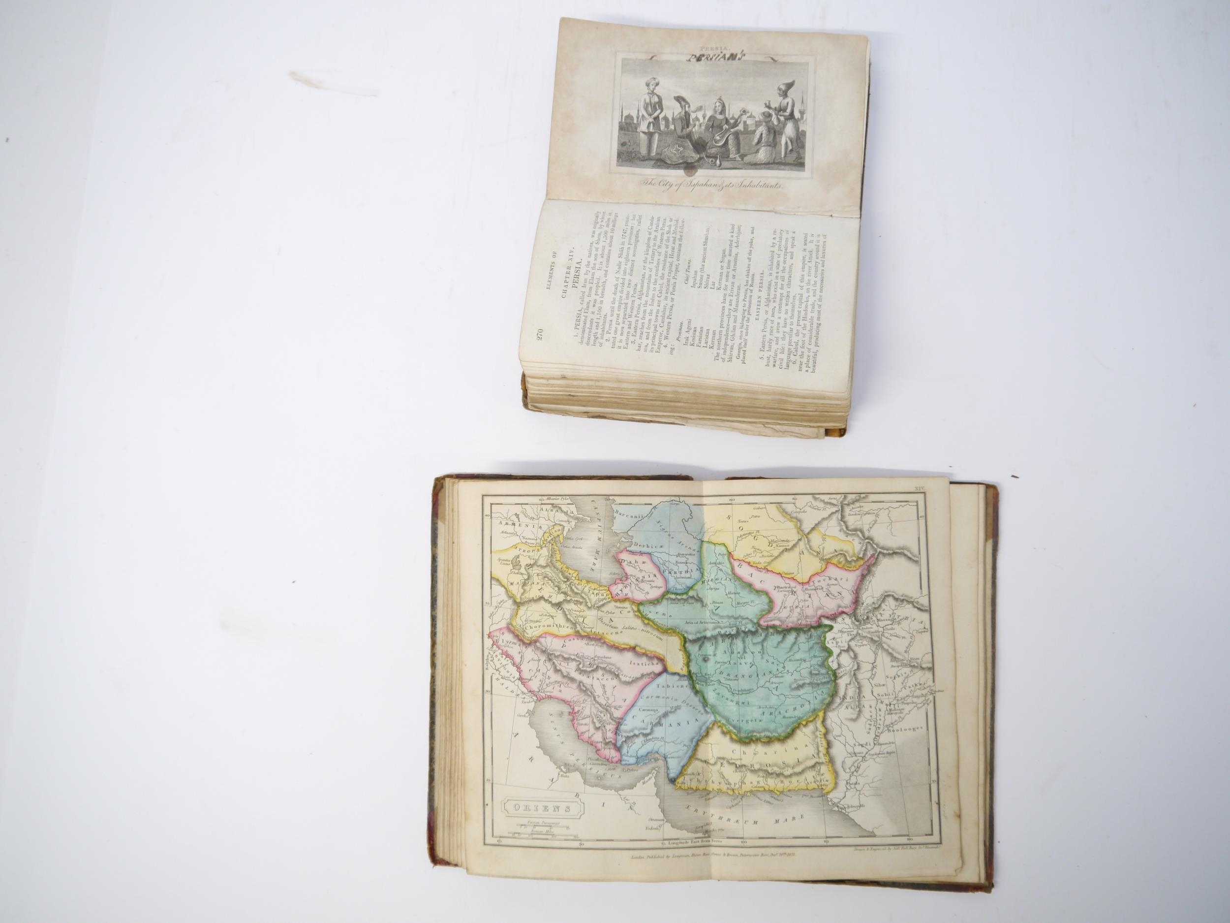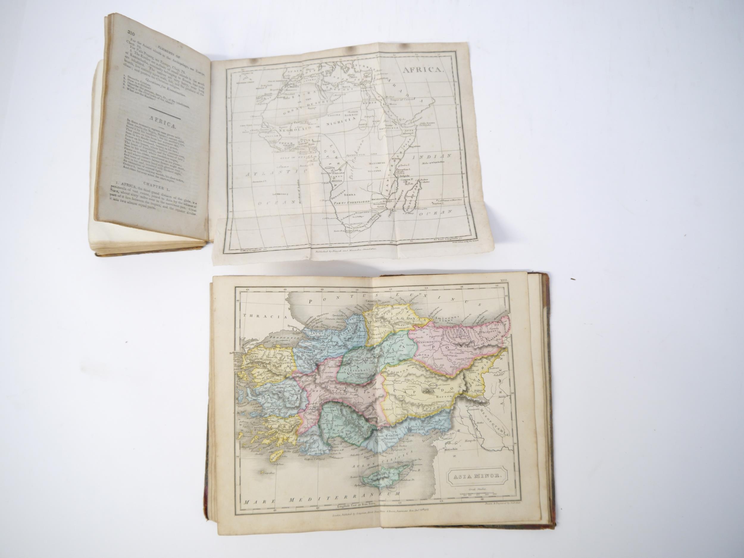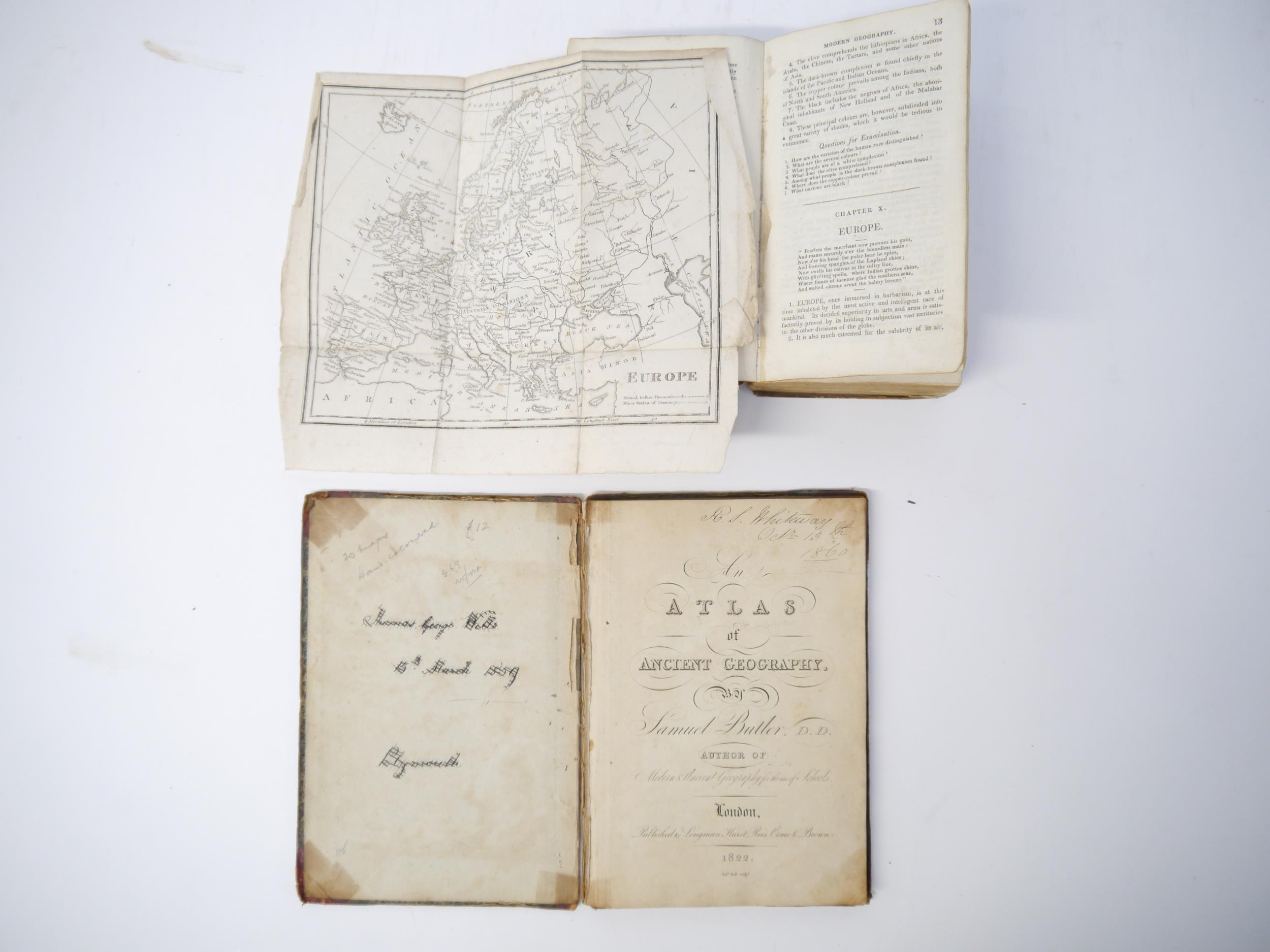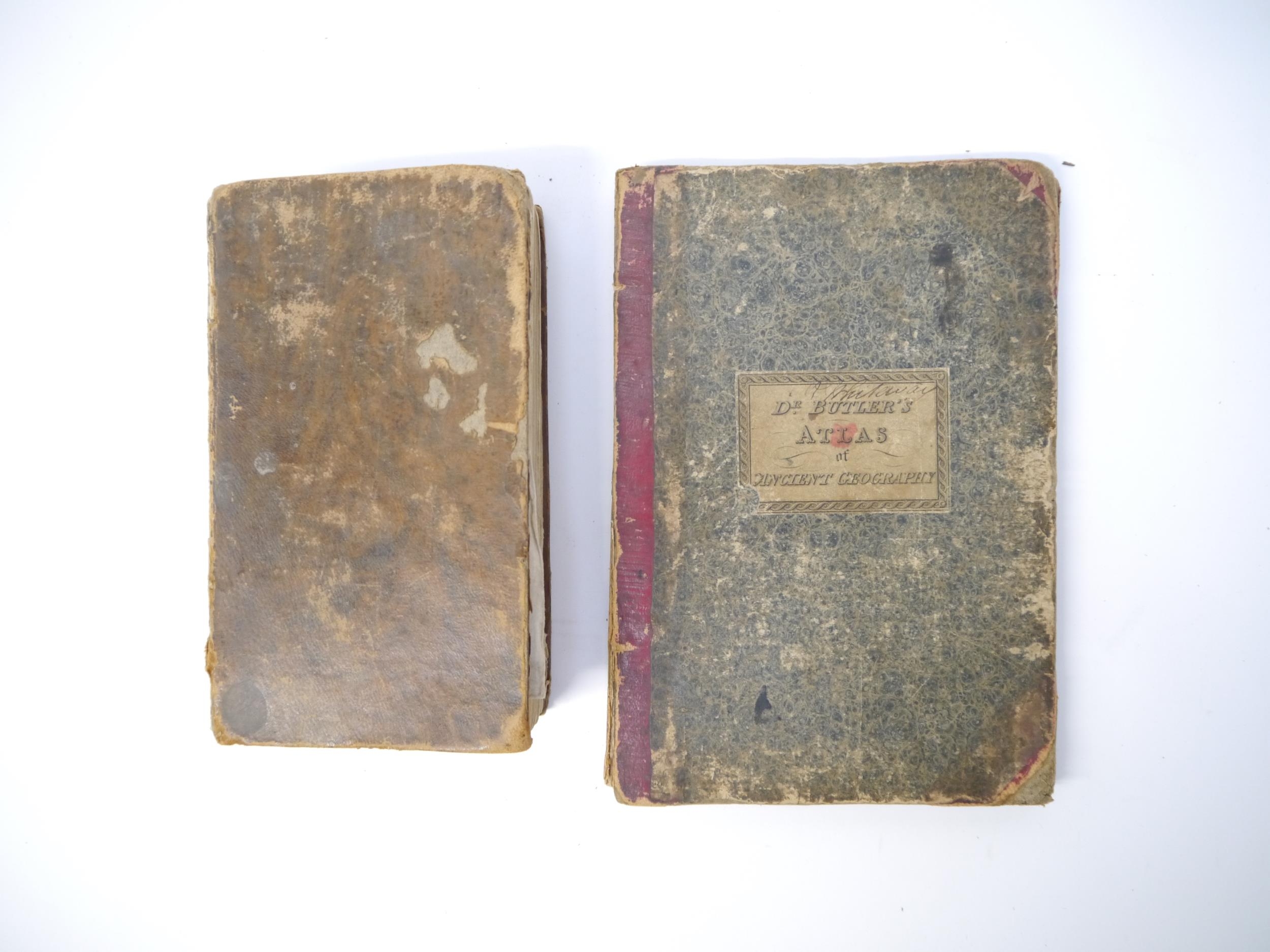 (Atlases, 19th Century Juvenile Education), George Roberts: 'The Elements of Modern Geography and General History; on a plan entirely new: Containing an Accurate and Interesting Description of all the Countries, States, &c, in the Known World; with the Manners and Customs of the Inhabitants; to which are added Historical Notices of each Country to the present time, and questions for examination. The whole illustrated by numerous correct maps and engravings.', London, Pinnock & Maunder, 1820, 1st edition, engraved folding double hemisphere world map frontis + 8 folding maps + 11 (of 12) engraved views of world cities and costume plates (lacks plate facing p.250) + 4 engraved plates at end on the construction of maps, xii,435,[1]pp, engraved views and costume plates with contemporary m/s captions in pen & ink to margins, contemporary calf (worn), later printed label to spine. An extremely scarce first printing, likely owing to heavy use due to its success as a school text book; together with Samuel Butler: 'An Atlas of Ancient Geography', London, Longman et al, 1822, copper engraved title page, index + 20 double page engraved maps (all with contemporary hand colouring except plate XX, plans of Rome, Rome & environs, Athens & Syracuse), maps/plates with contemporary manuscript titles/notes to reverse of each, original half roan over marbled paper covered boards (worn), printed paper label to front cover (2)