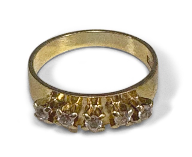 Claw set with 5 round brilliant cut cubic zirconia, in 9ct gold, size L, 3,1g all in