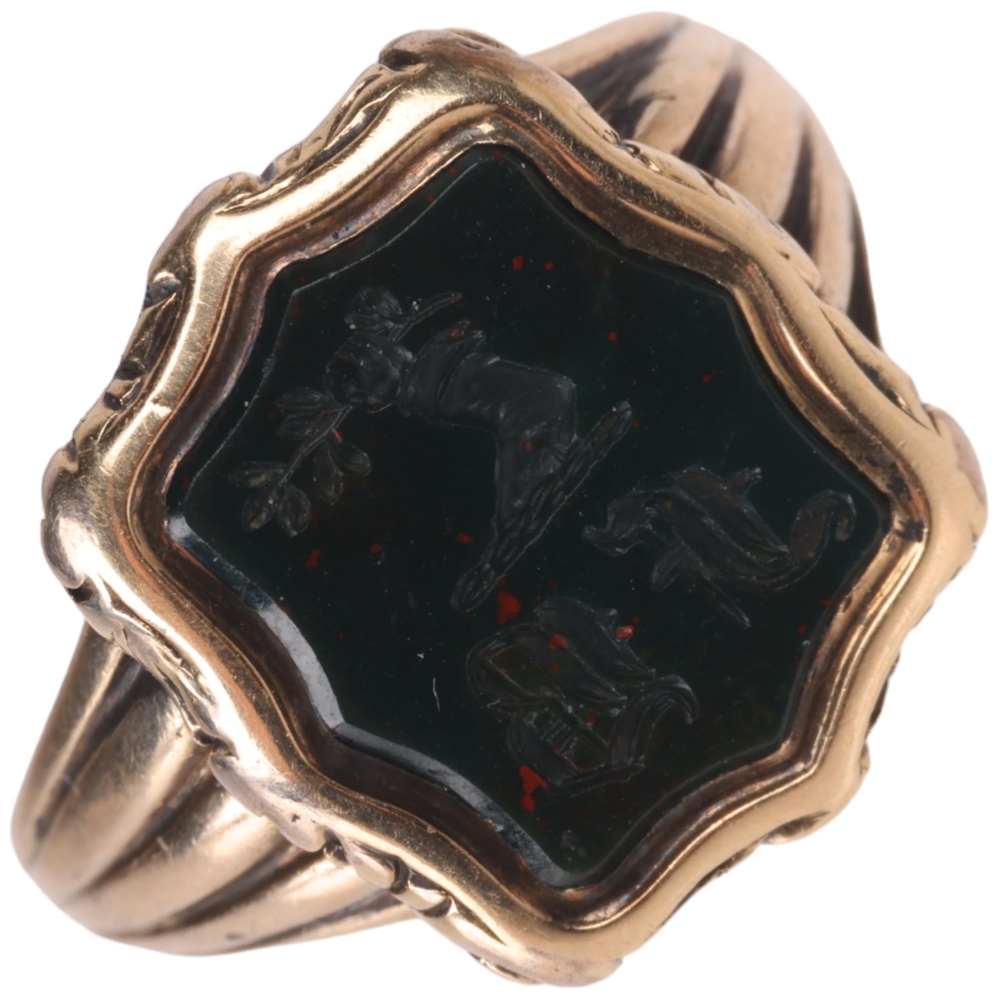 An Antique 9ct gold bloodstone seal signet ring, intaglio carved with hand holding olive branch emblem and initials FB, in shaped foliate surround, unmarked mount tests as 9ct, setting height 14.6mm, size K, 4.4g