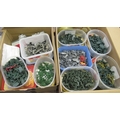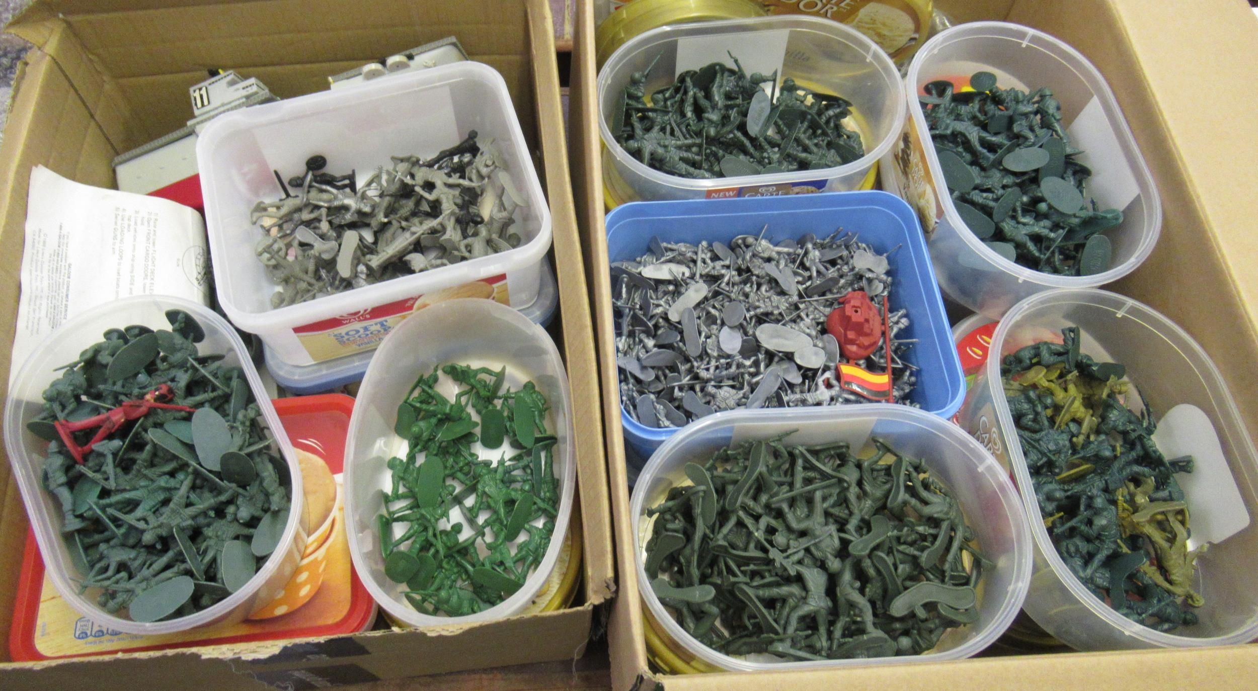 Two boxes containing a quantity of various children's plastic toy soldiers and figures etc.