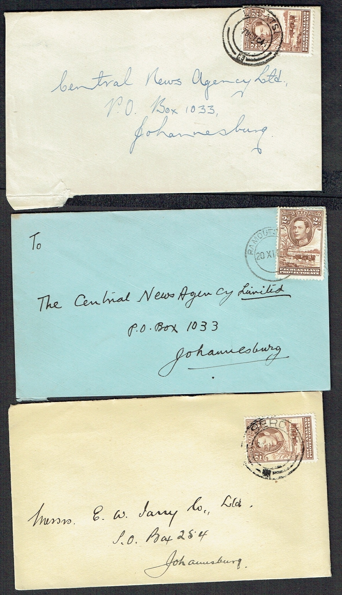 BECHUANALAND - Twenty GVI Covers from an original correspondence to Central News Agency in Johannesburg. Many different postmarks tying GVI 2d brown defin incl LOBATSI, SEROWE (9), PALAPYE, MAHALPYE, FRANCISTOWN, MOCHUDI, RAMOUTSA, most are slit to open out. (20).