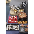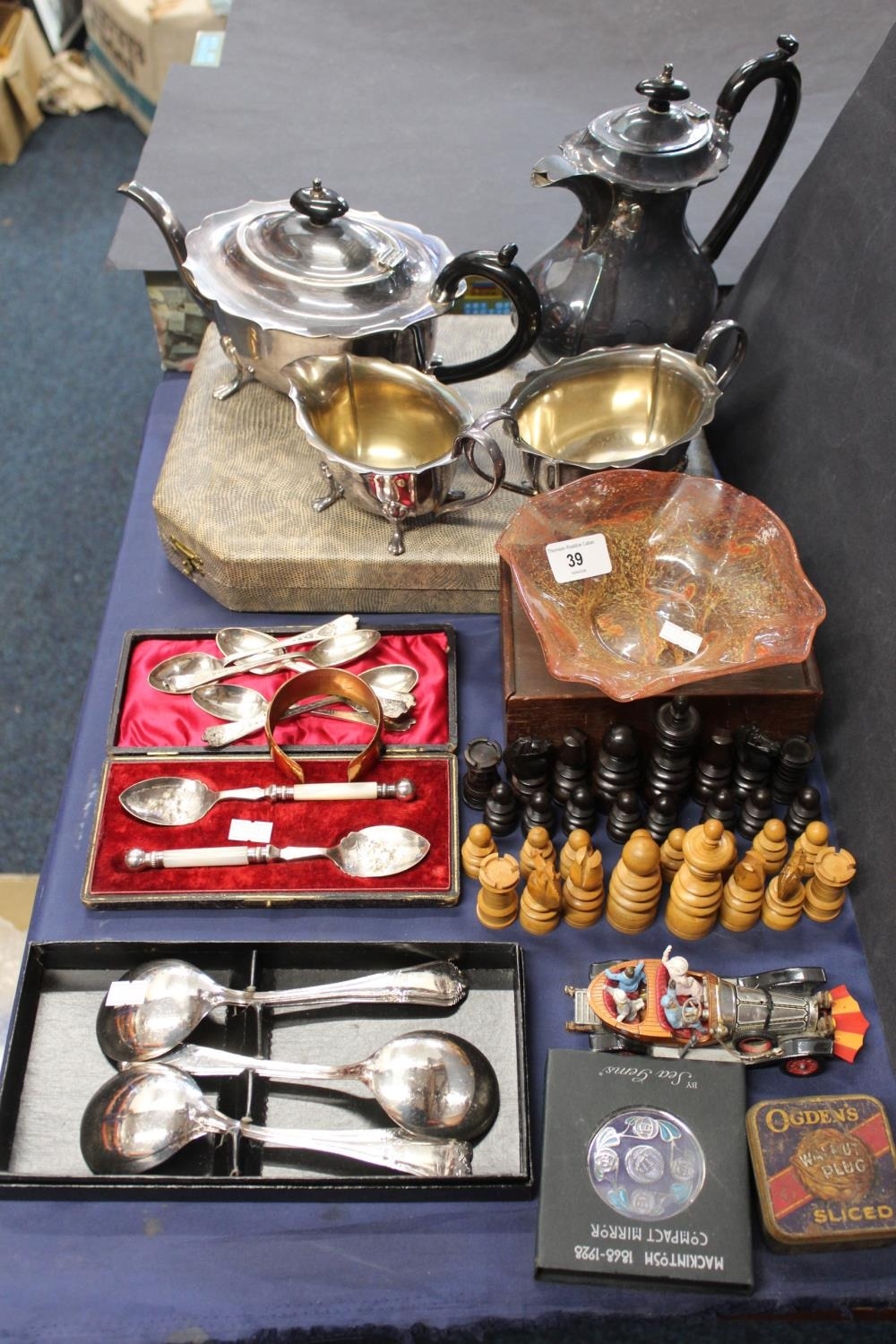 Silver plated four piece tea service, Vasart art glass dish, treen chess set, Corgi Chitty Chitty Bang Bang model etc.