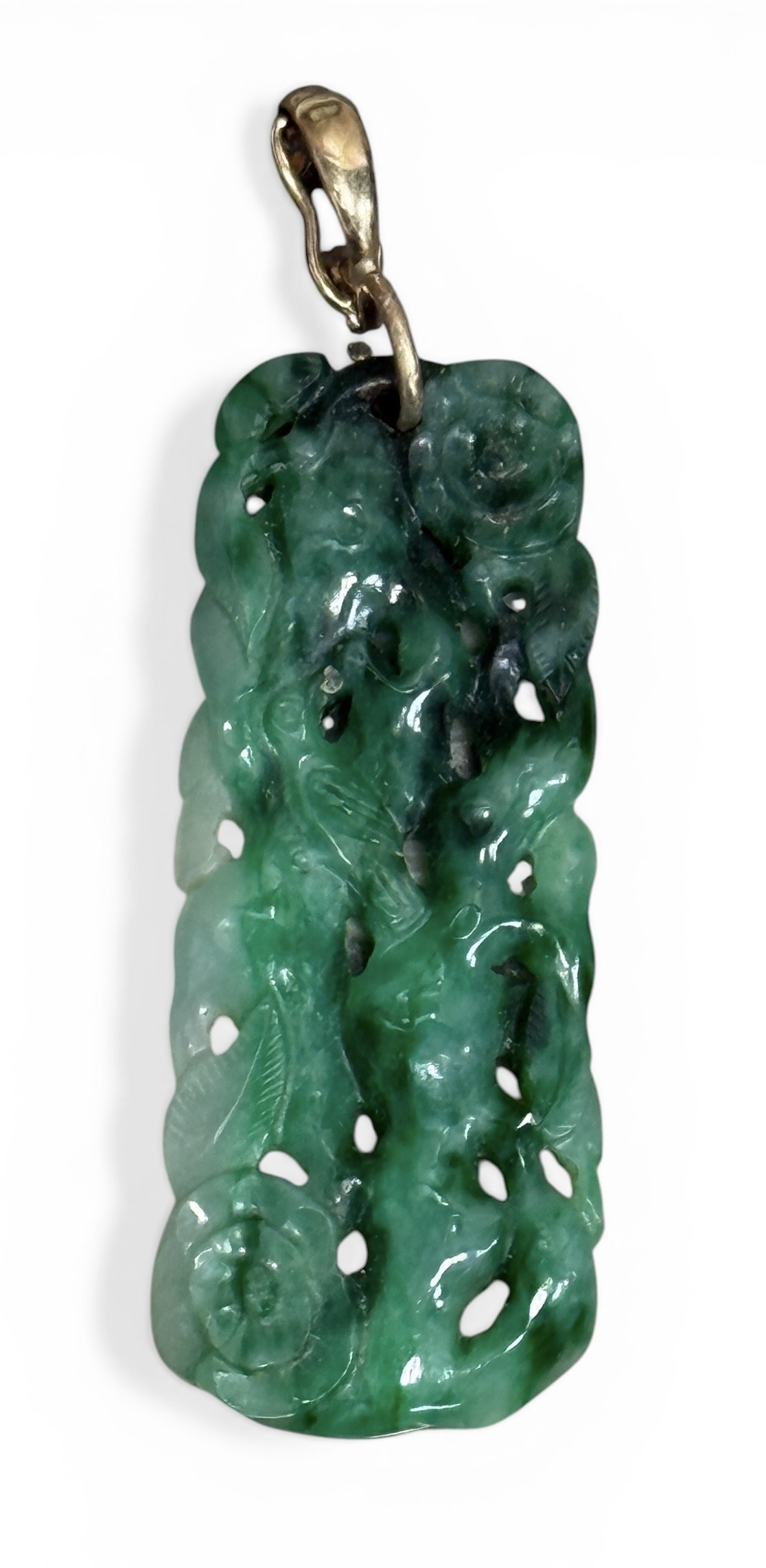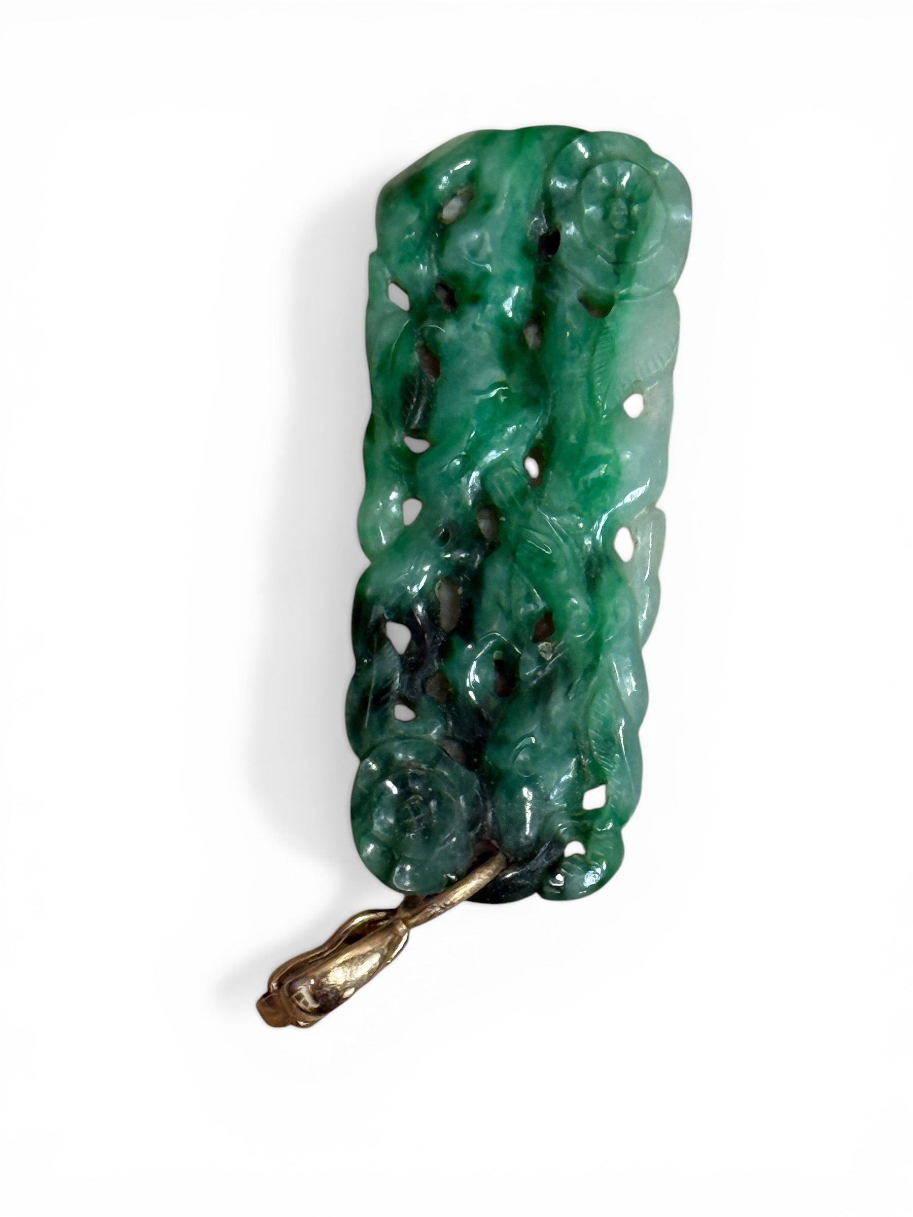 一件綠色雕花玉吊墜,配有金色扣環