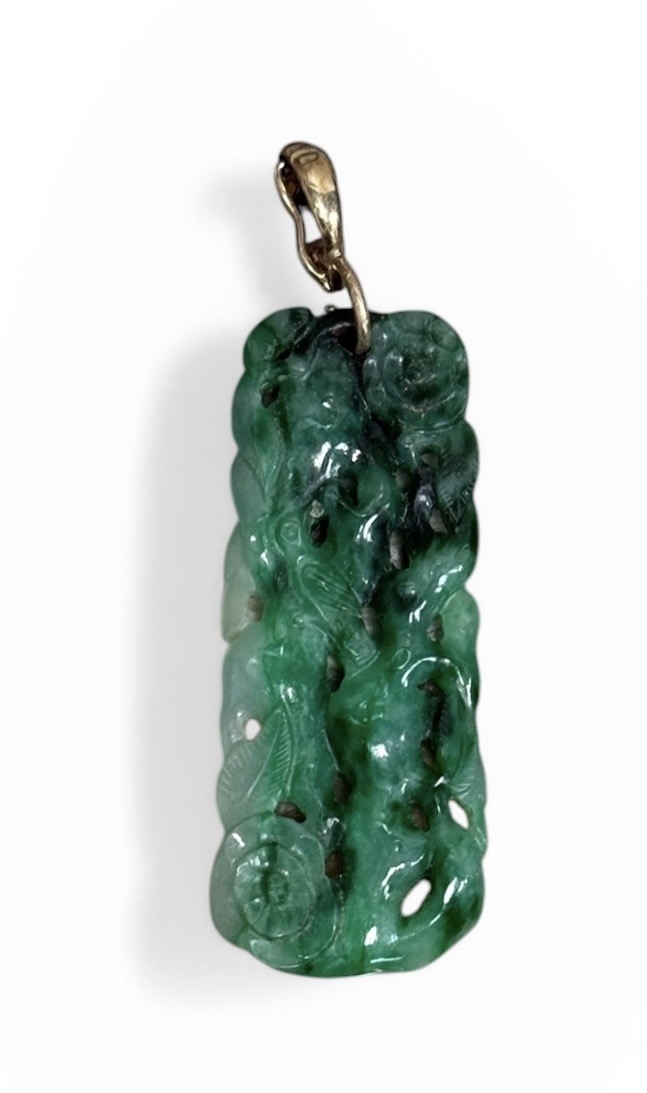 A CHINESE GREEN CARVED JADE PENDANT WITH GOLD CLASP