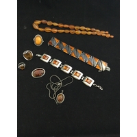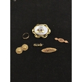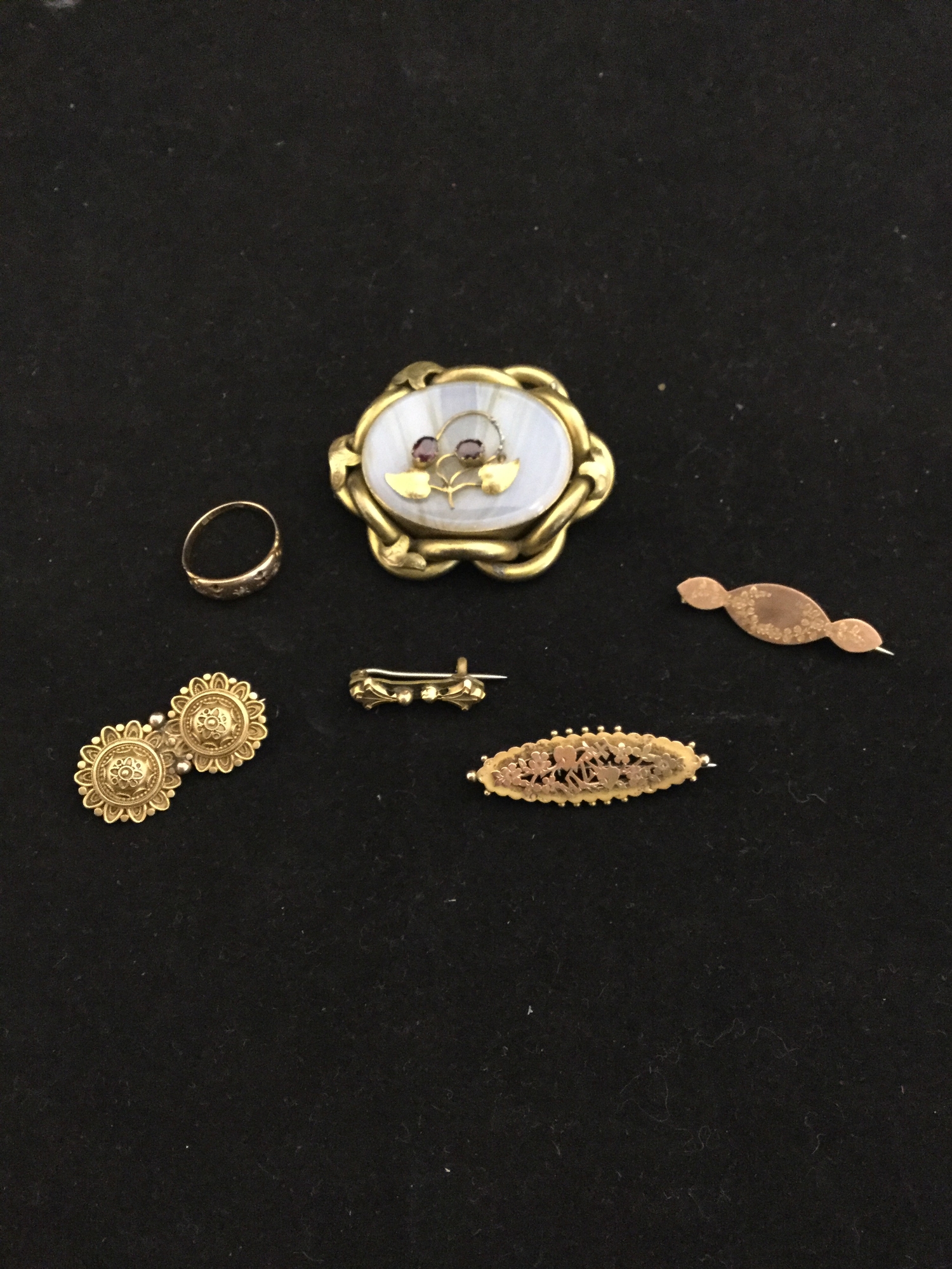 set with seed pearls and garnets, together with 9ct Mizpah brooch, another 9ct brooch, Victorian chalcedony brooch etc -