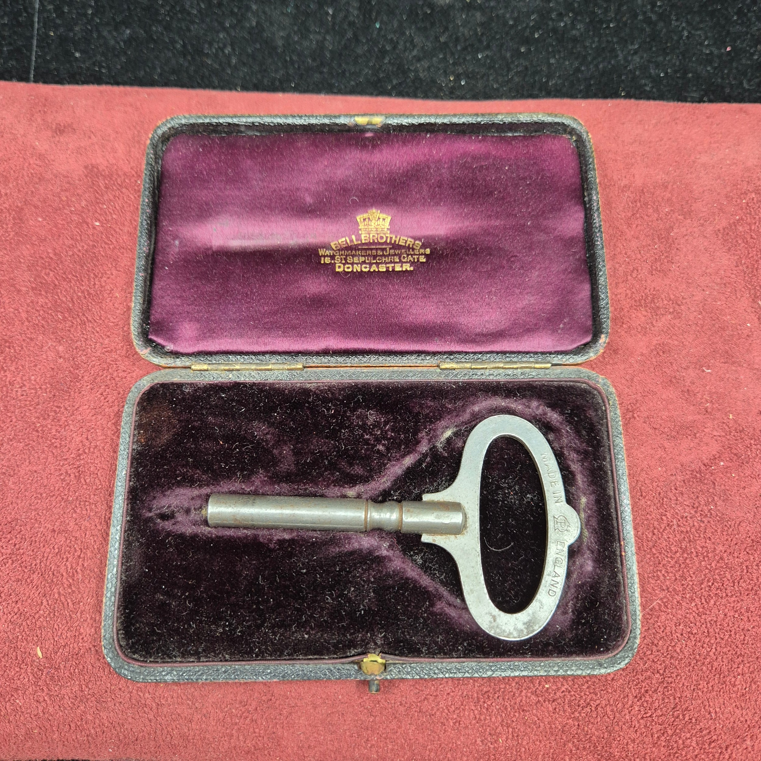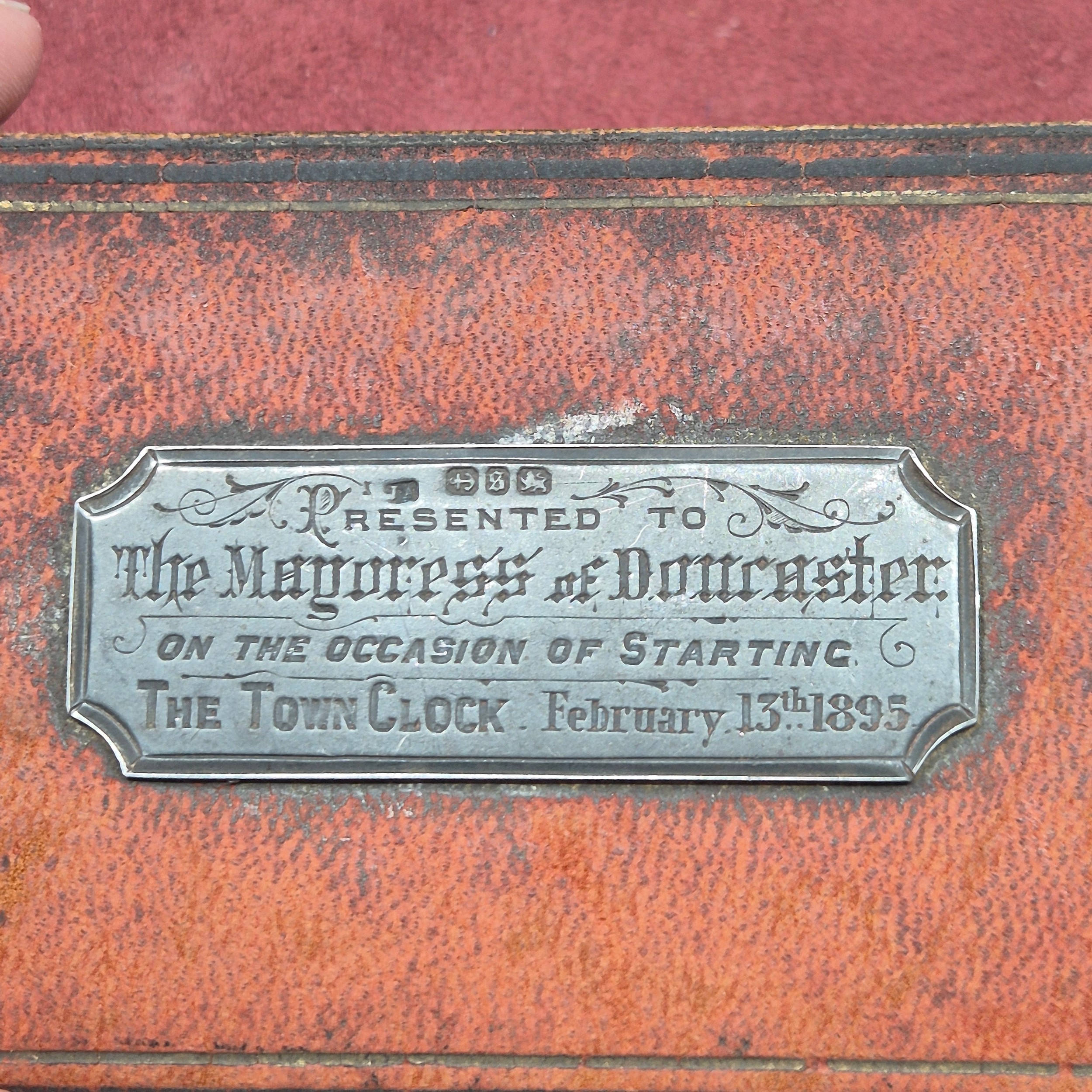 A Cased Clock Key with Hallmarked Silver Plaque to "The Mayoress of Doncaster" on the Occasion of Starting The Town Clock, 1895
