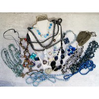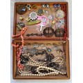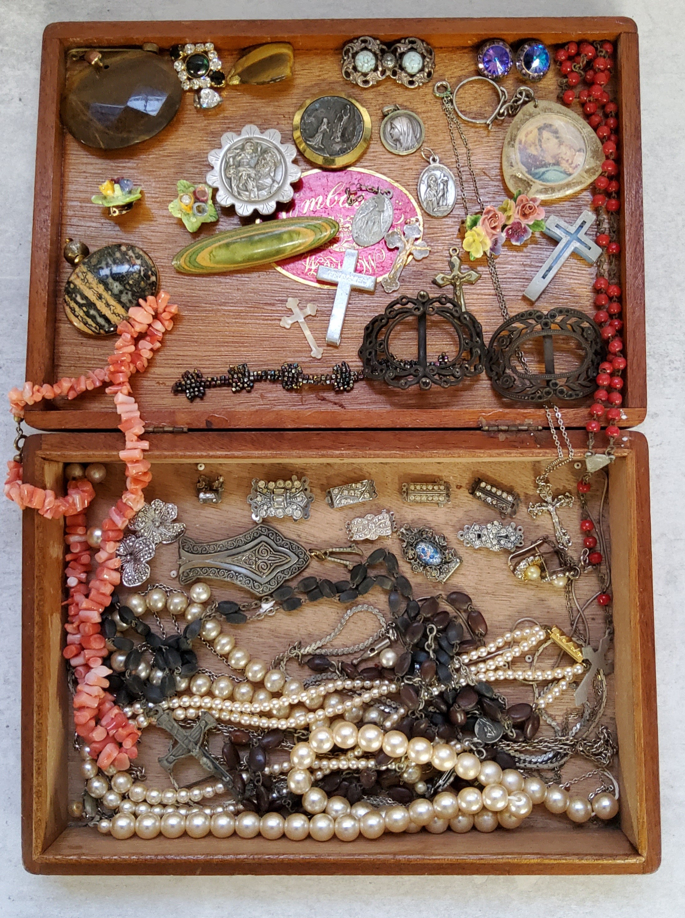 Costume jewellery including a pair of Victorian shoe buckles; tiger's eye pendants; religious & cross pendants; two faux pearl necklaces; rosary beads; earrings etc.