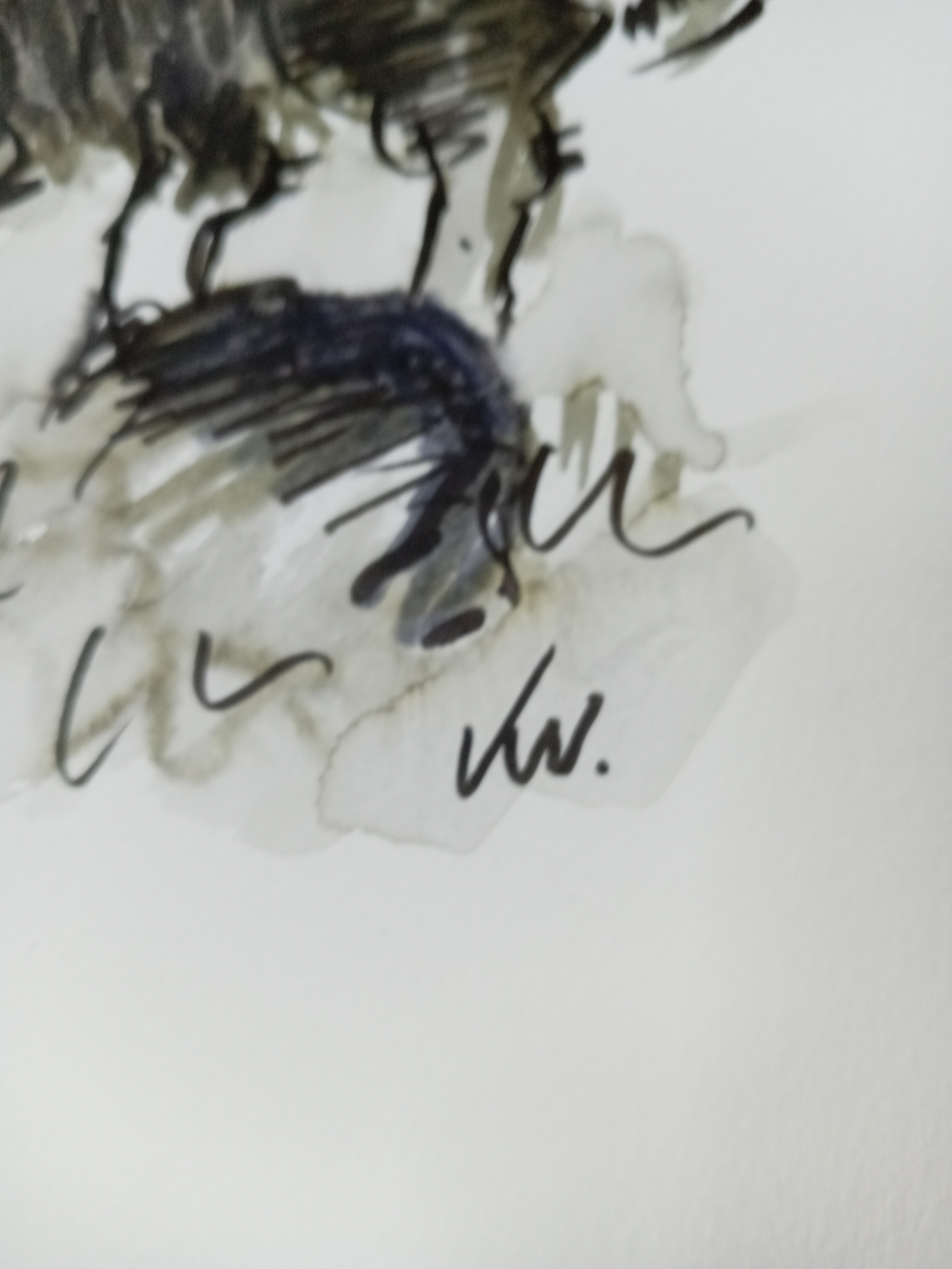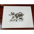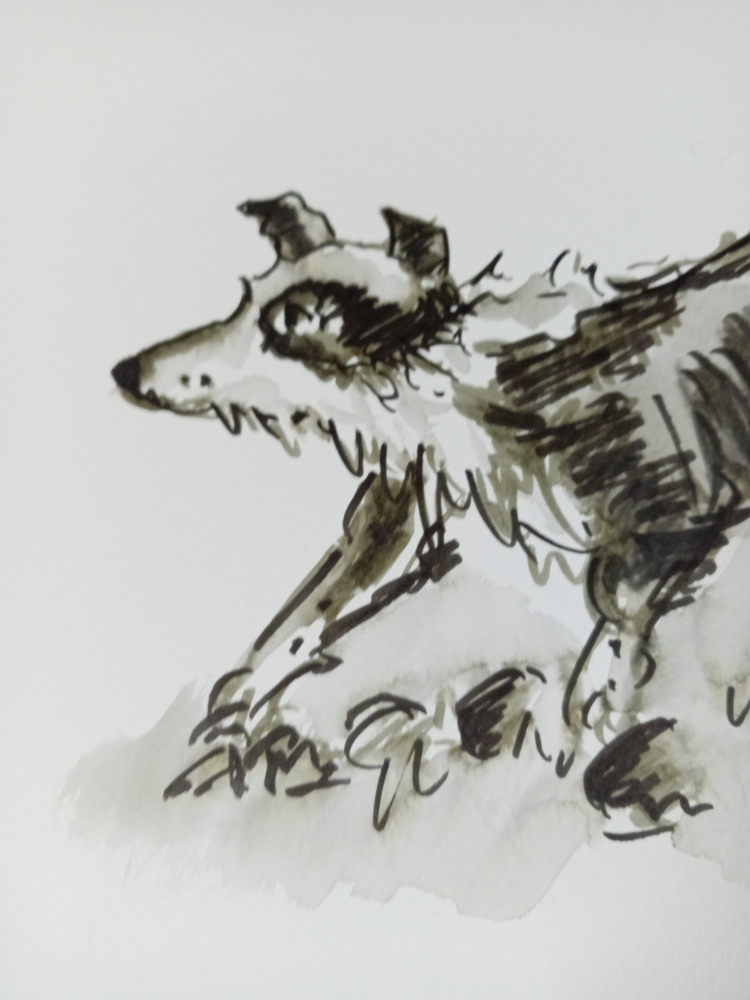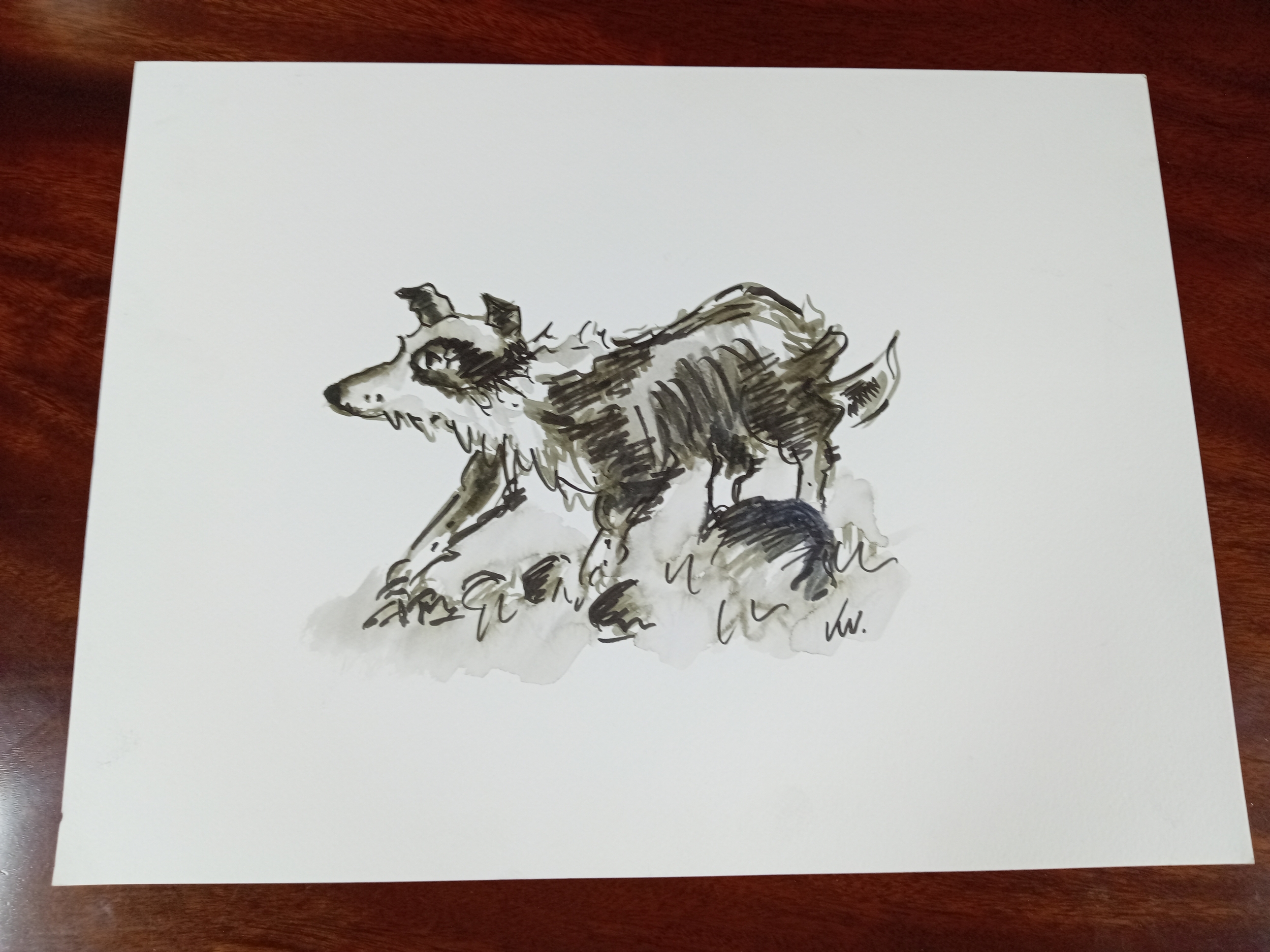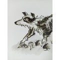An unframed pen drawing of a dog monogrammed KW thought to be Kyffin Williams. Measures 30 cm x 40 cm.