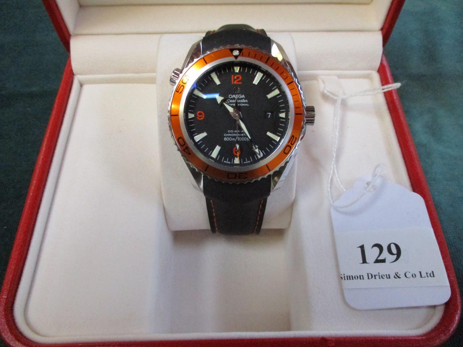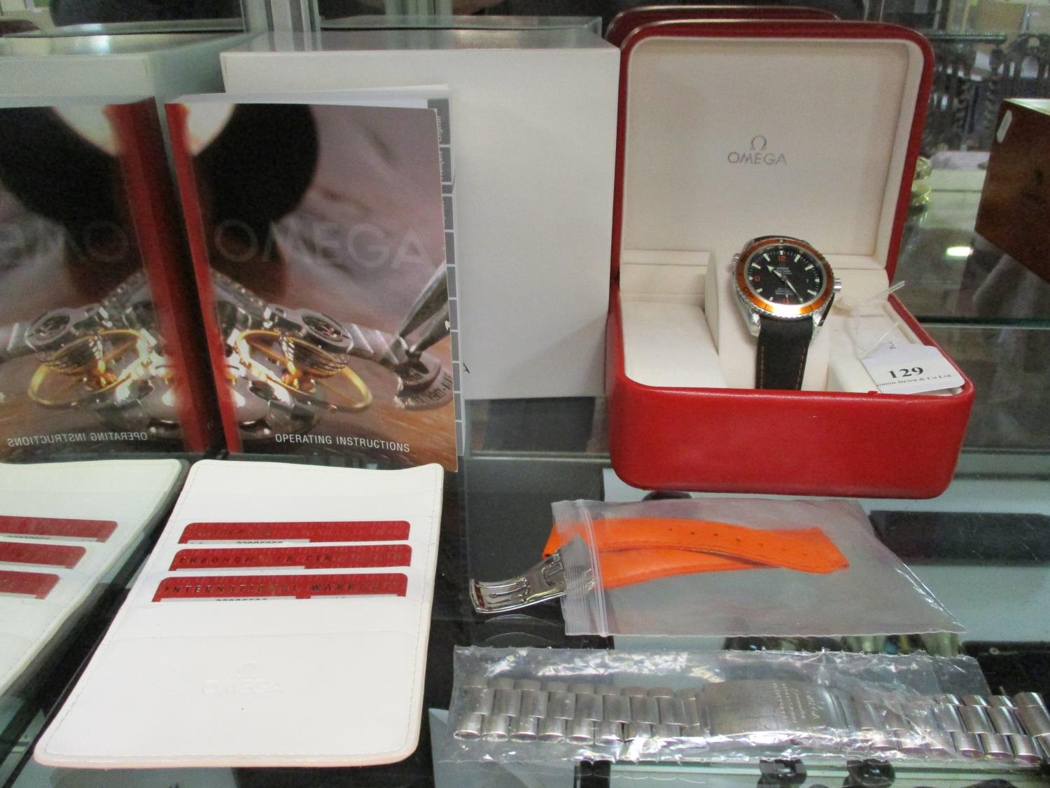 An Omega Seamaster Planet Ocean wrist watch with spare strap, box and paper work