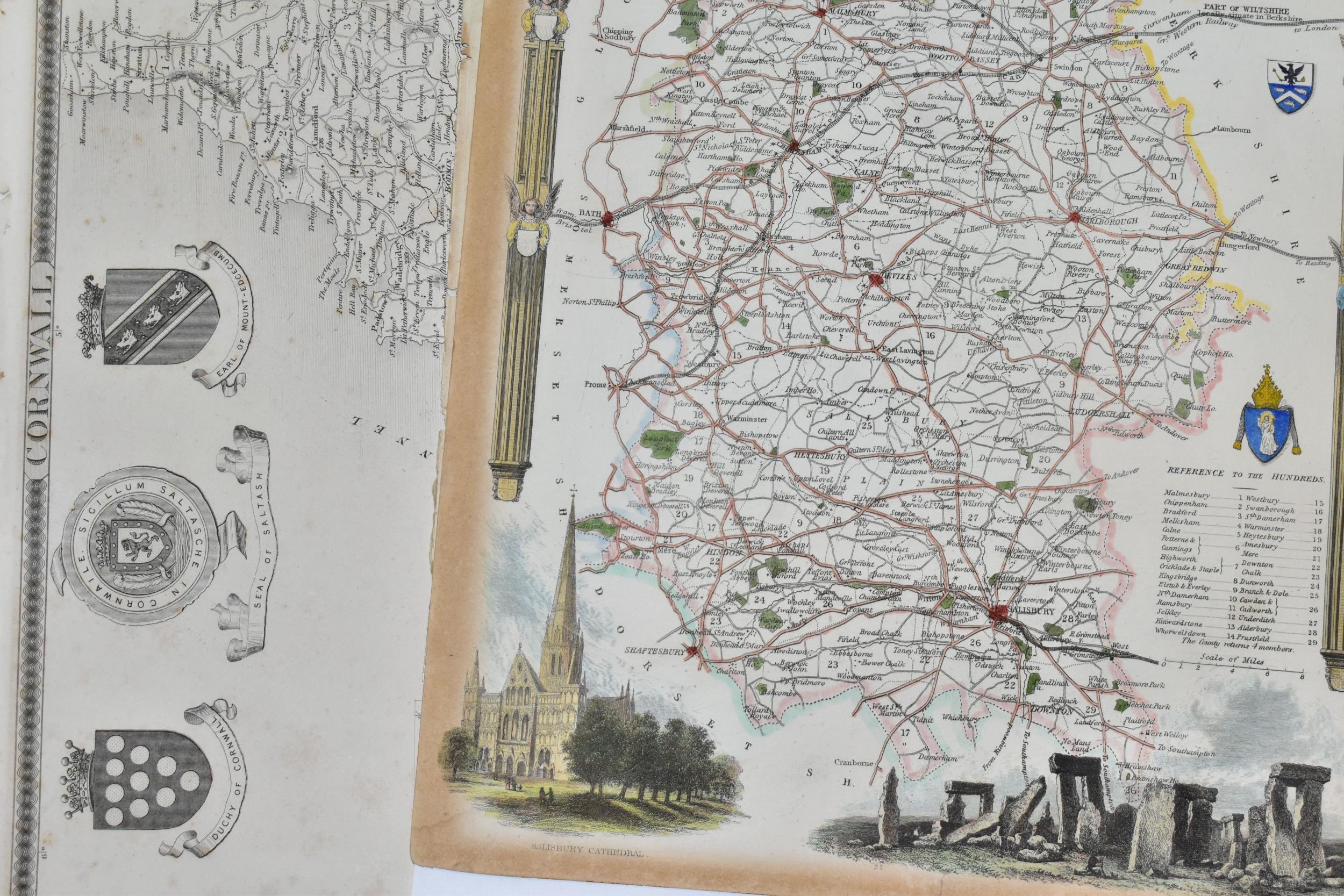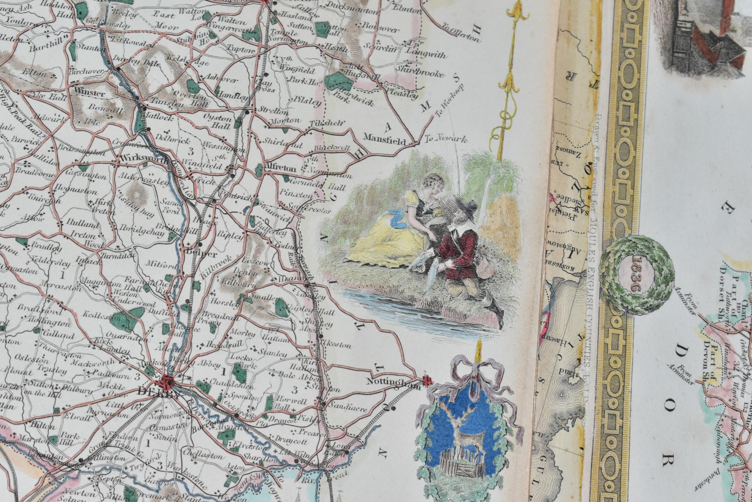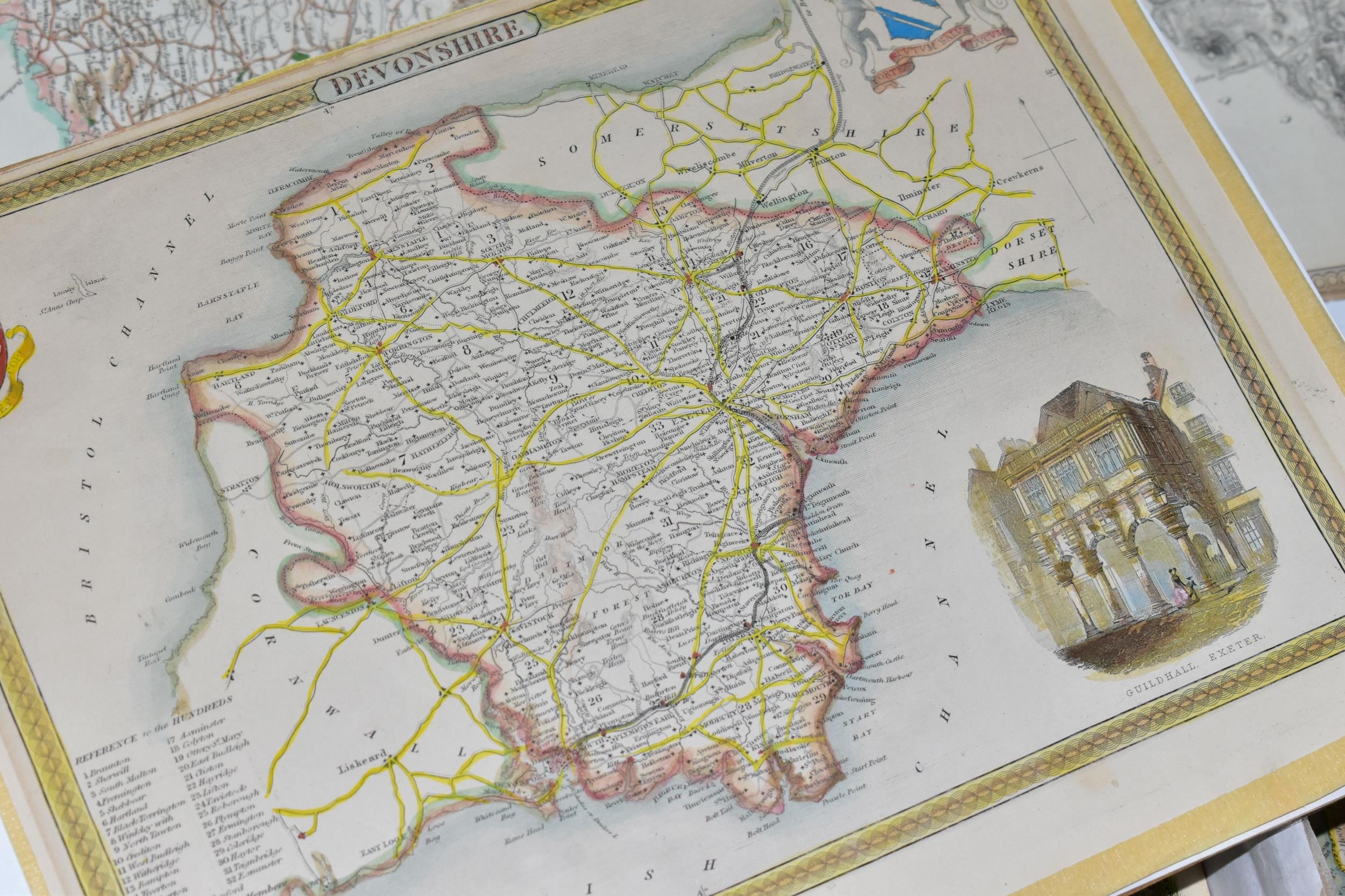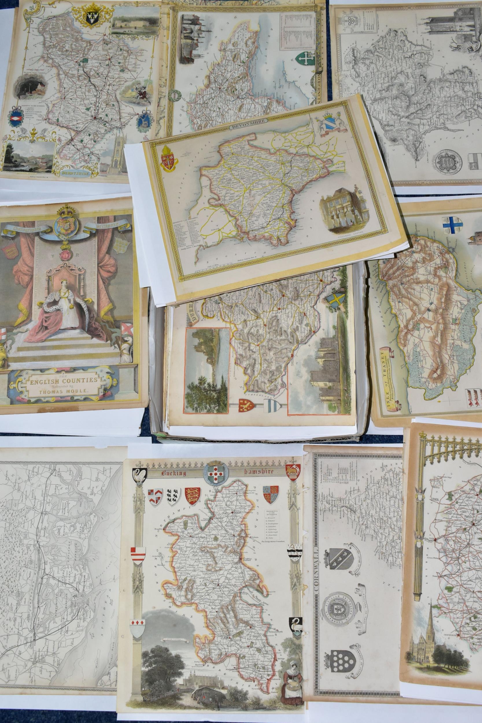 A BOX OF ANTIQUARIAN MAPS FROM 'THE ENGLISH COUNTIES, DELINEATED BY THOMAS MOULE', approximately forty eight pages, some hand tinted, some mounted onto other paper/card, counties to include Kent, Surrey, Derbyshire, Yorkshire, Cornwall and Buckinghamshire, city maps including London and Oxford, etc (1 box) (Condition Report: generally fair, some foxing, staining and tape