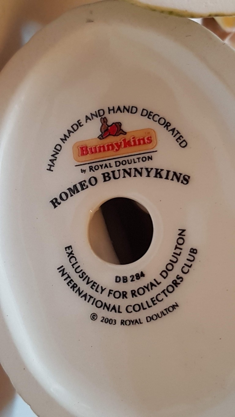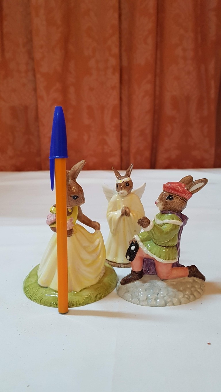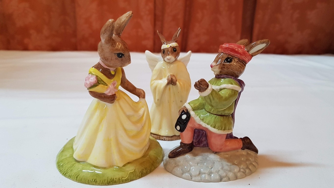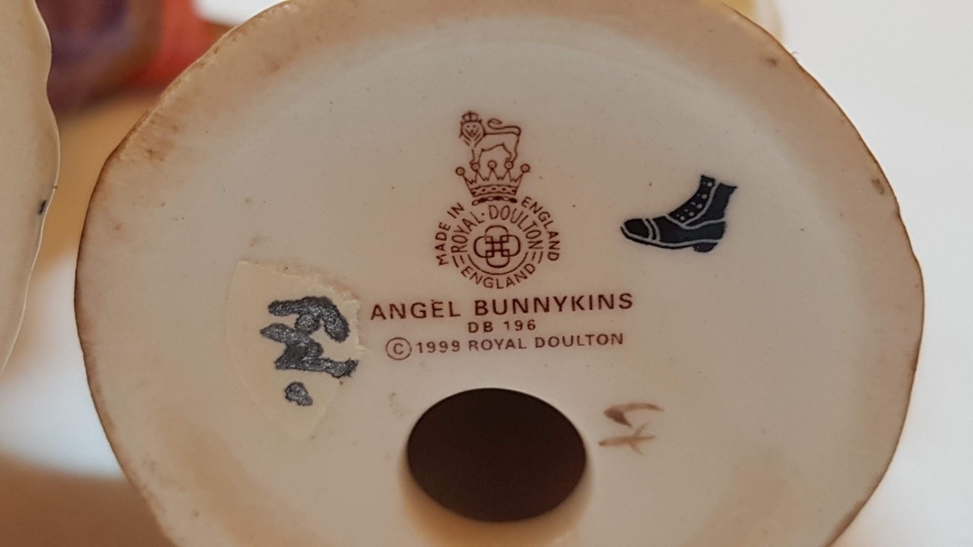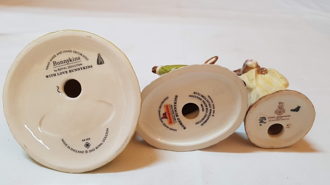 Vintage Royal Doultan 3x 'Bunnykins' Porcelain Figurines; 'Bride' with Love Bunnykins DB269, Approx. H: 11.5cm, 'Romeo Bunnykins' DB284, Approx. H: 9.5cm and 'Angel Bunnykins' DB196, Approx. H: 9.5cm, Hand Made and Hand Decorated. (2)