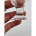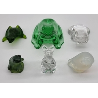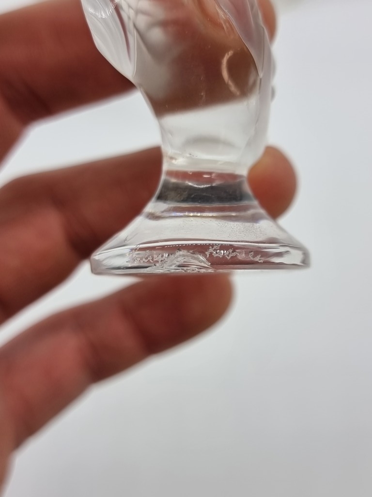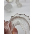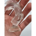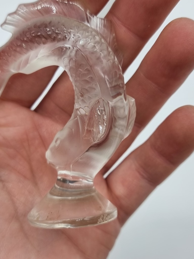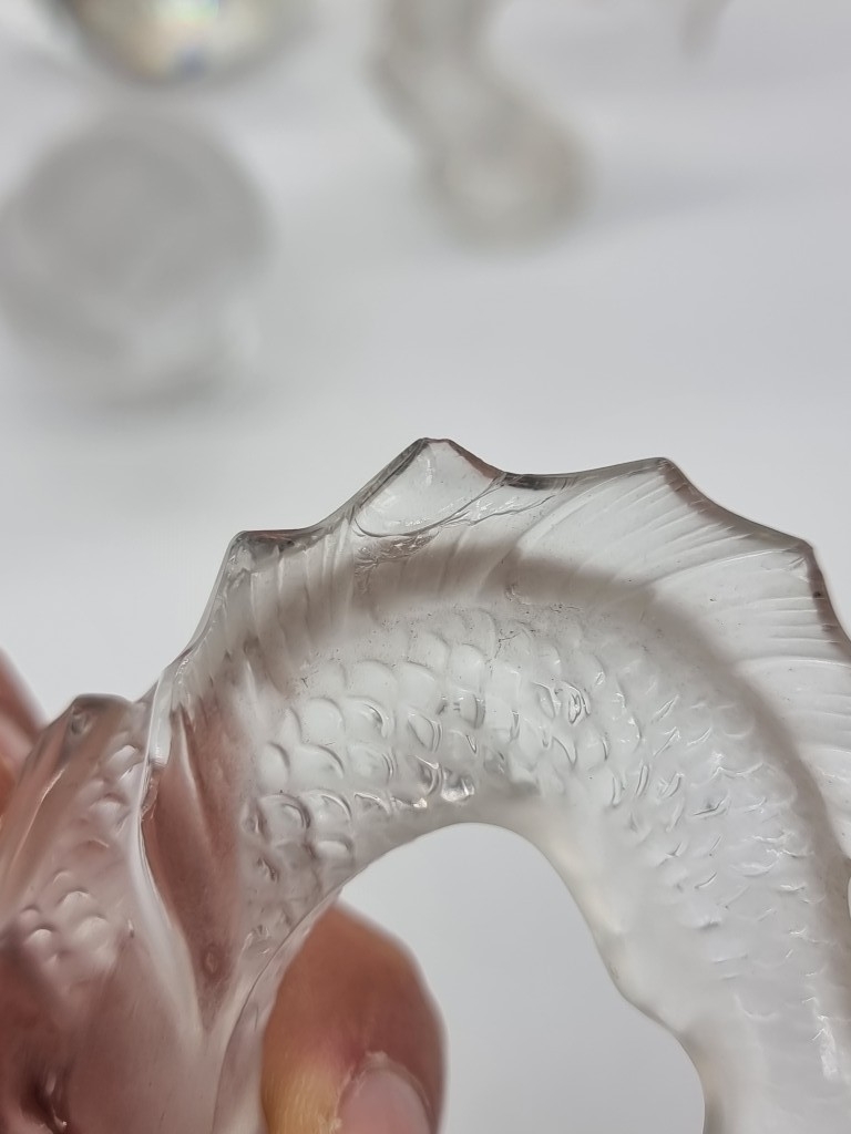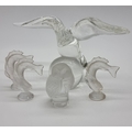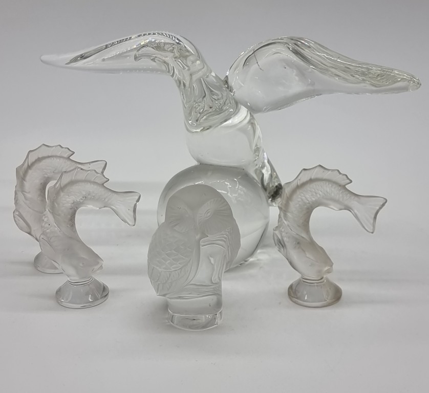 A Lalique frosted glass owl, 8.5cm high; together with three Lalique koi fish, (chips to all three); and a Steuben crystal glass eagle, wingspan 30cm. (5)