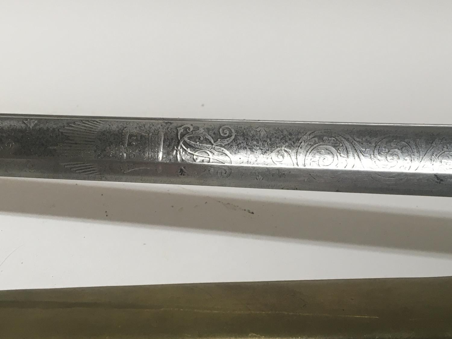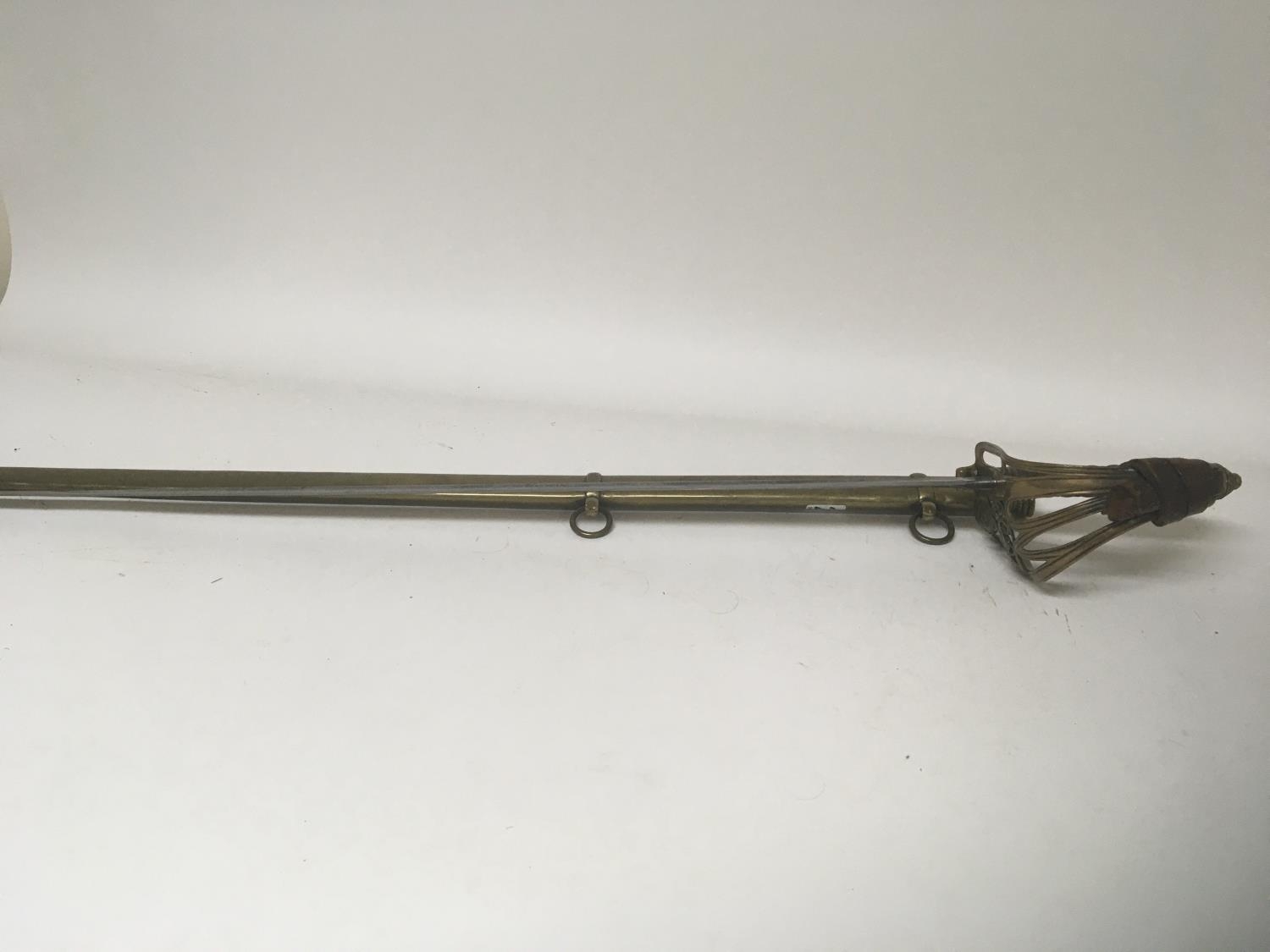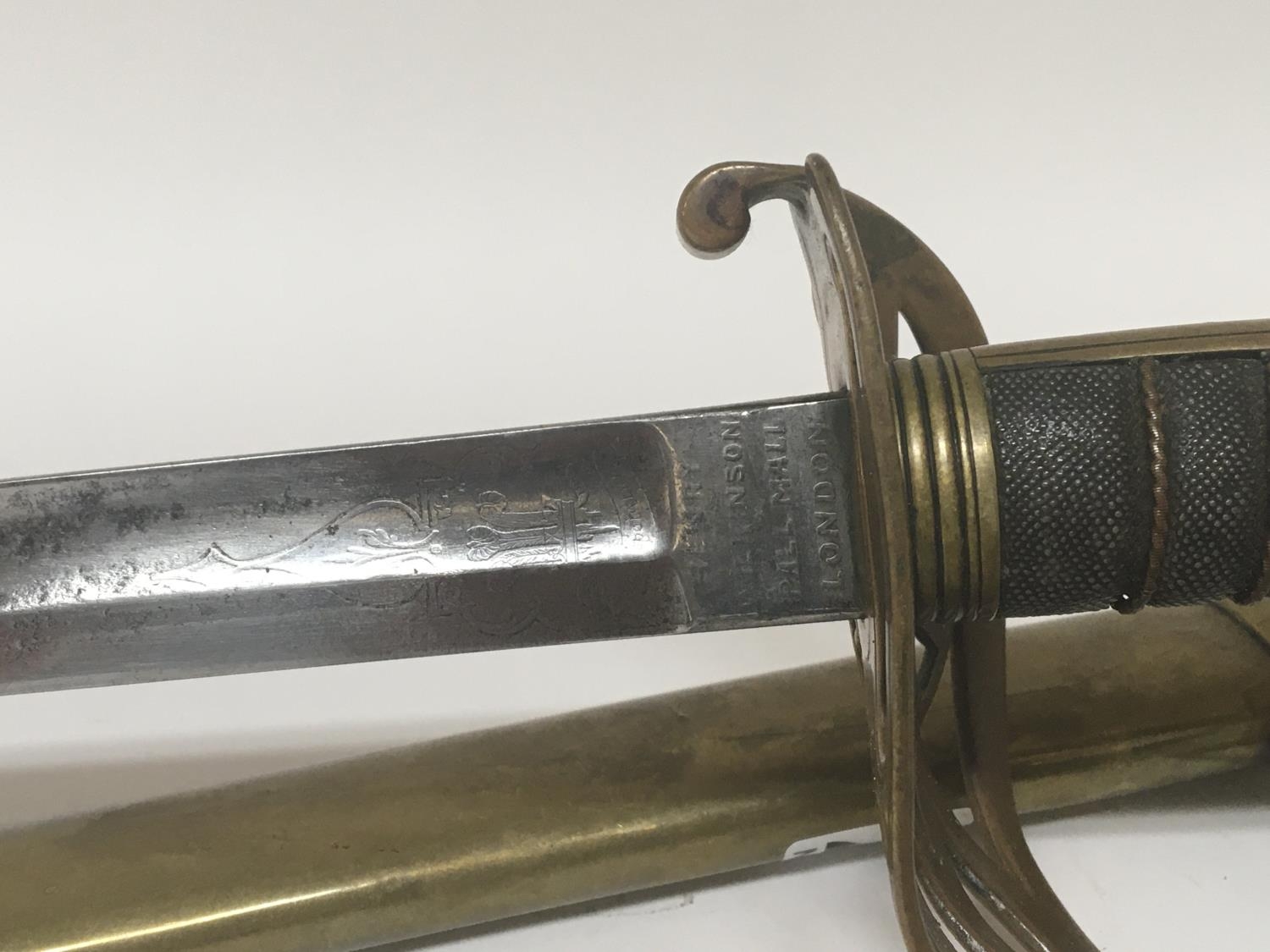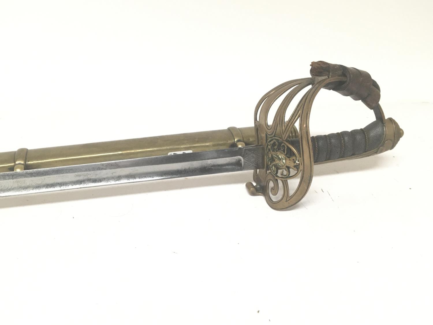 A Victorian 1845 pattern officers sword the brass hilt with Queen Victoria cypher maker Henry Wilkinson Pall Mall London with an engraved blade brass scabbard. Length 96cm