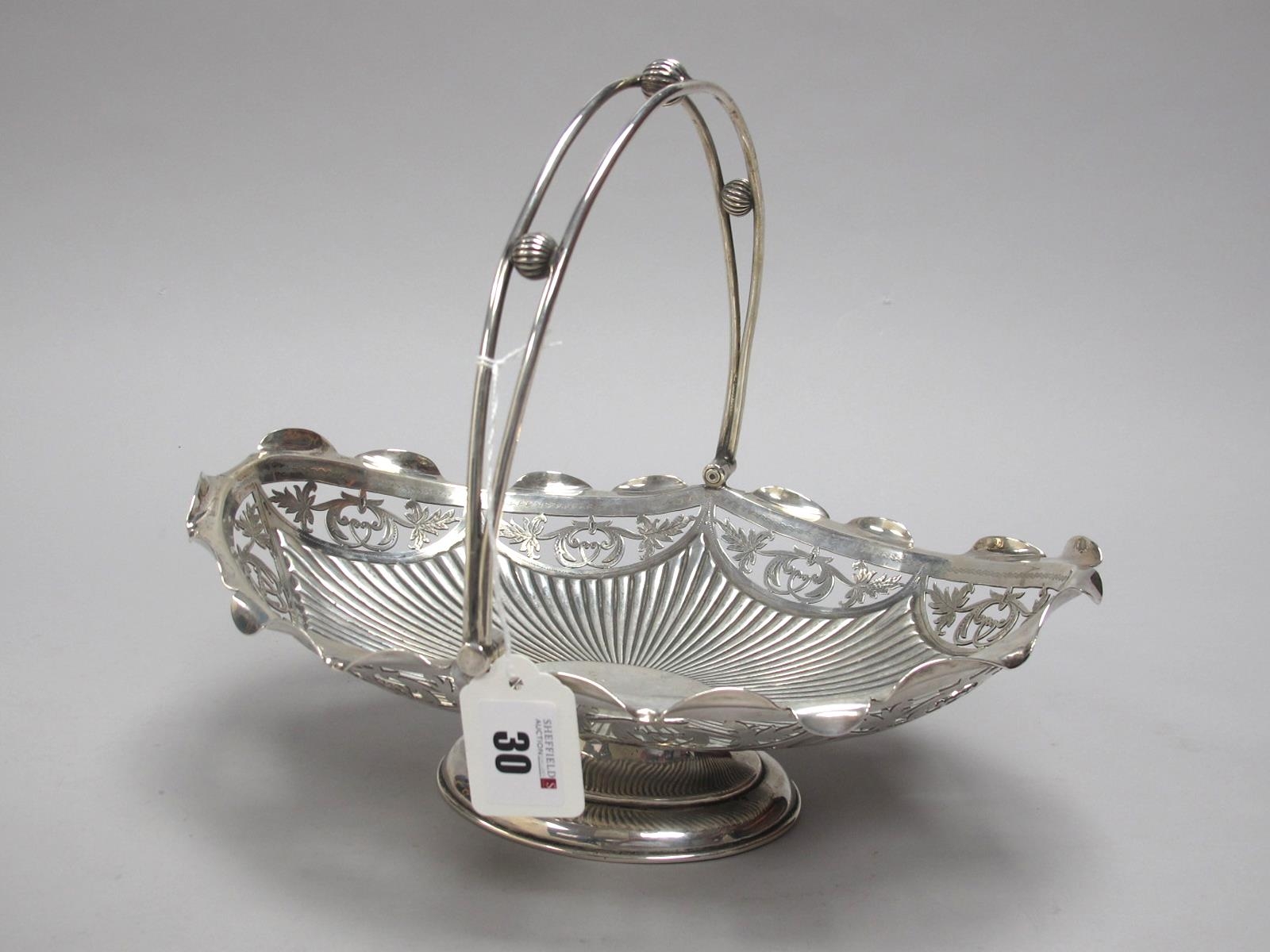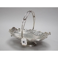 A Decorative Hallmarked Silver Swing Handled Dish, JHP, Sheffield 1900, of shaped oval form with pierced decoration and openwork swing handle, raised on oval spreading base (680grams).