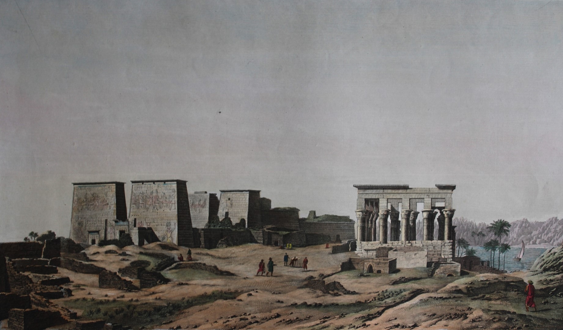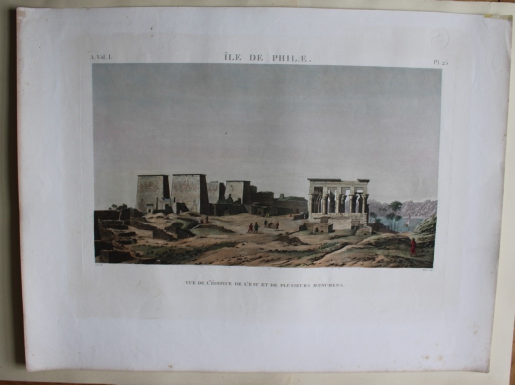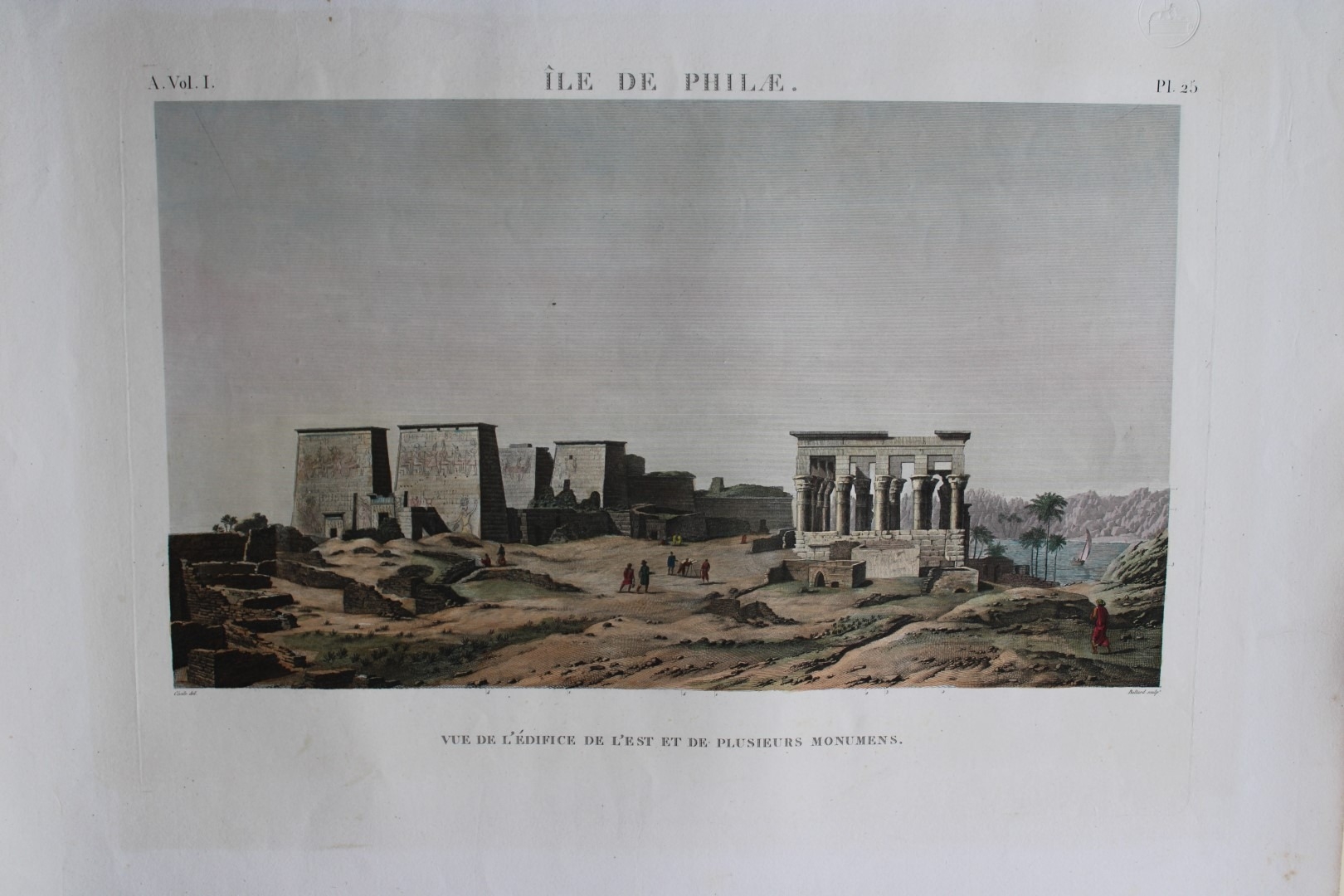 This rare coloured engraving is Plate 25 - Ile de Philee, Vue de l'édifice de l'est et de plusieurs monumens from Antiquities Volume 1 of Description de l'Égypte, ou Recueil des observations et des recherches qui ont été faites en Égypte pendant l'expédition de l'armée Française. Second edition, published in Paris by Charles L. F. Panckoucke 1820-29.