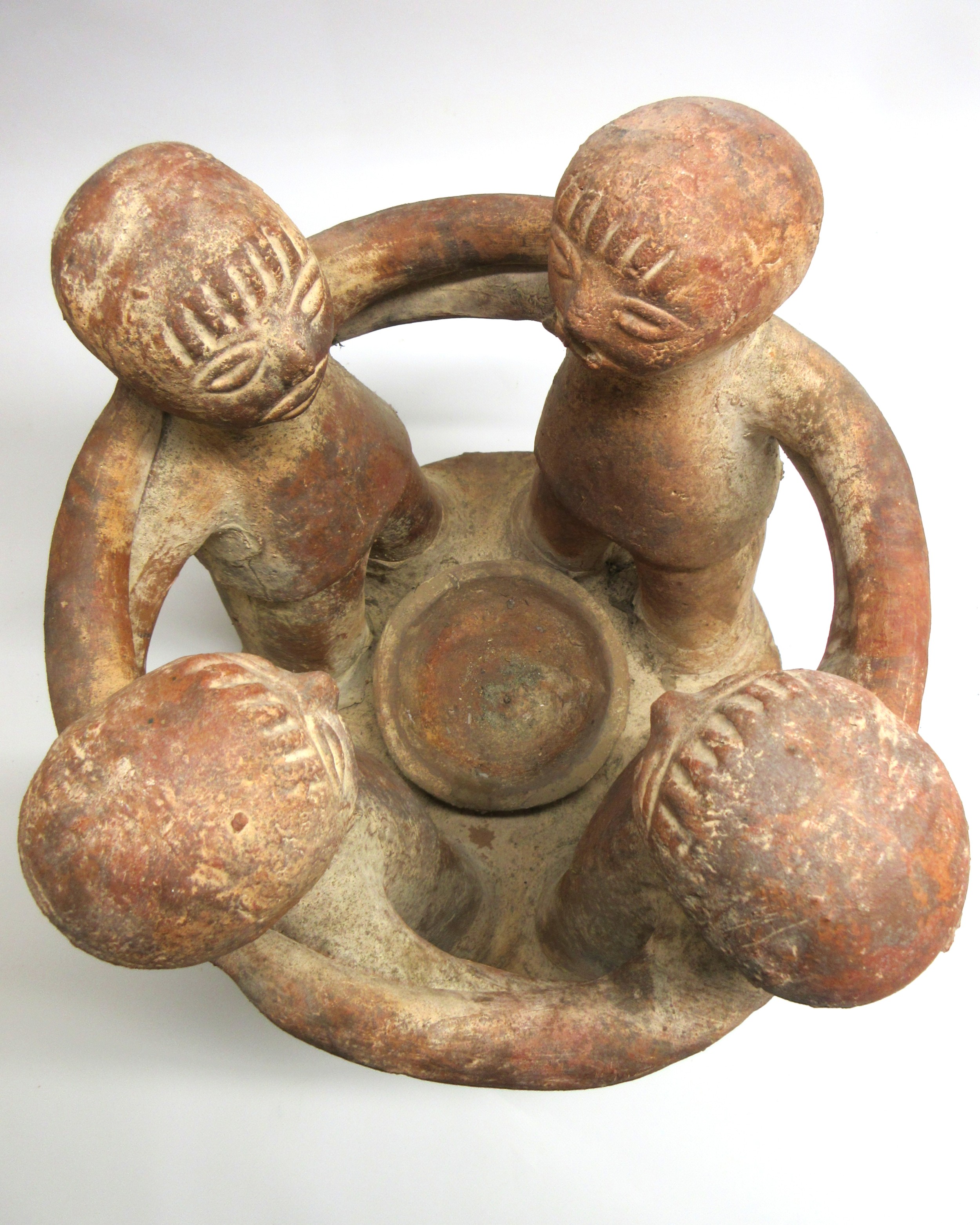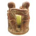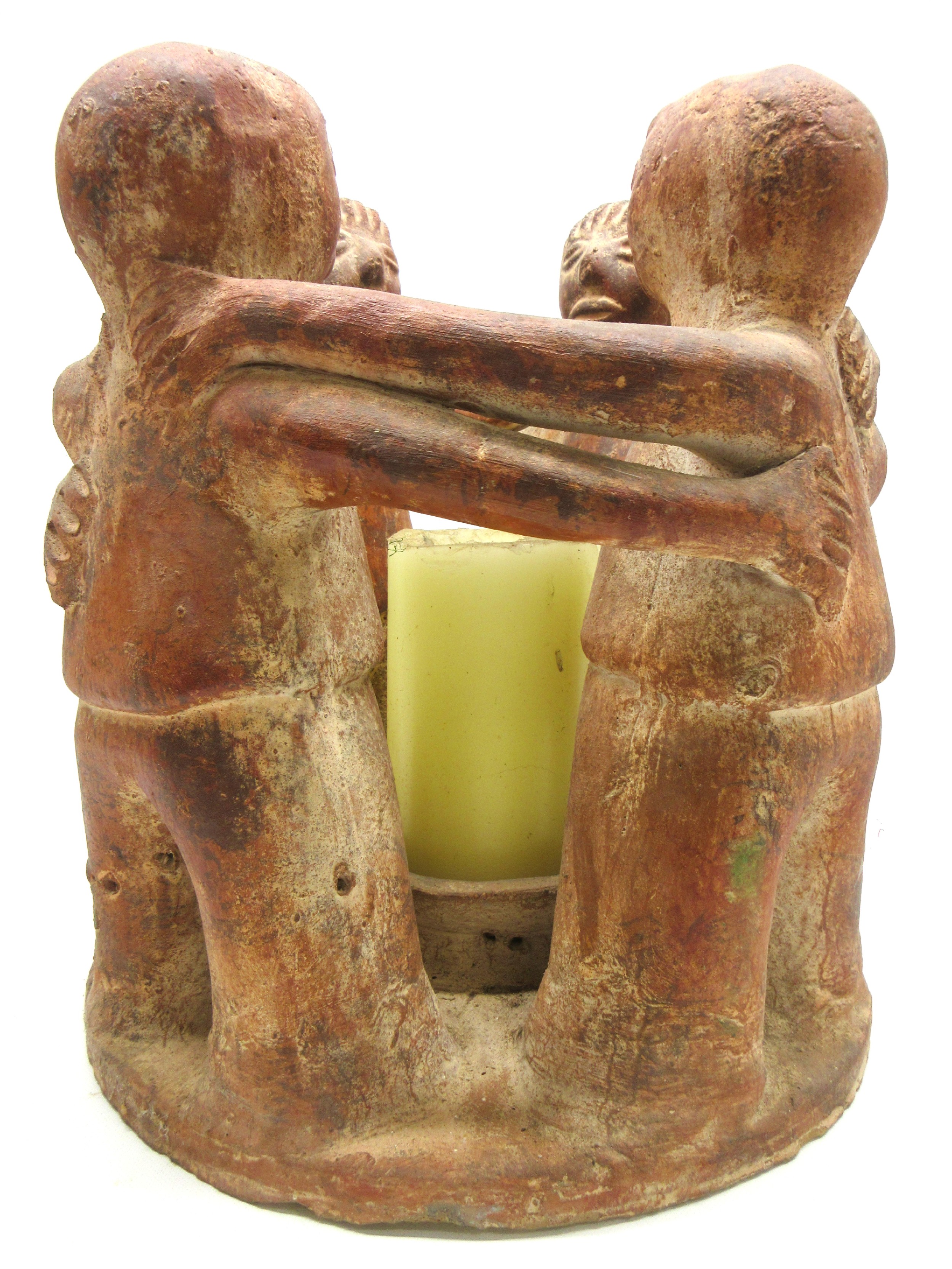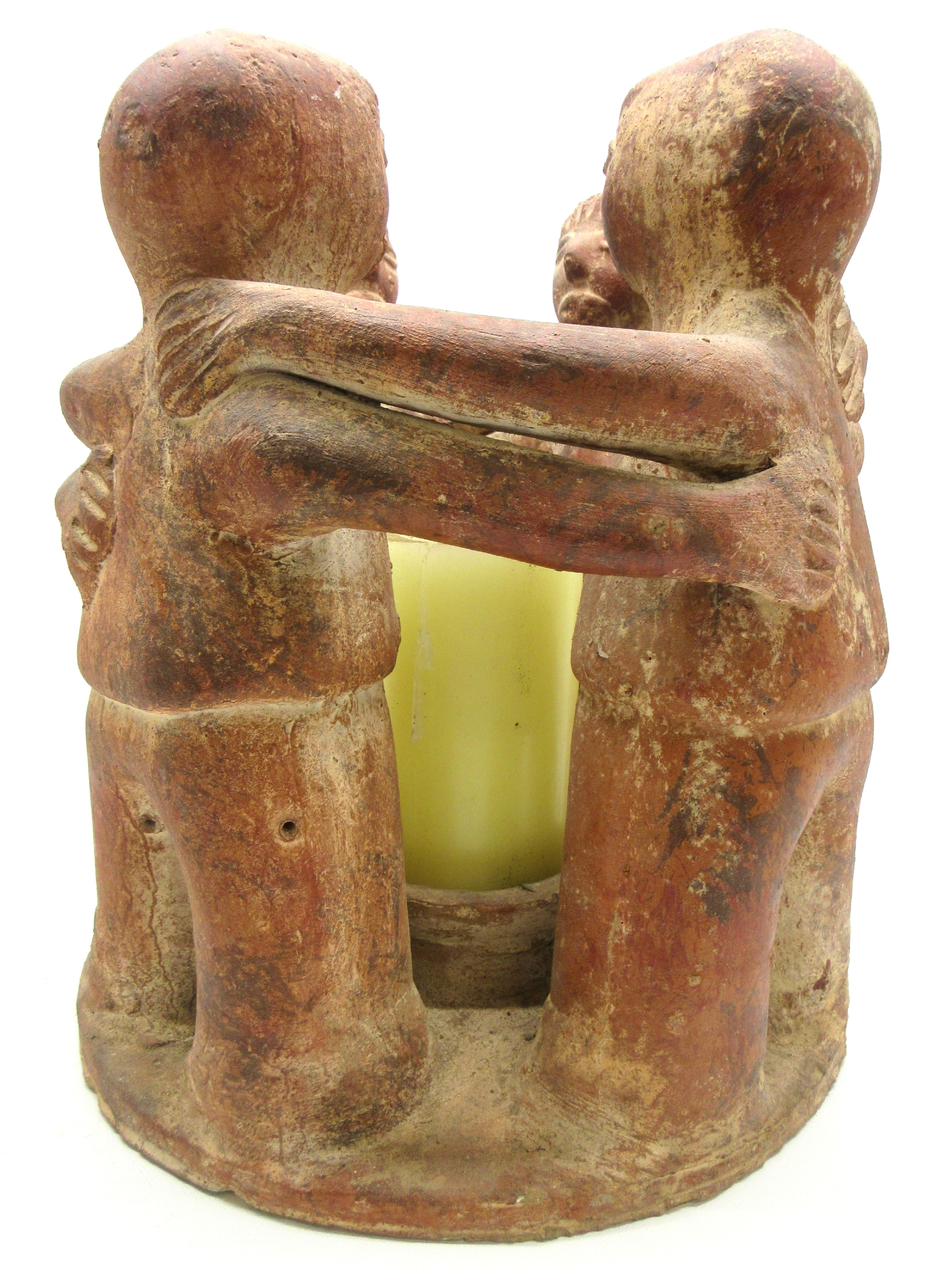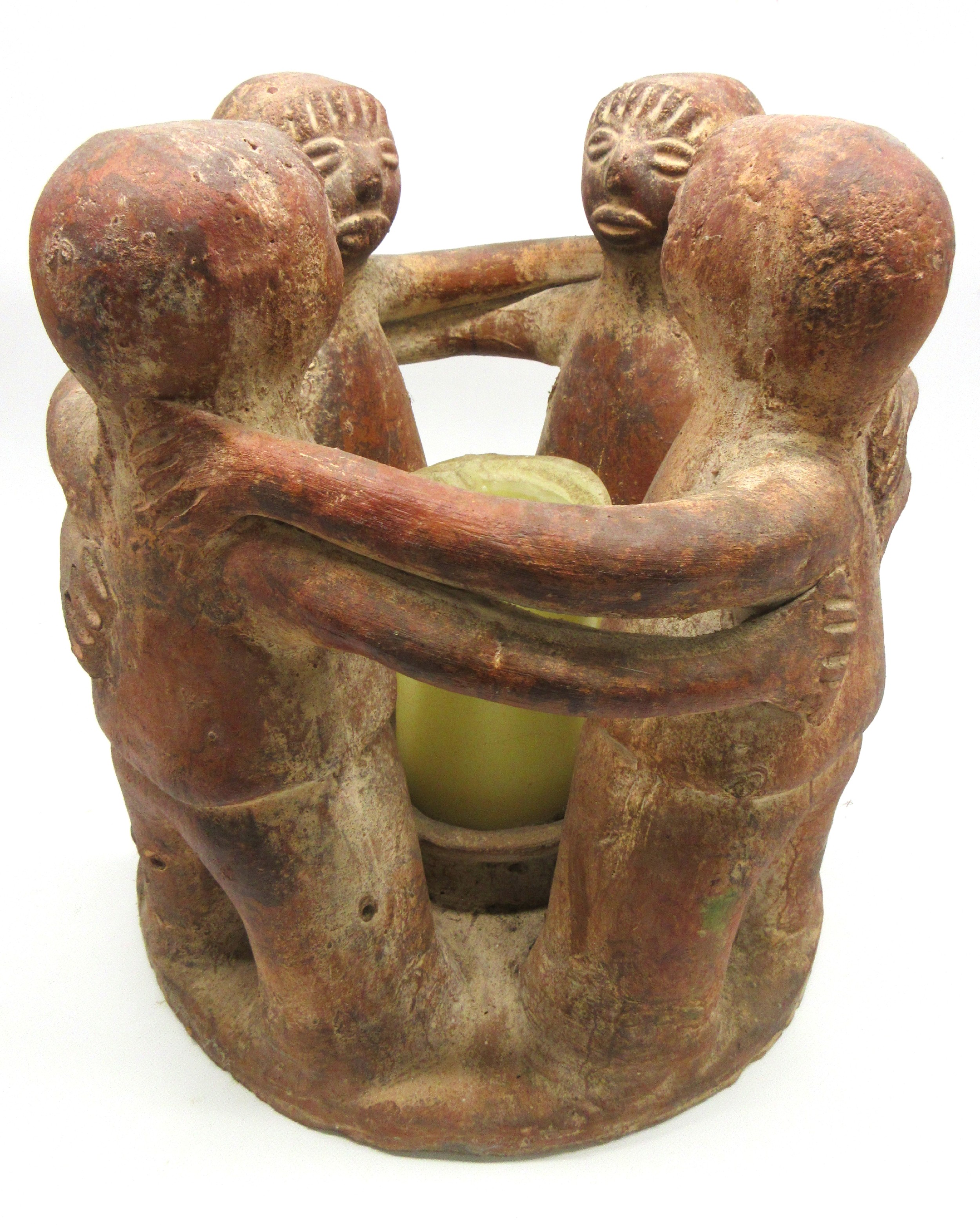 Mexican folk art terracotta sculpture/decorative object for use as a candle/copal holder featuring rich red clay with a natural weathered patina; depicting four figures encircling a central dish with pillar candle provided; traditional subject matter known as 'circle of friends', symbolising family, love & community and associated with the ancient Aztec & Mayan cultures of central Mexico; for use indoors or out, stamped verso 'Hecho en Mexico' 'Made in Mexico', approx. H 39cm x D 35cm, Qty. 1