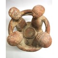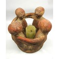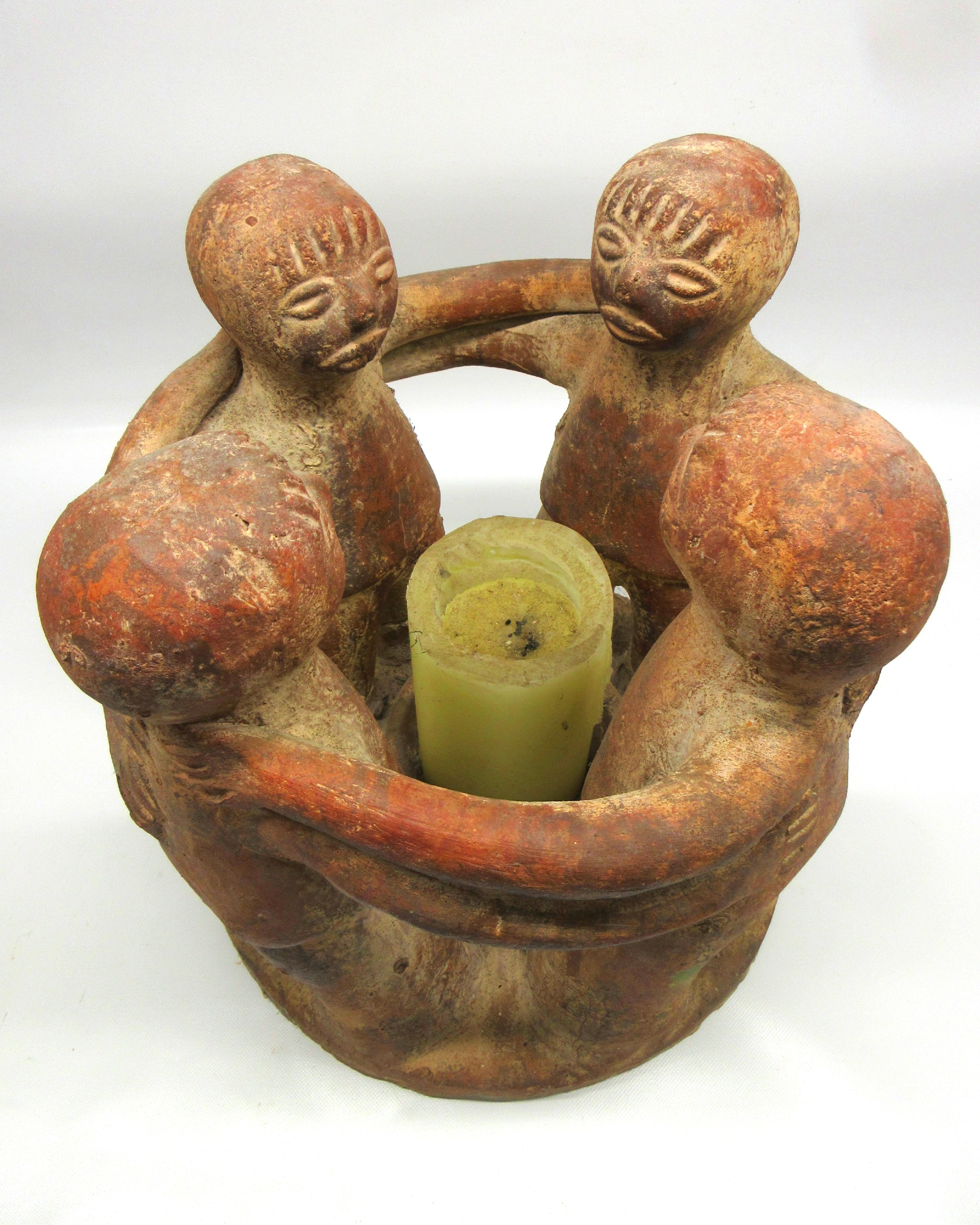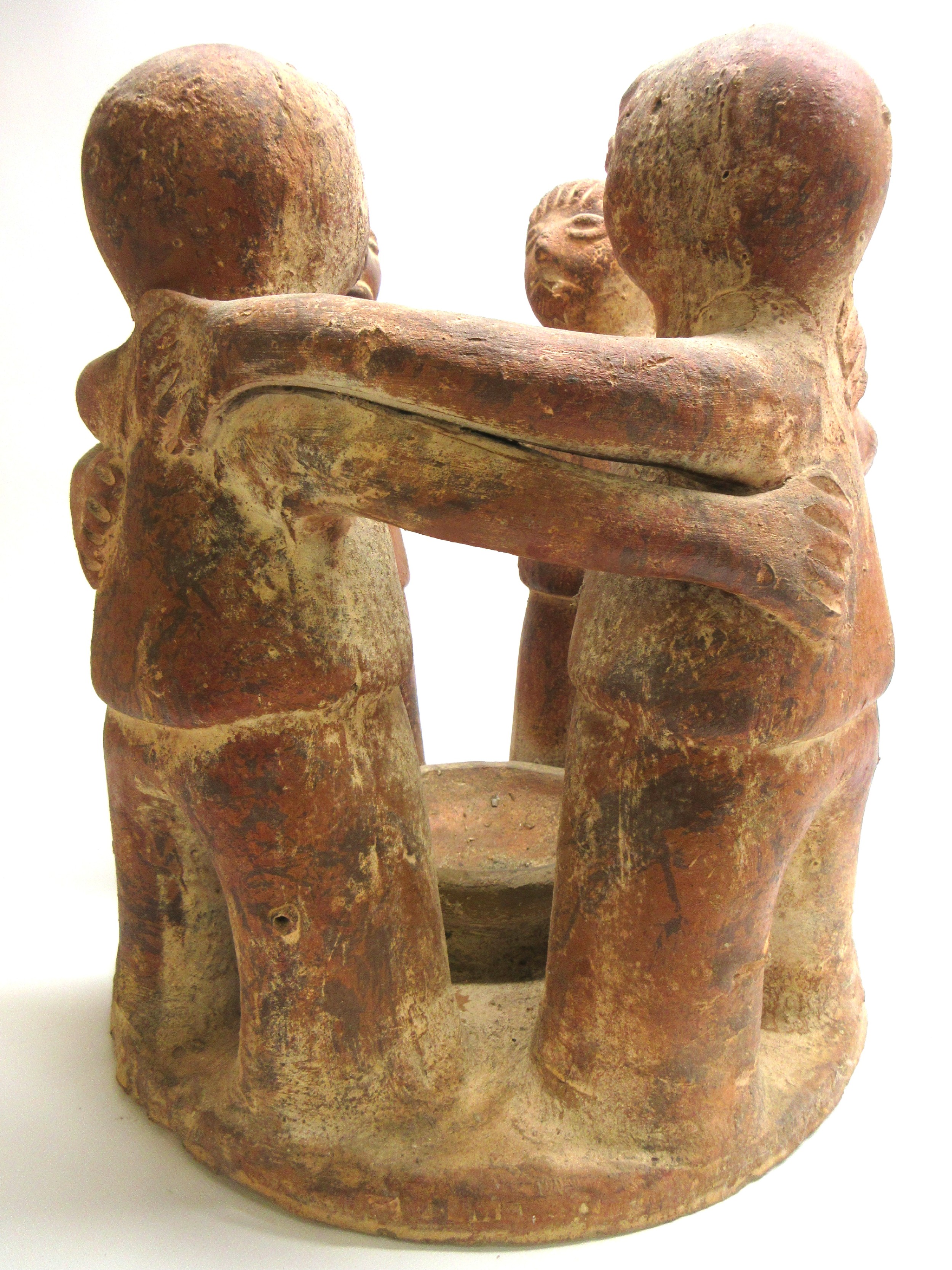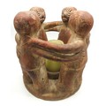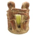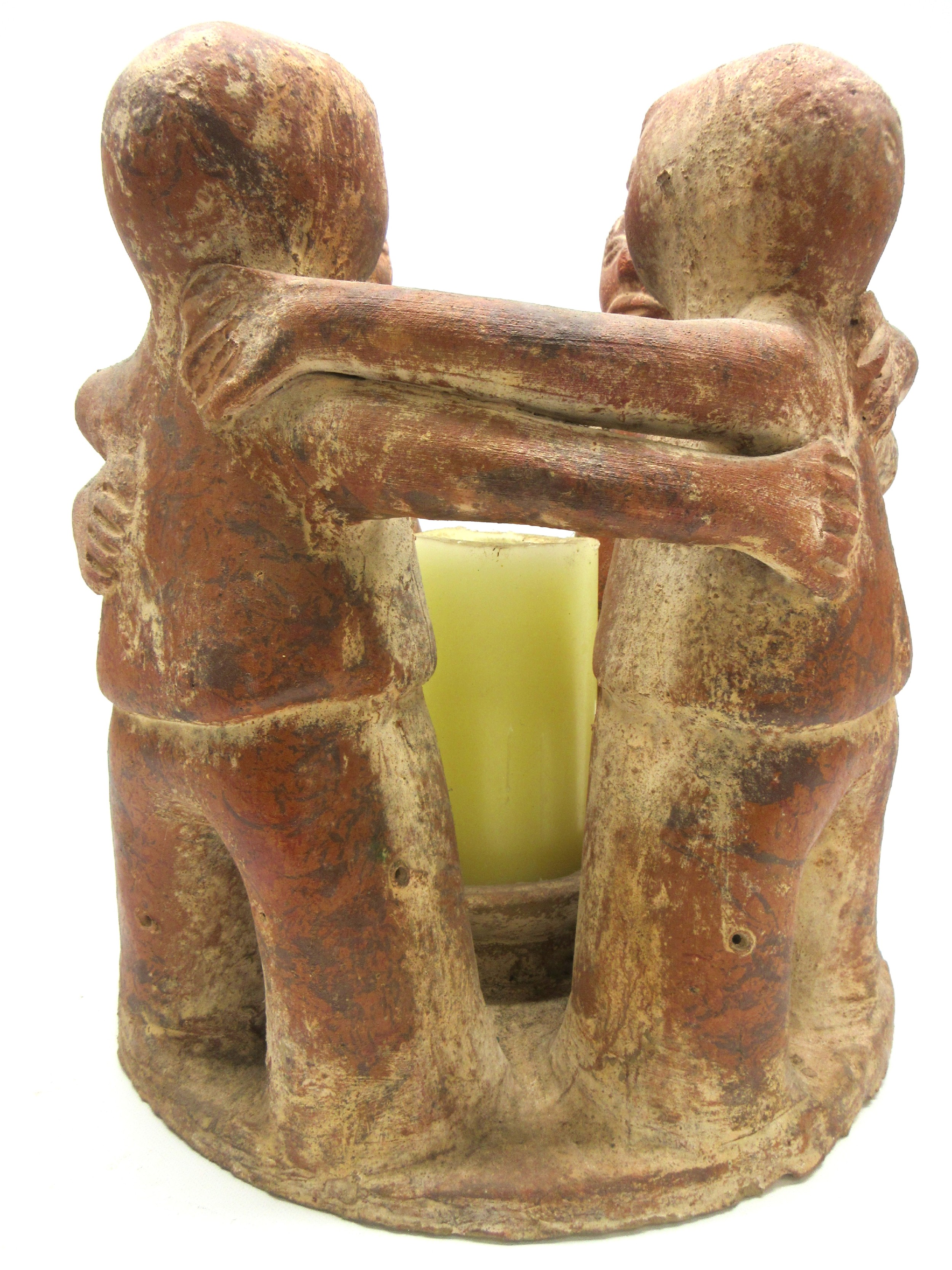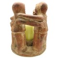 Mexican folk art terracotta sculpture/decorative object for use as a candle/copal holder featuring rich red clay with a natural weathered patina; depicting four figures encircling a central dish with pillar candle provided; traditional subject matter known as 'circle of friends', symbolising family, love & community and associated with the ancient Aztec & Mayan cultures of central Mexico; for use indoors or out, stamped verso 'Hecho en Mexico' 'Made in Mexico', approx. H 39cm x D 35cm, Qty. 1