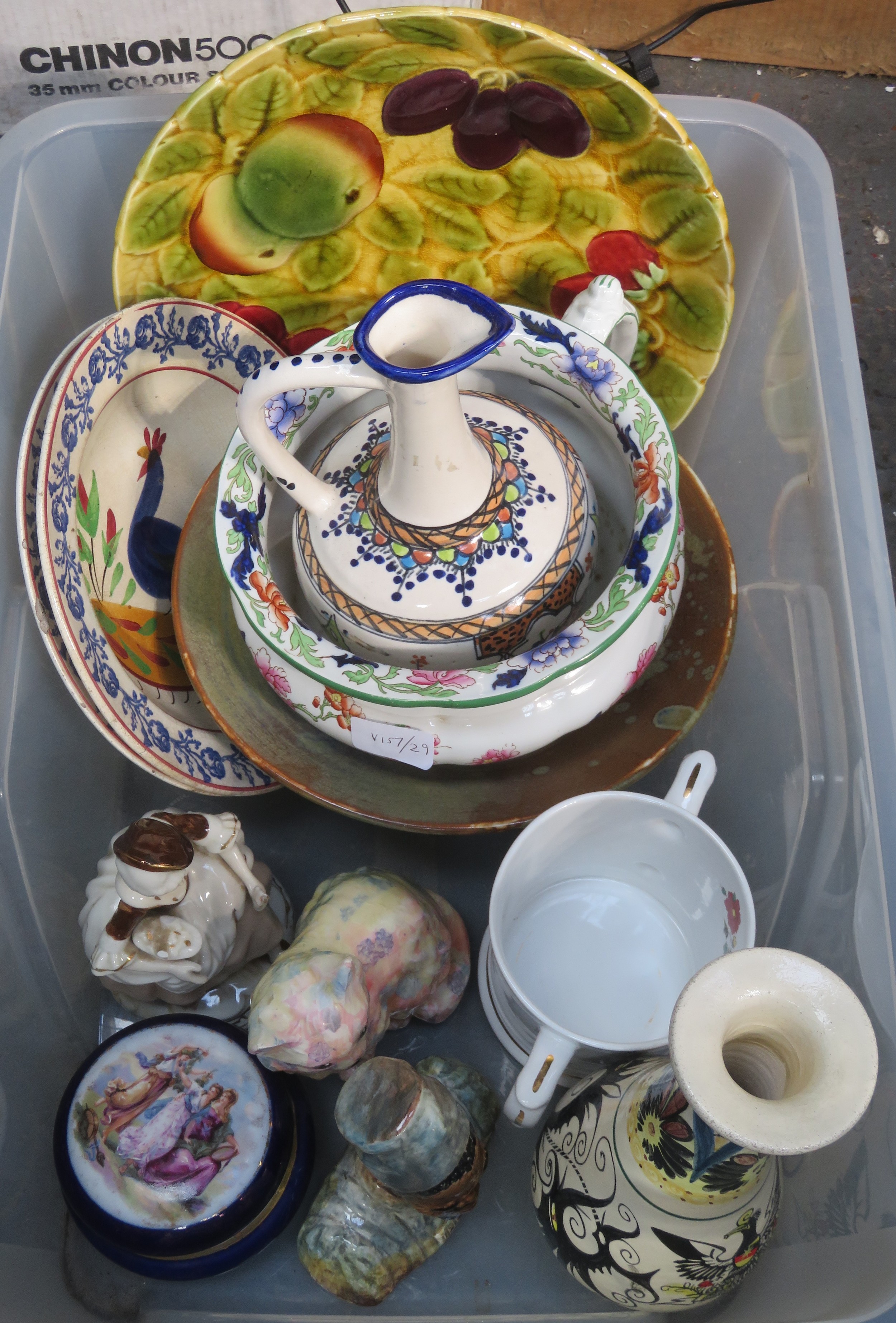 Collection of various sundry ceramics including copeland spode chamberpot, studio pottery, figures Quimper style bowls etc