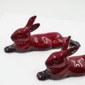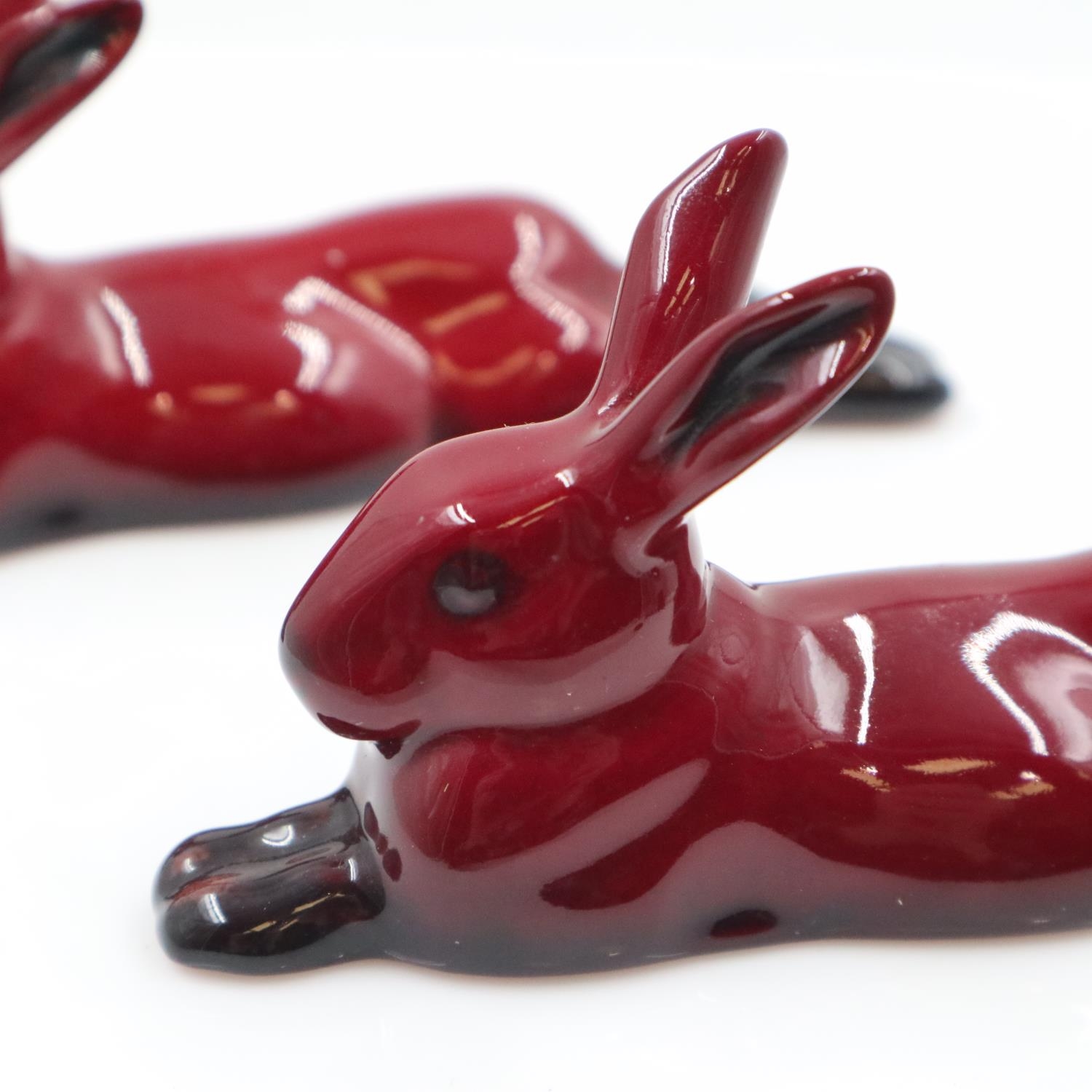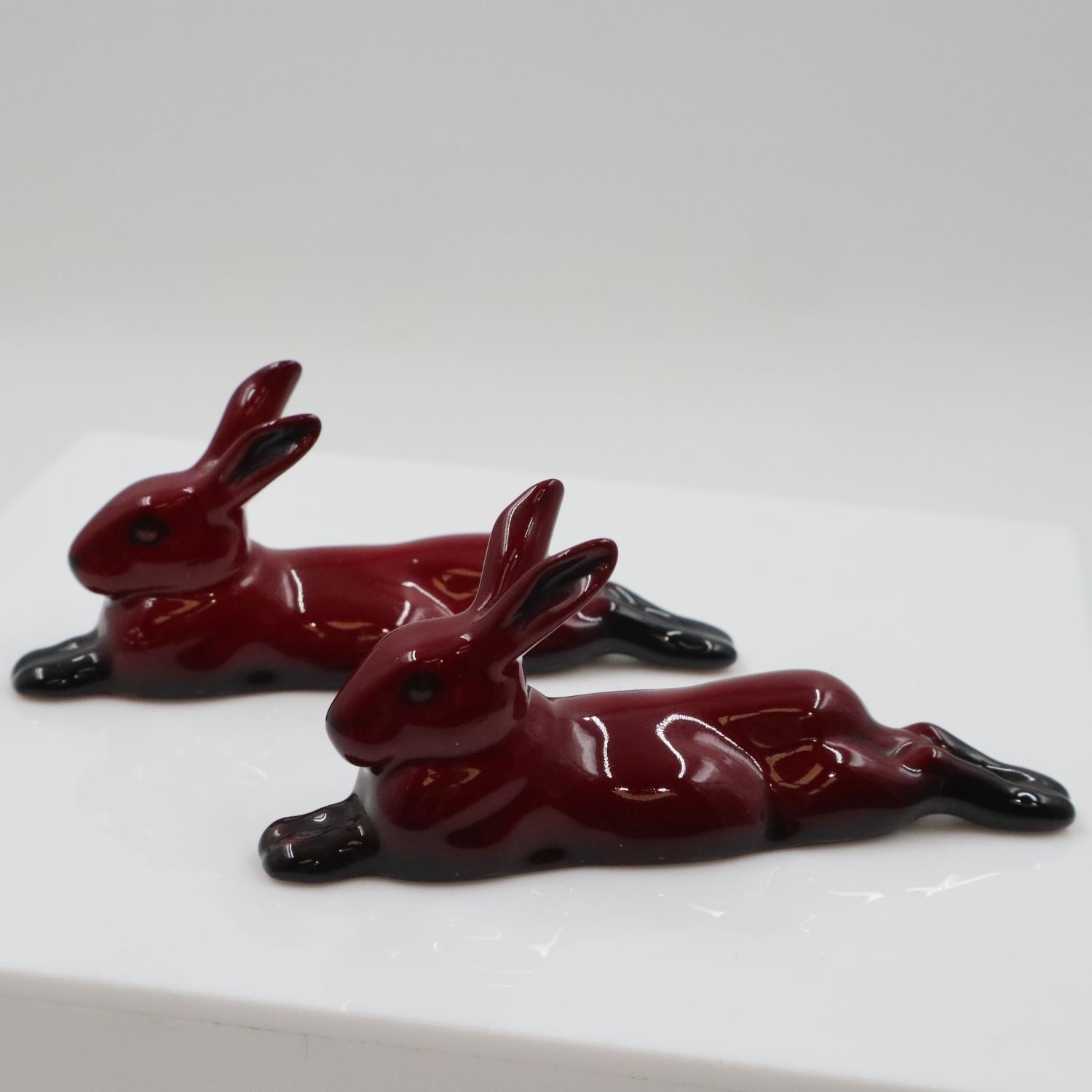 Two Royal Doulton recumbent flambé hares, no cracks or chips, L: 13 cm. UK P&P Group 1 (£18+VAT for the first lot and £2+VAT for subsequent lots)