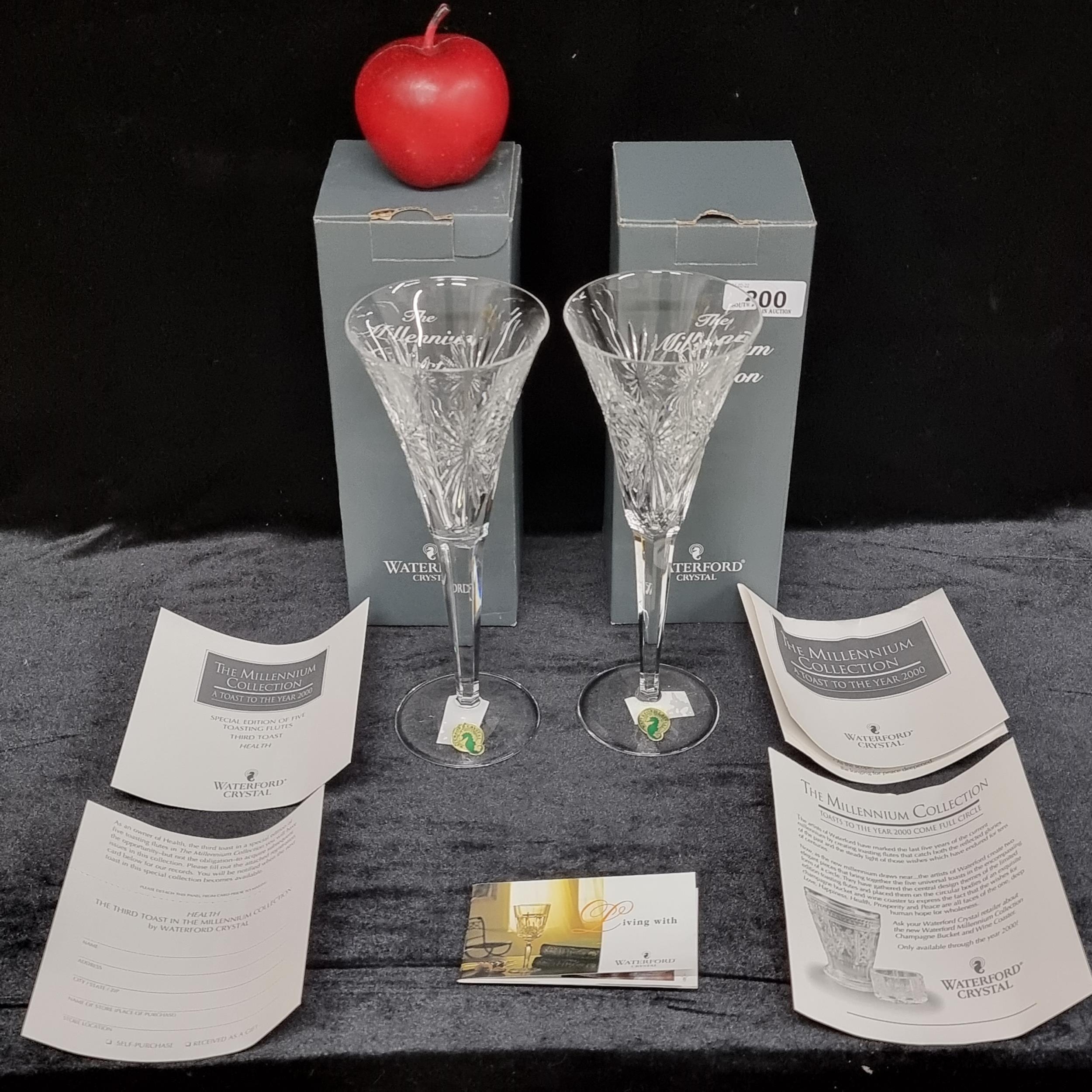 A pair of Waterford Crystal toasting champagne flutes from the "Millennium" Collection. Both in original boxes and in great condition. Circa 2000.