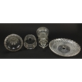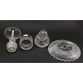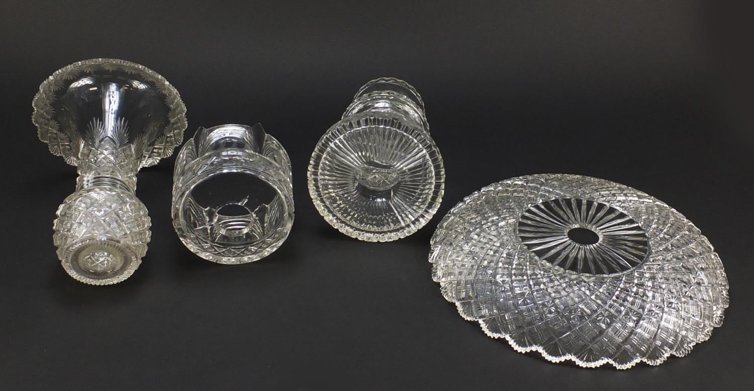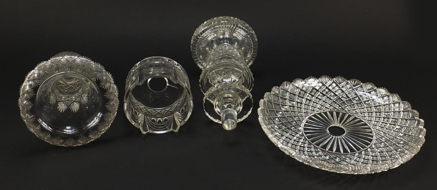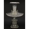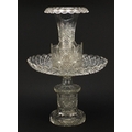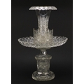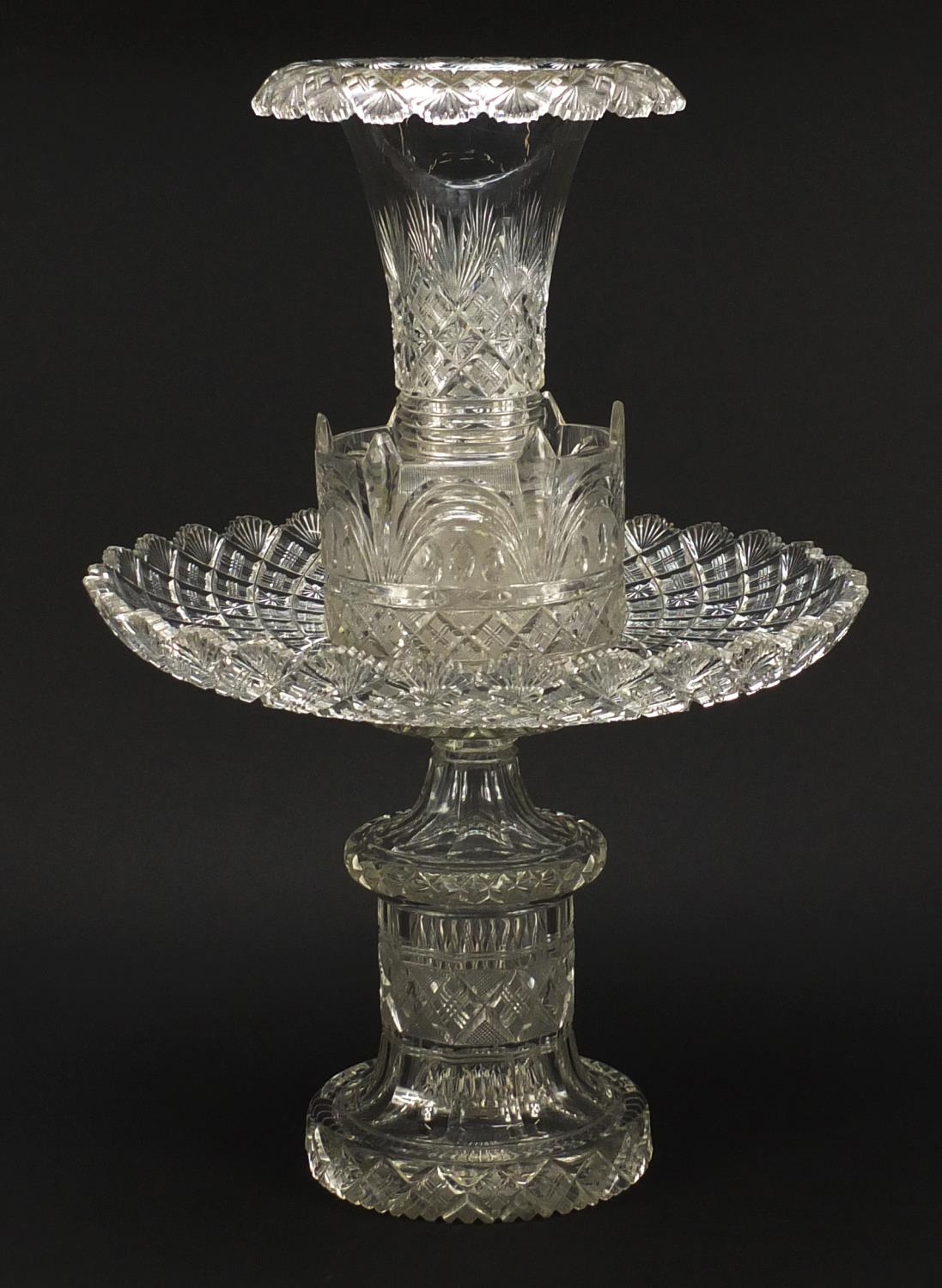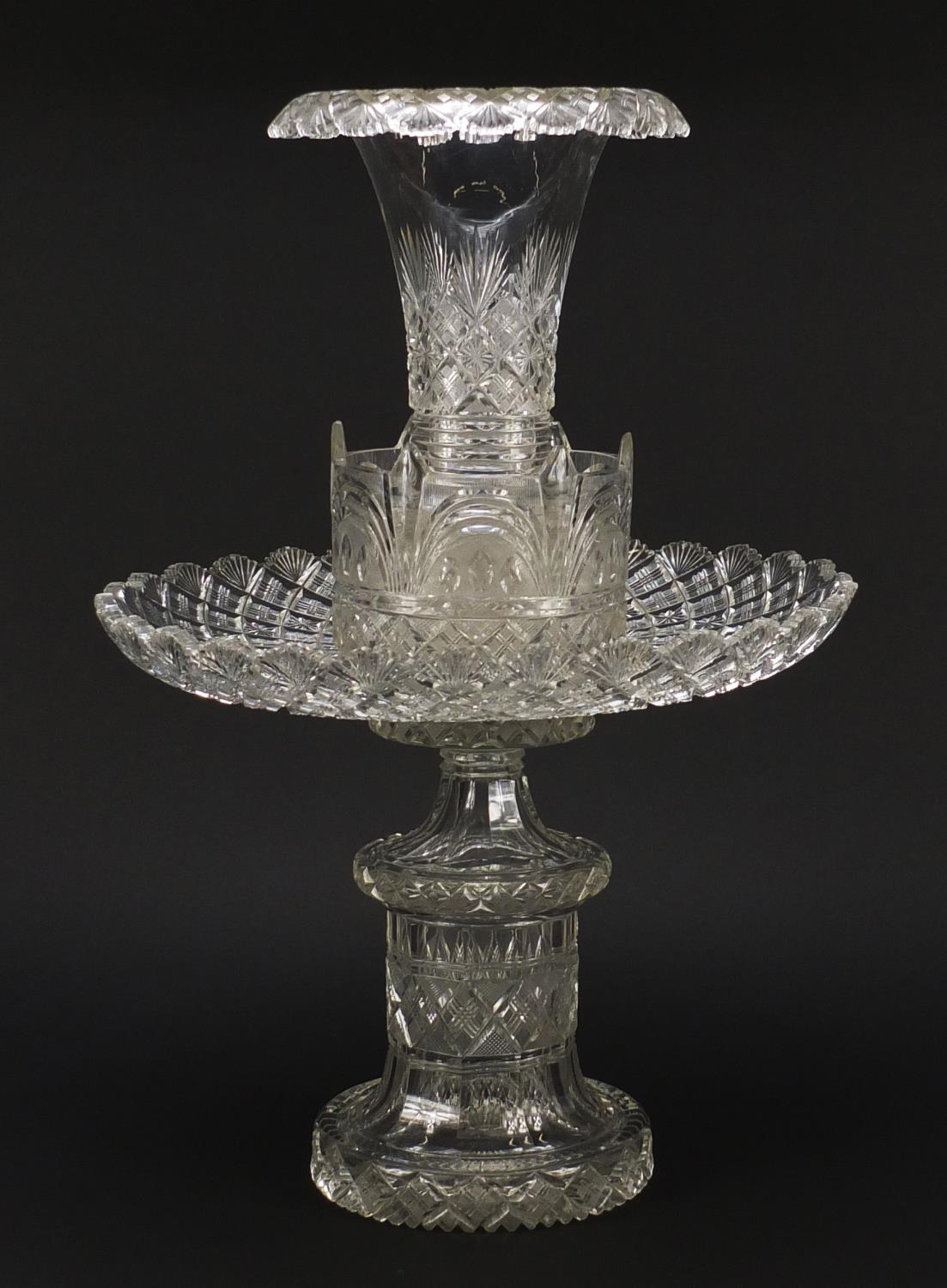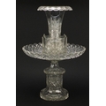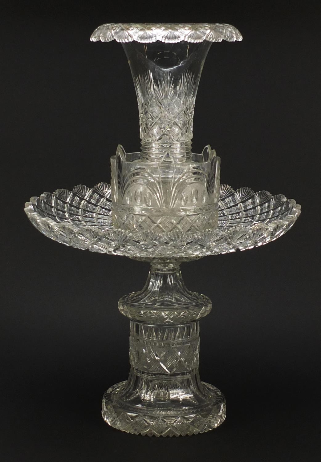 Good large 19th century cut glass table centrepiece, possibly Irish, of four sections with trumpet vase above a shallow dish, on stand, 50cm high