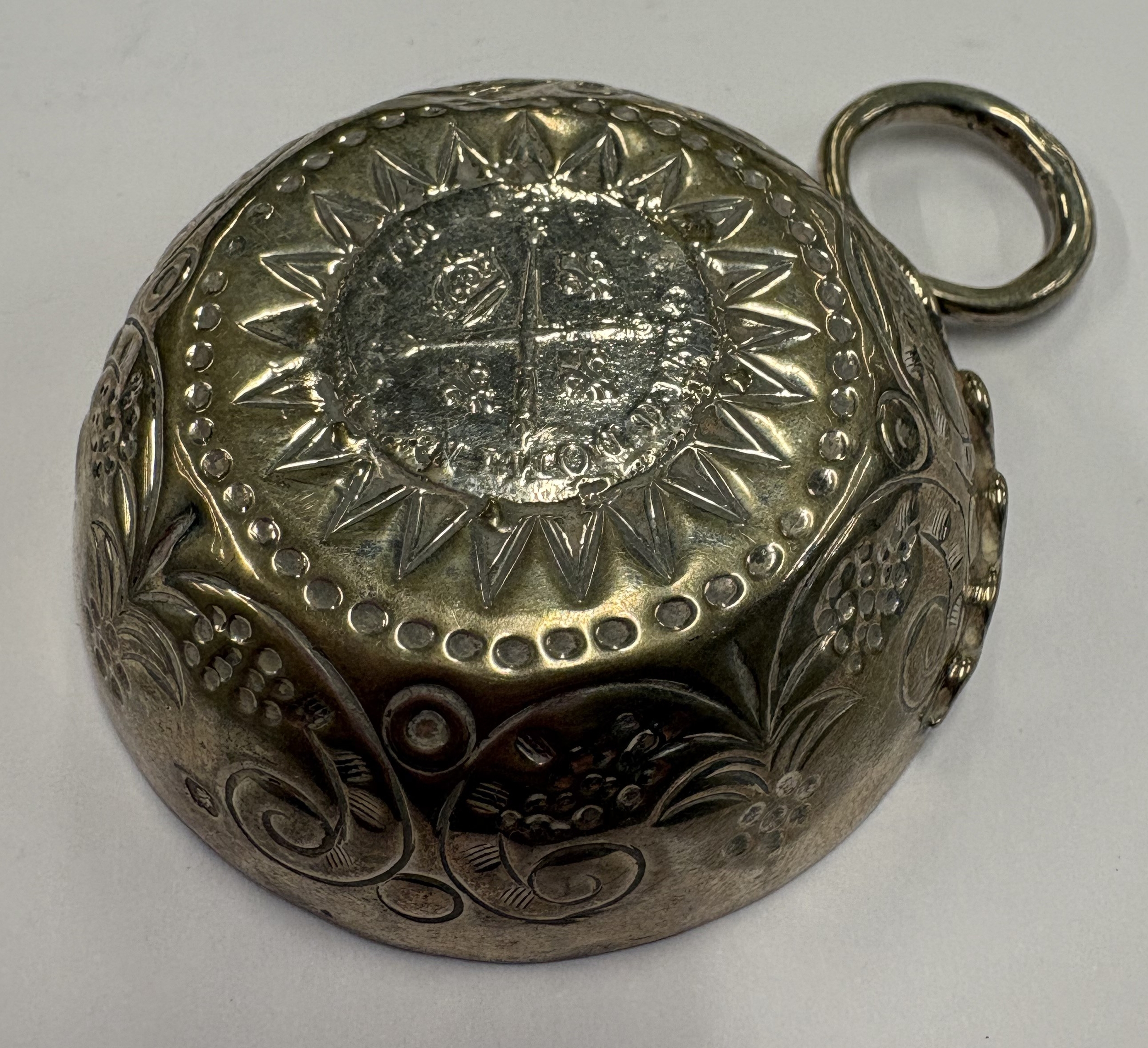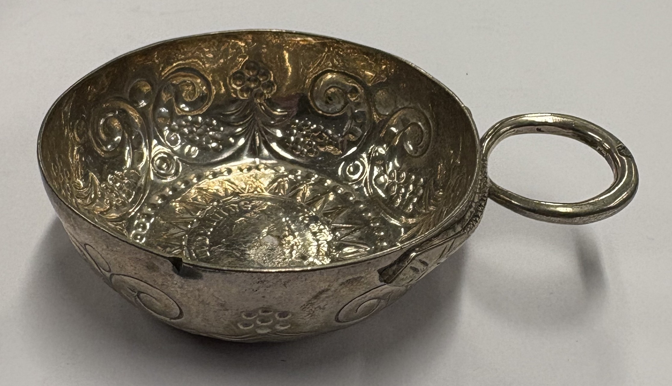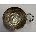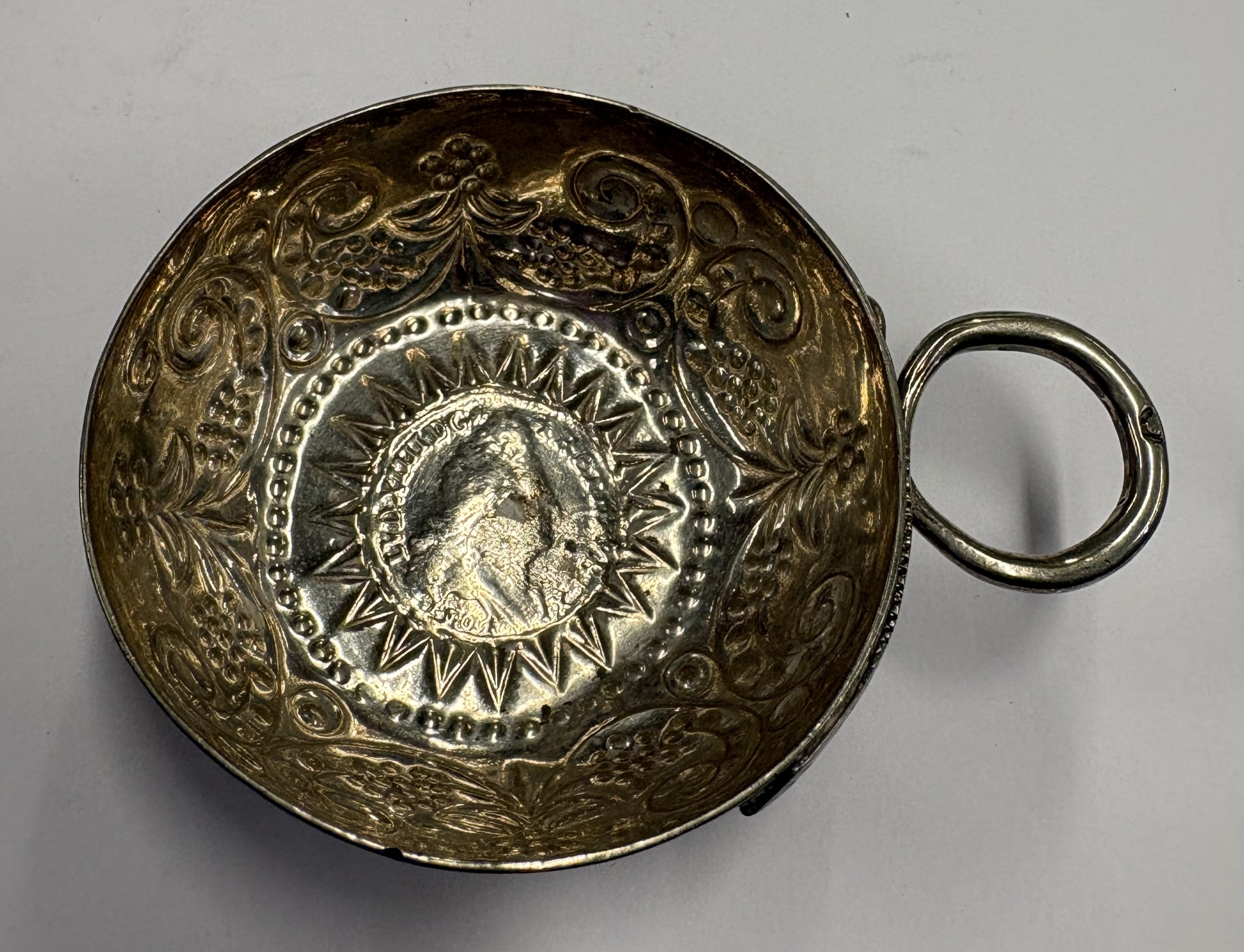 A 19th Century French silver wine taster inset with coin to centre, marked to handle. Approx. 28 grams. Est. £100 - £150.