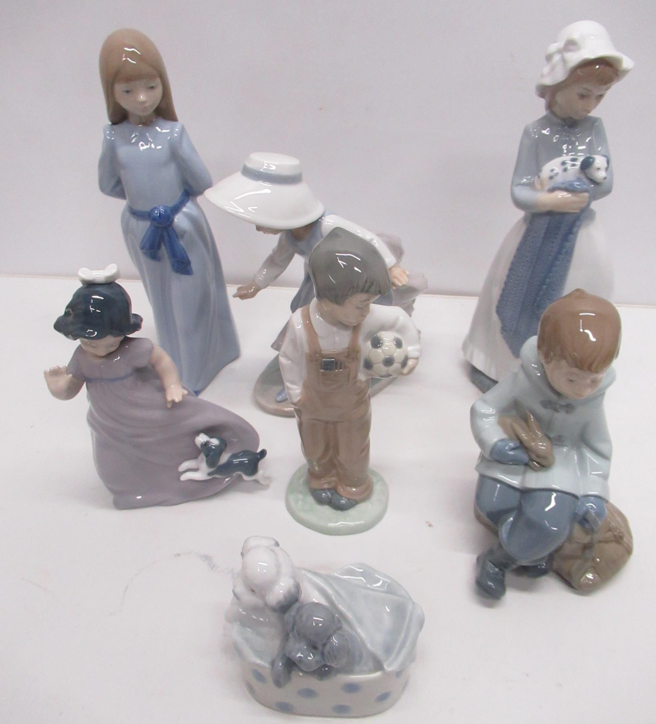Collection of Nao figures, mostly children including girl with puppy, boy with football, boy with rabbit, two poodles in a basket, etc
