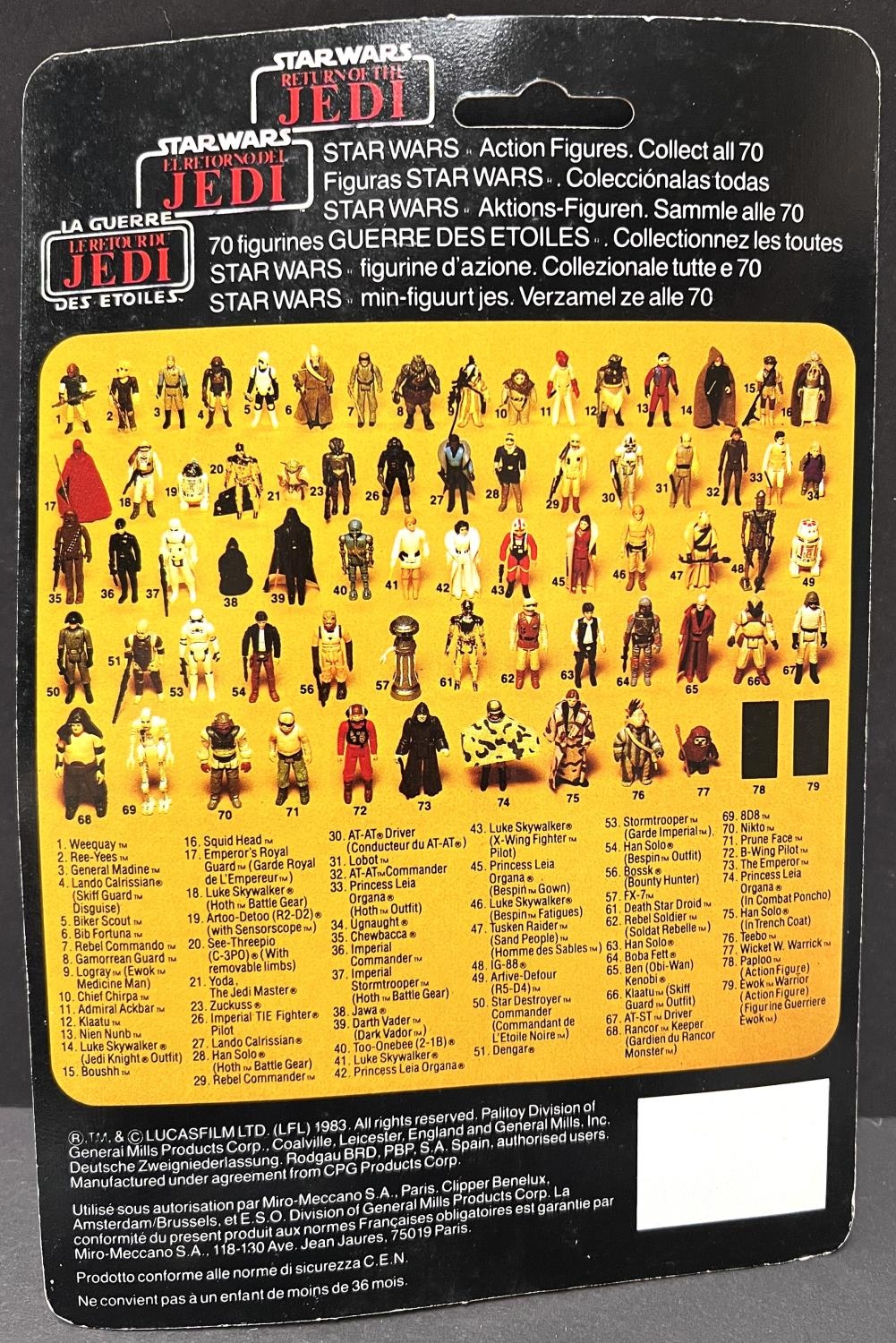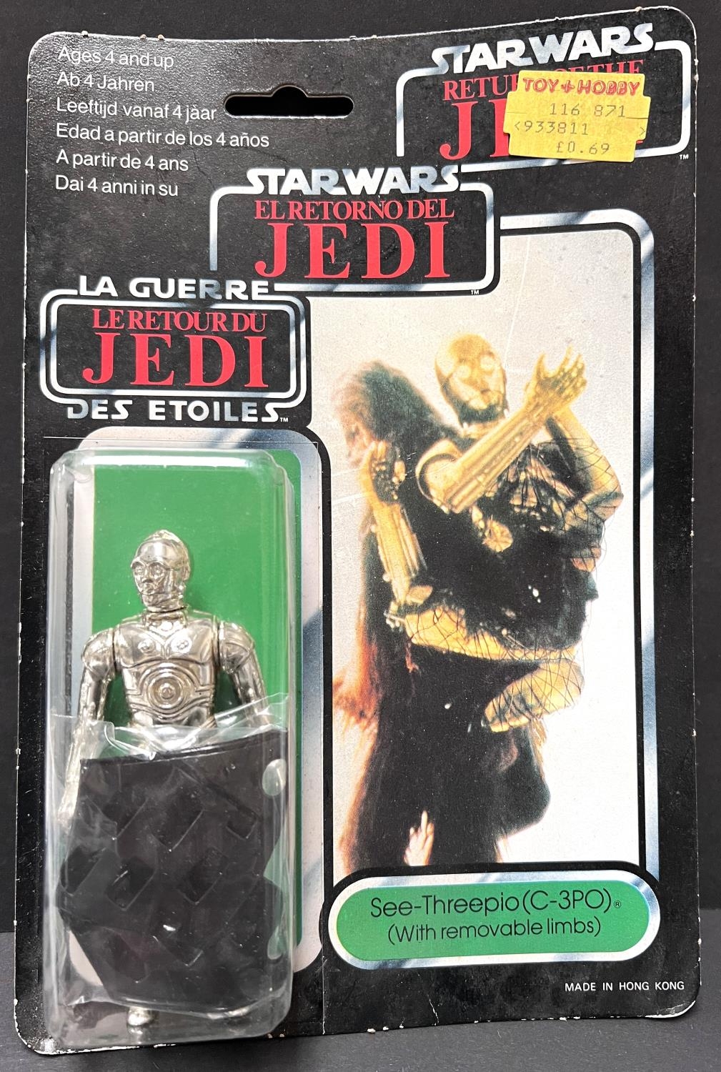A Palitoy General Mills Return of the Jedi figure on 70 card: Tri-Logo See-Threepio, C-3PO, with removable limbs, 3.75", blister pack with Toy & Hobby sticker top right, punched
