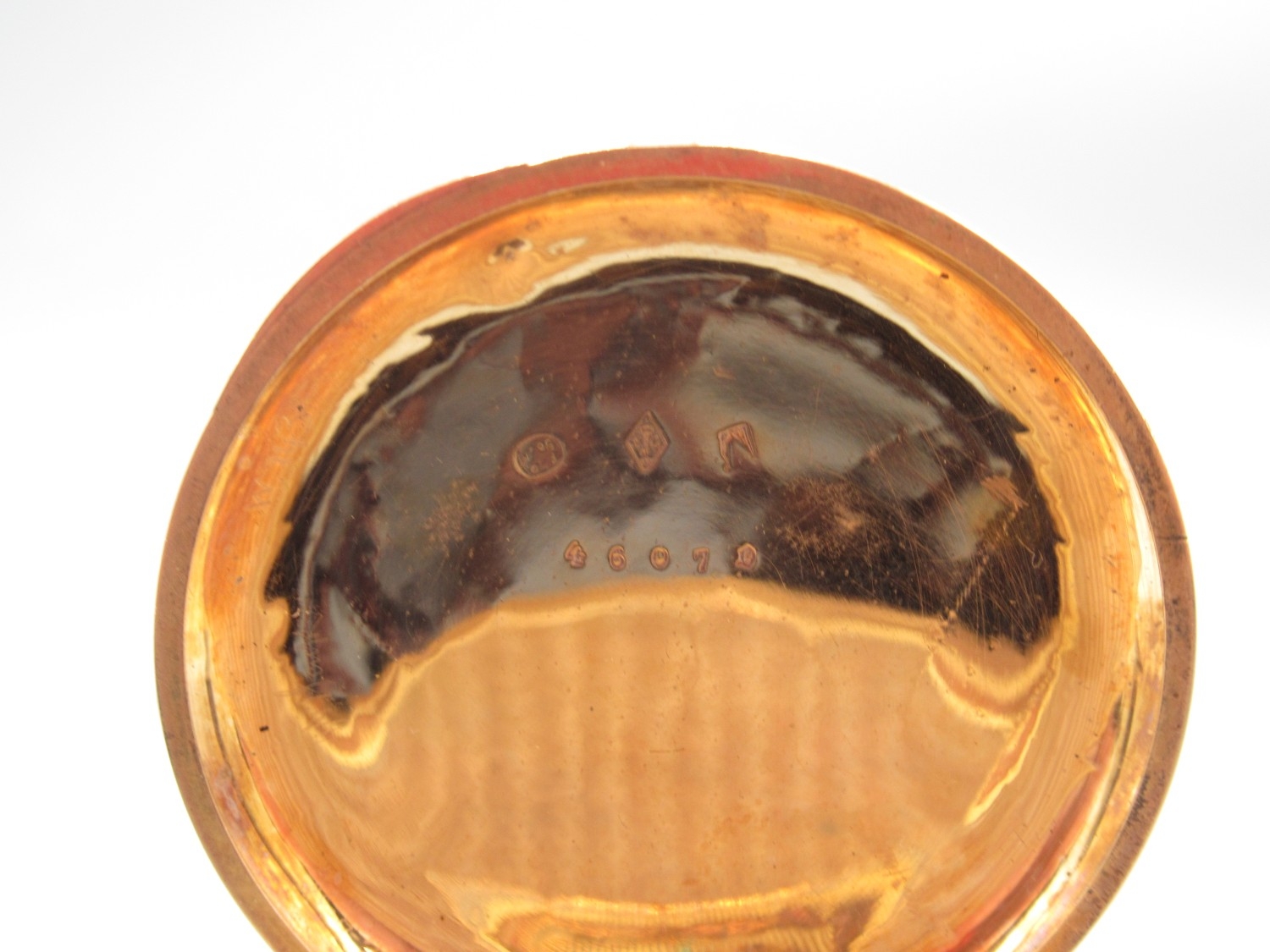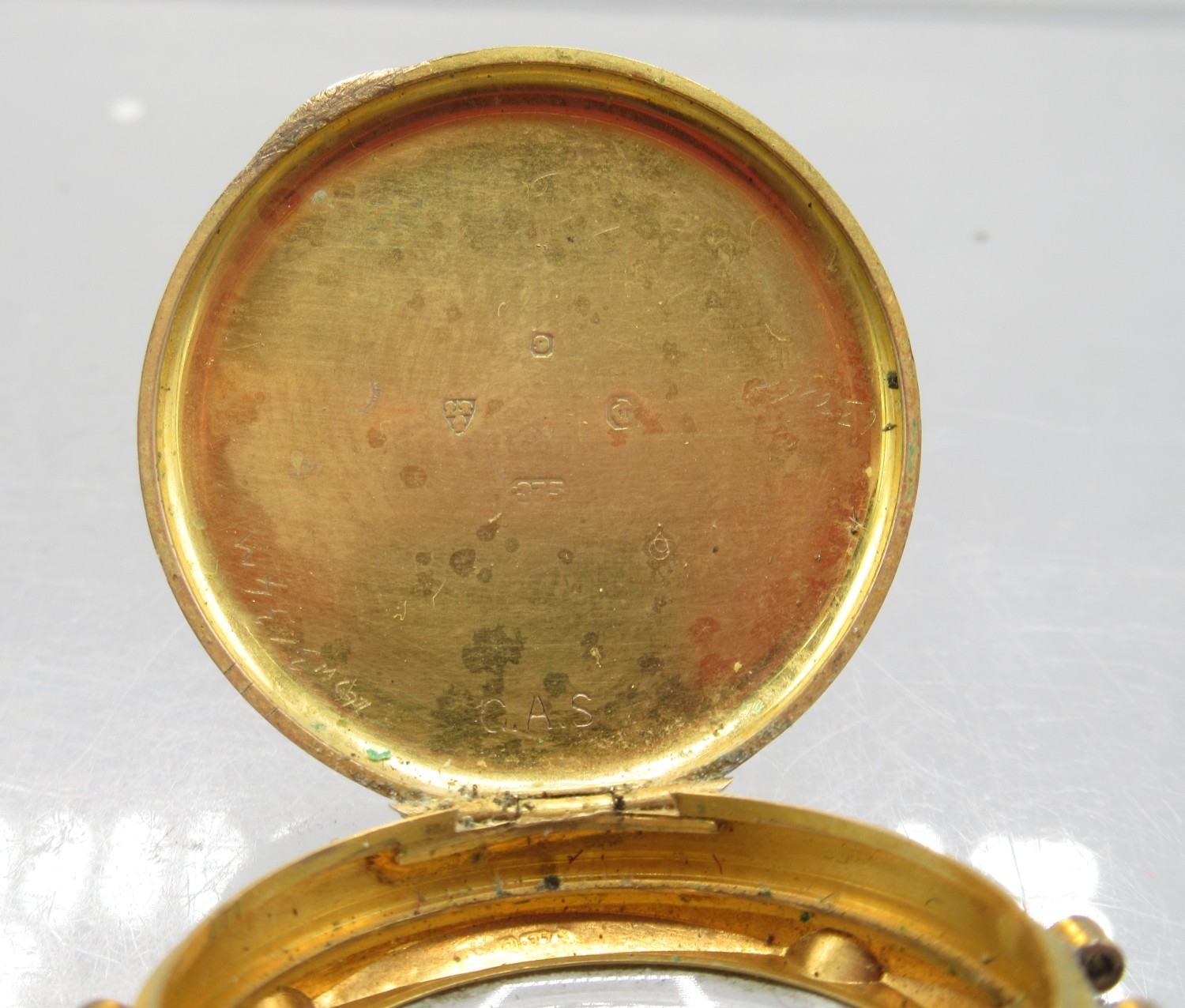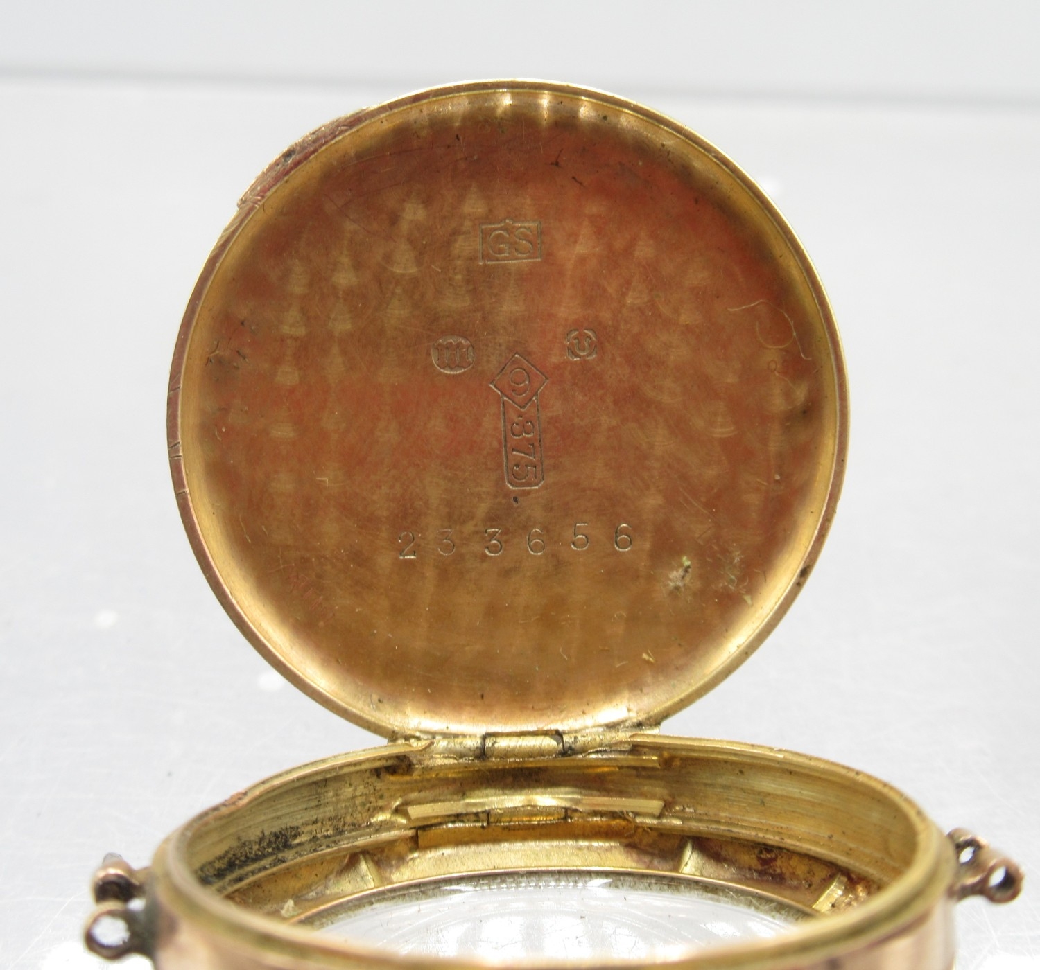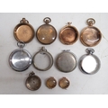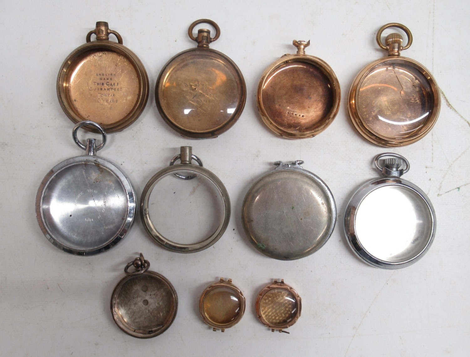 9ct rose gold wristwatch case, no. 233656, London Import Mark 1927, gross weight 3g, D25.6mm; 9ct gold wristwatch case, Chester 1928, gross weight 3.2g, D23.6mm and gold coloured metal pocket watch case, no. 46070, D46.8mm and other pocket watch cases