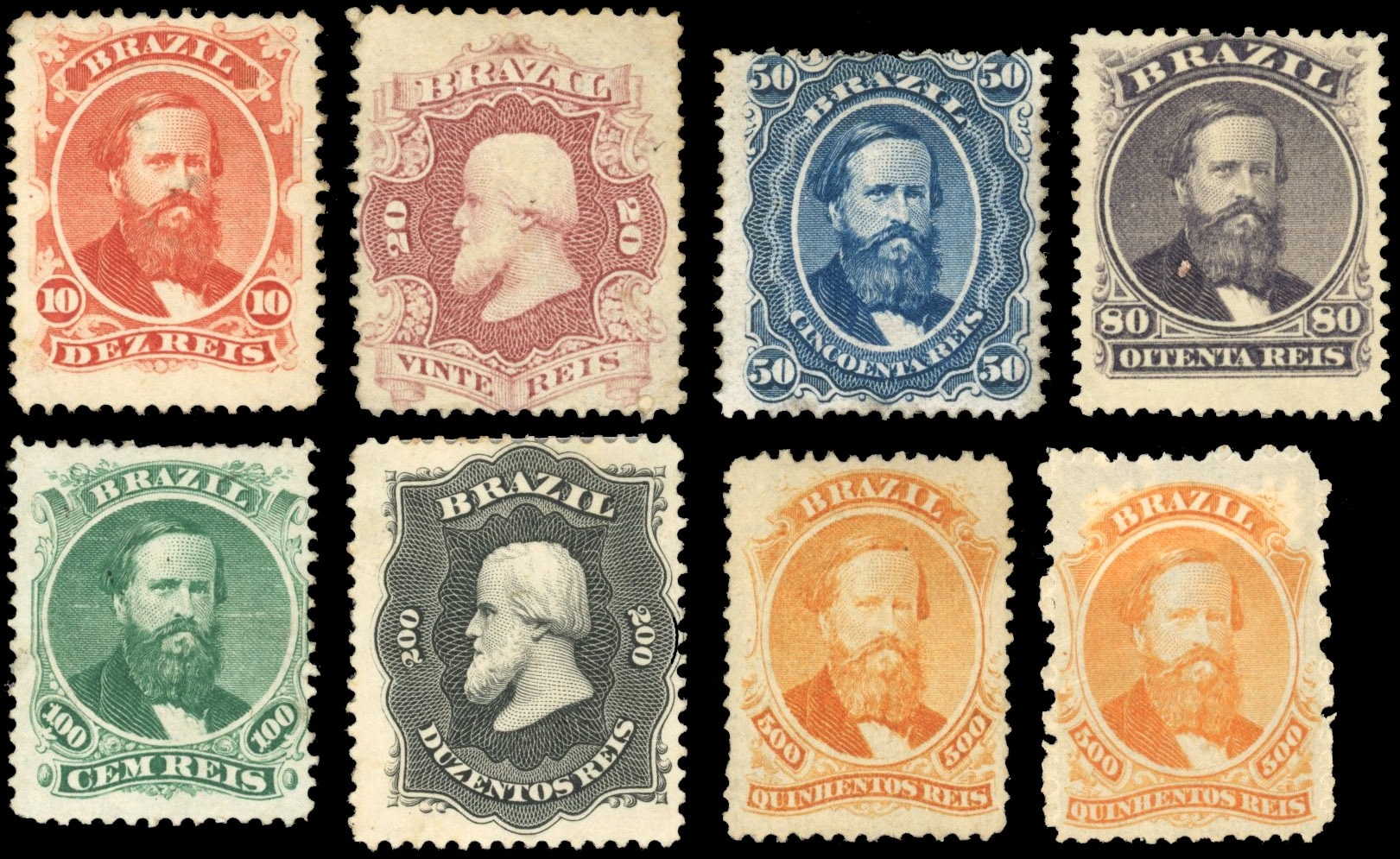 Don Pedro: 1866-68 set of seven values part to large part o.g. with two 500r, one roughly perforated