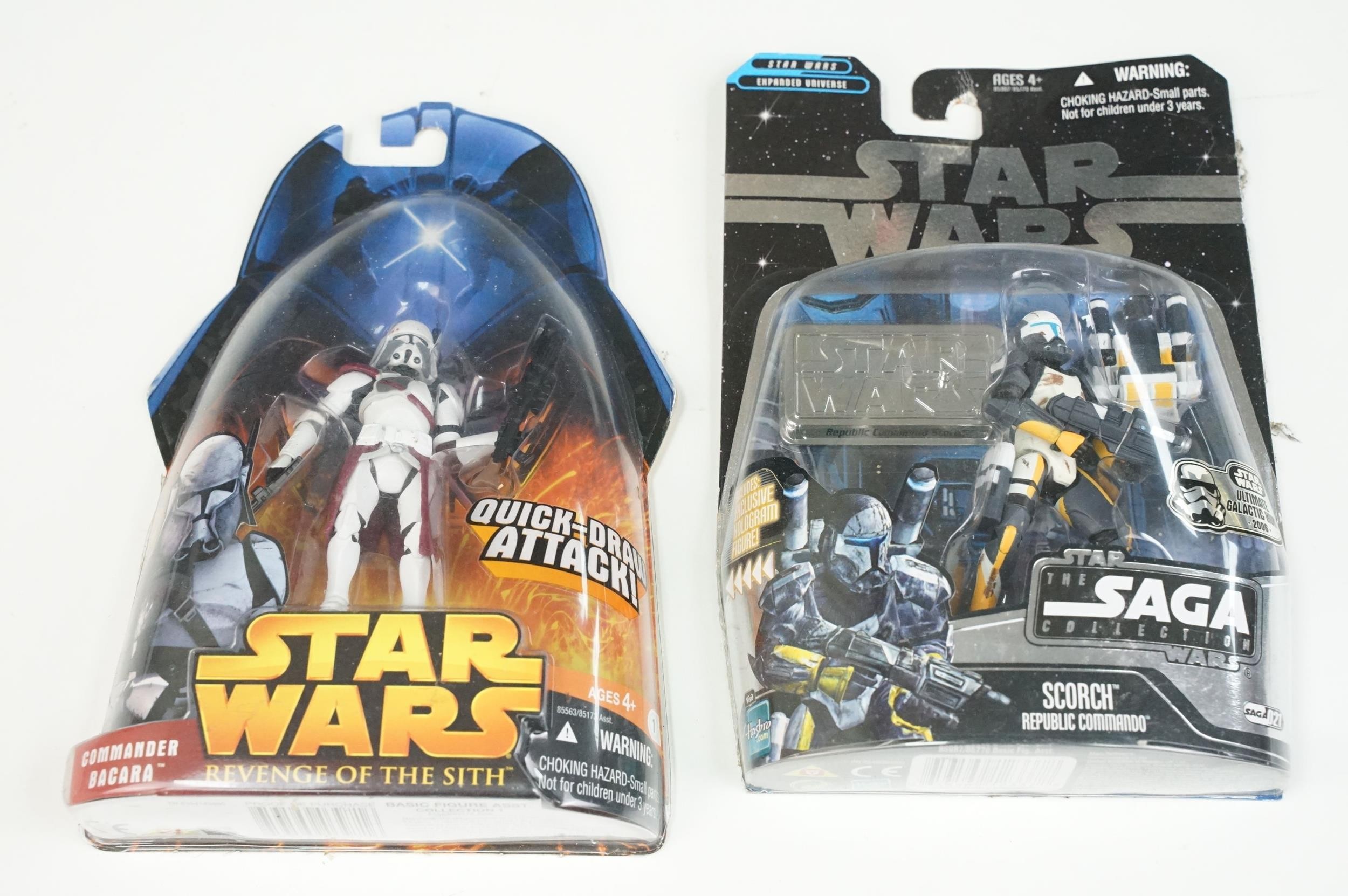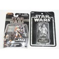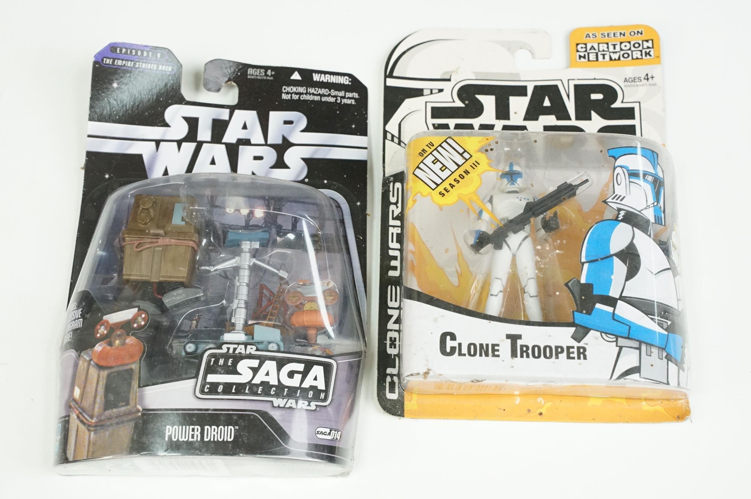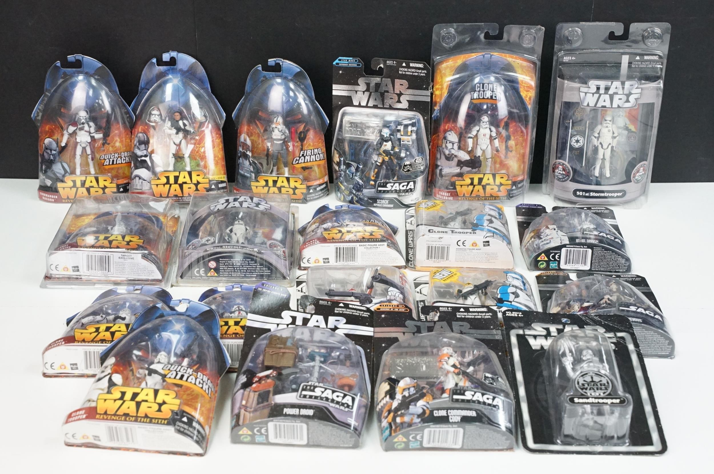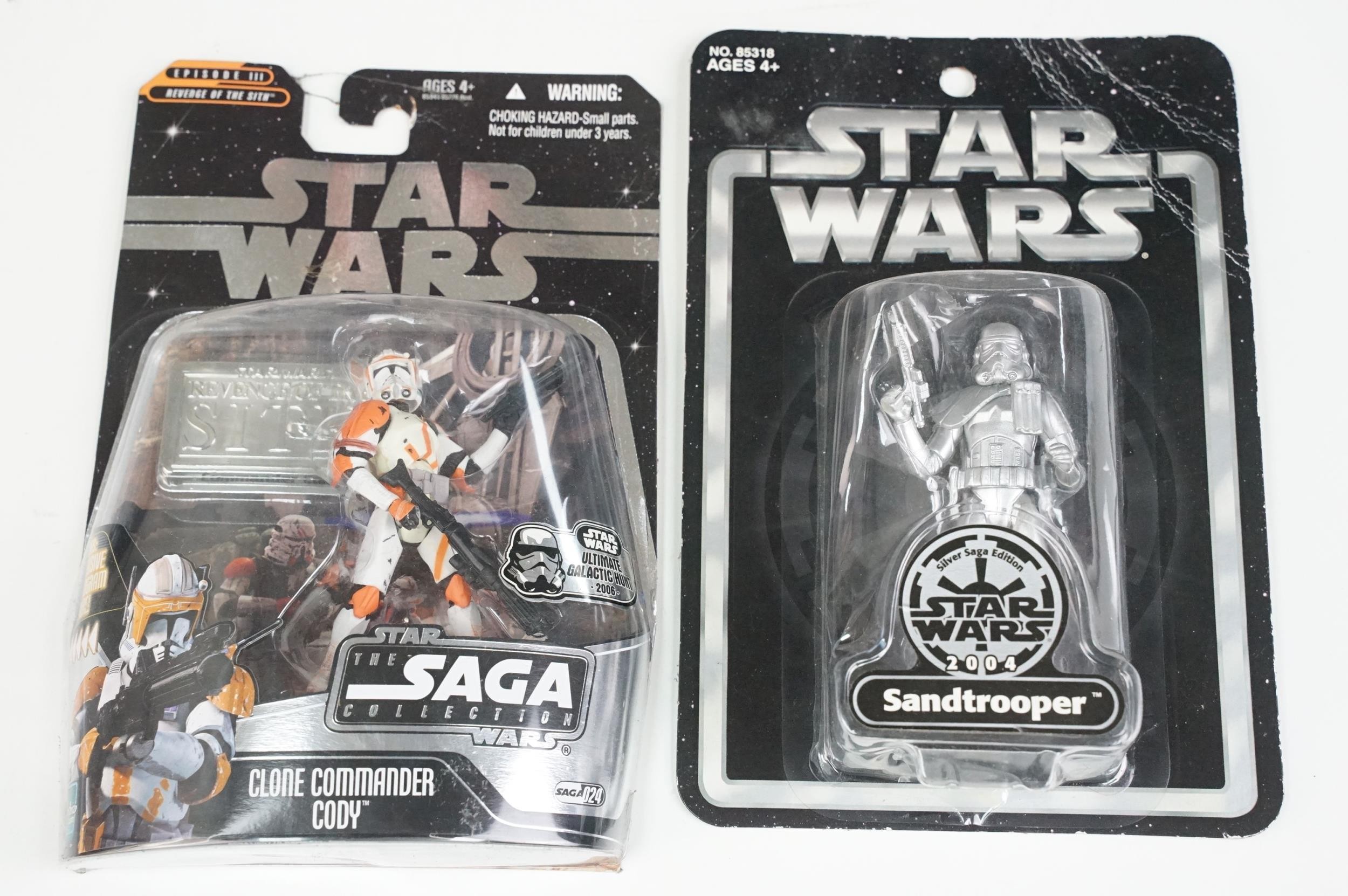 Star Wars - 20 Carded Star Wars figures featuring The Saga Collection Power Droid, Silver Saga 2004 Sandtrooper, Comic-Con Exclusive San Diego 2006 501st Stormtrooper, Ultimate Galactic Hunt 2006 Clone Commander Cody, Ultimate Galactic Hunt 2006 Scorch Republic Commando, Target Exclusive Revenge Of The Sith Clone Trooper, Revenge Of The Sith Commander Bacara, etc, gd to vg overall